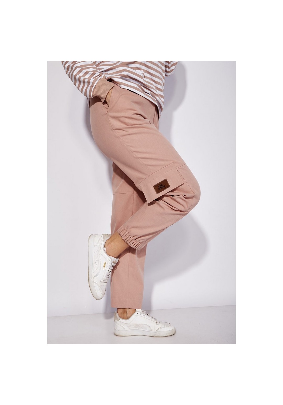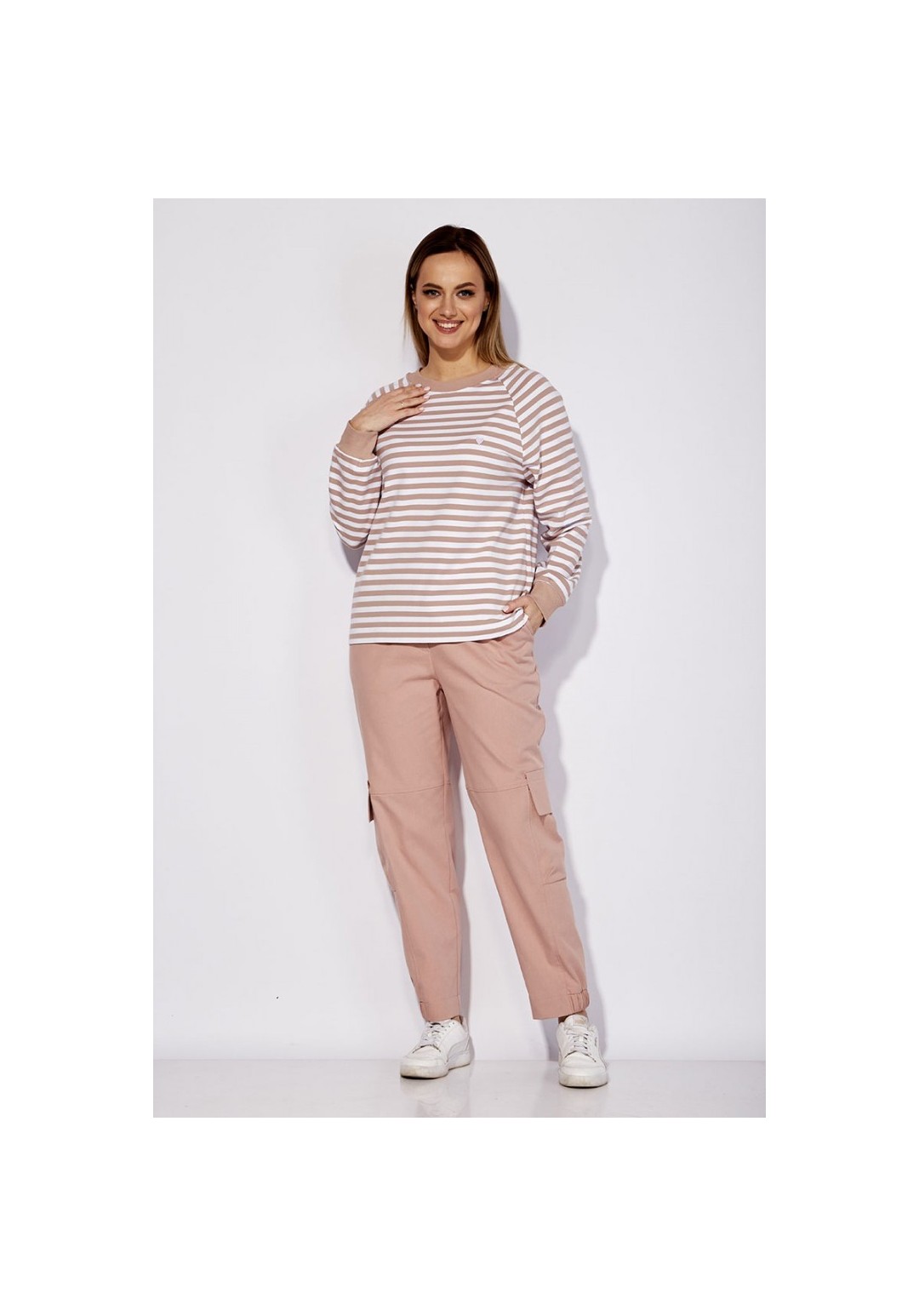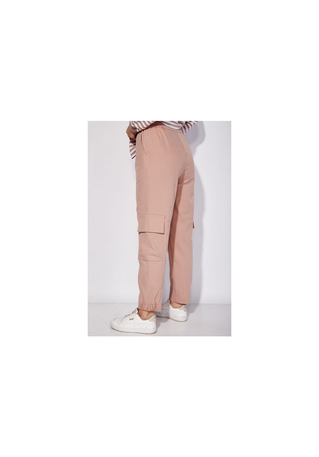 Брюки карго, прямого силуэта, по низу частично на резинке. По переду наклонные карманы. Выше колена горизонтальный подрез и в нижней части вертикальные рельефы с отделочными строчками. По бокам карманы с клапанами и декоративной нашивкой. Застежка спереди на молнию Пояс притачной, с резинками по бокам и шлевками. Застежка пояса спереди на петлю и пуговицу.