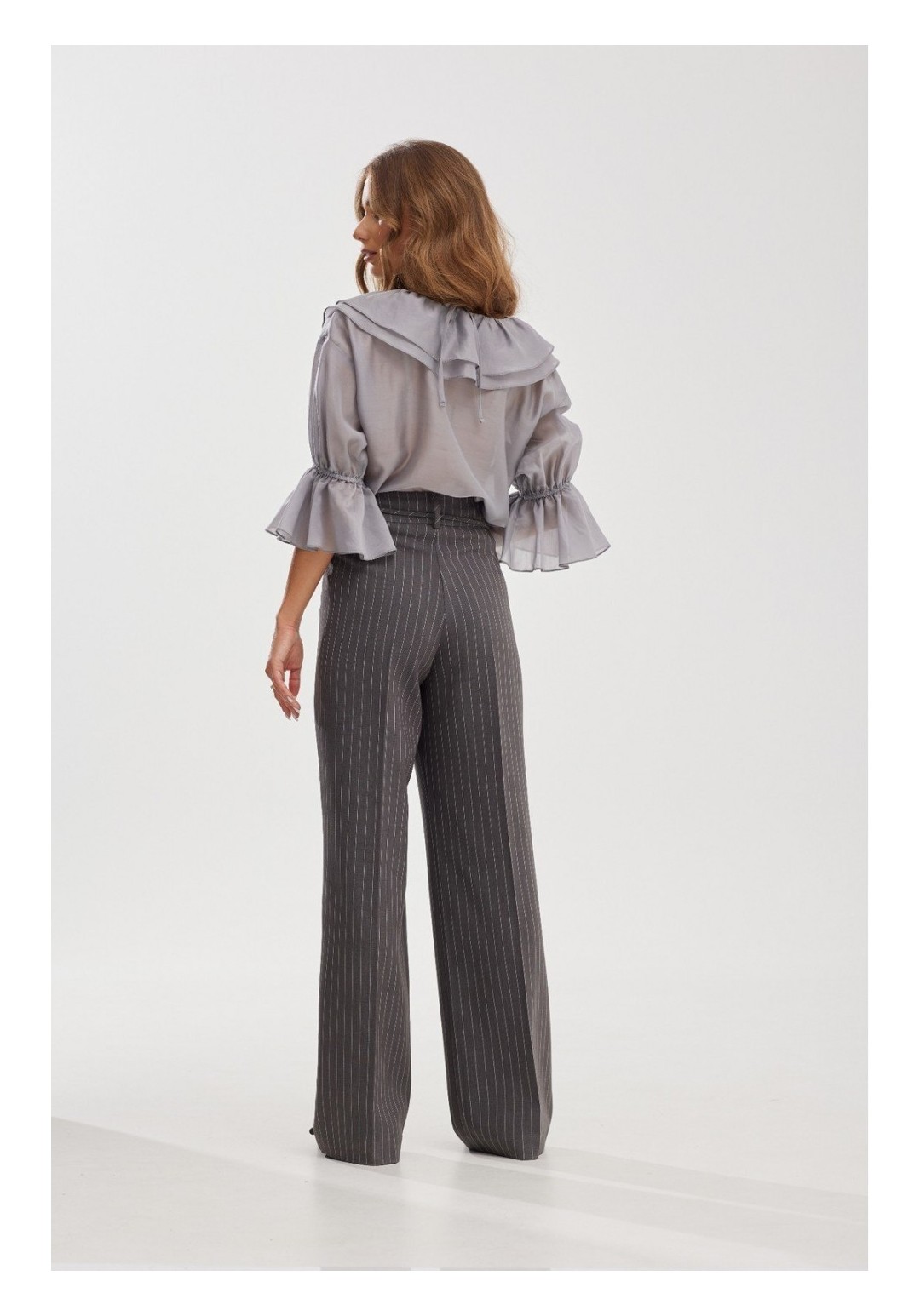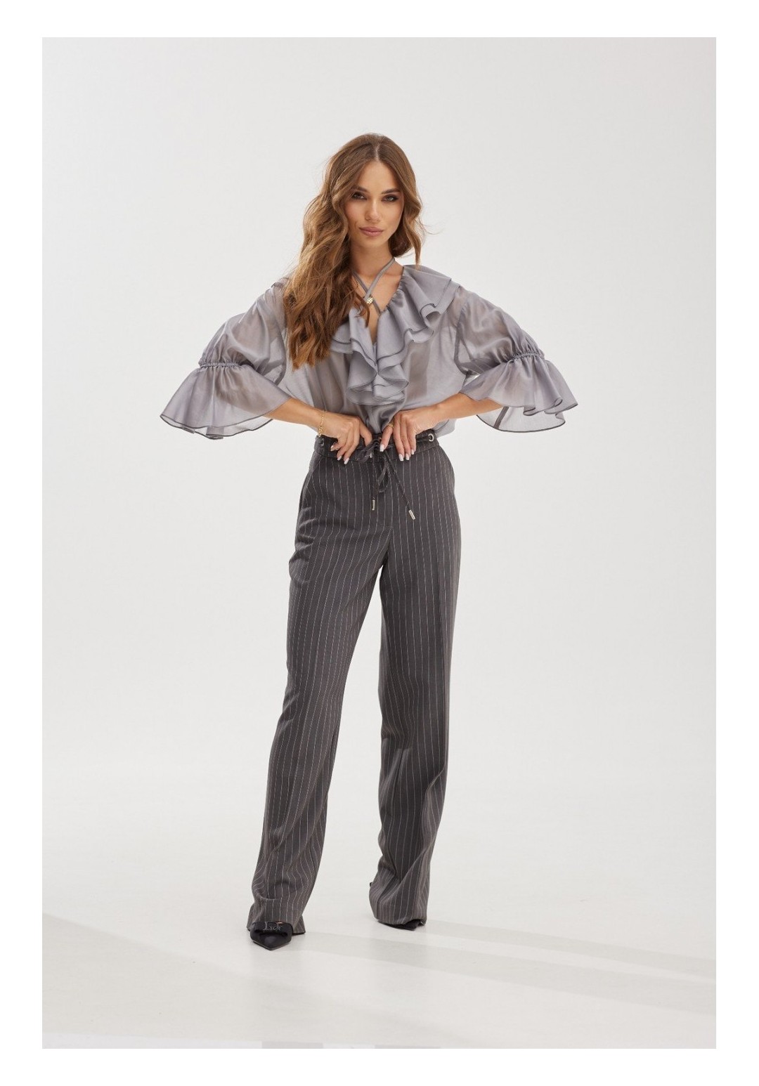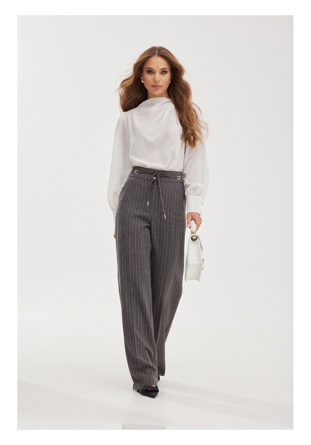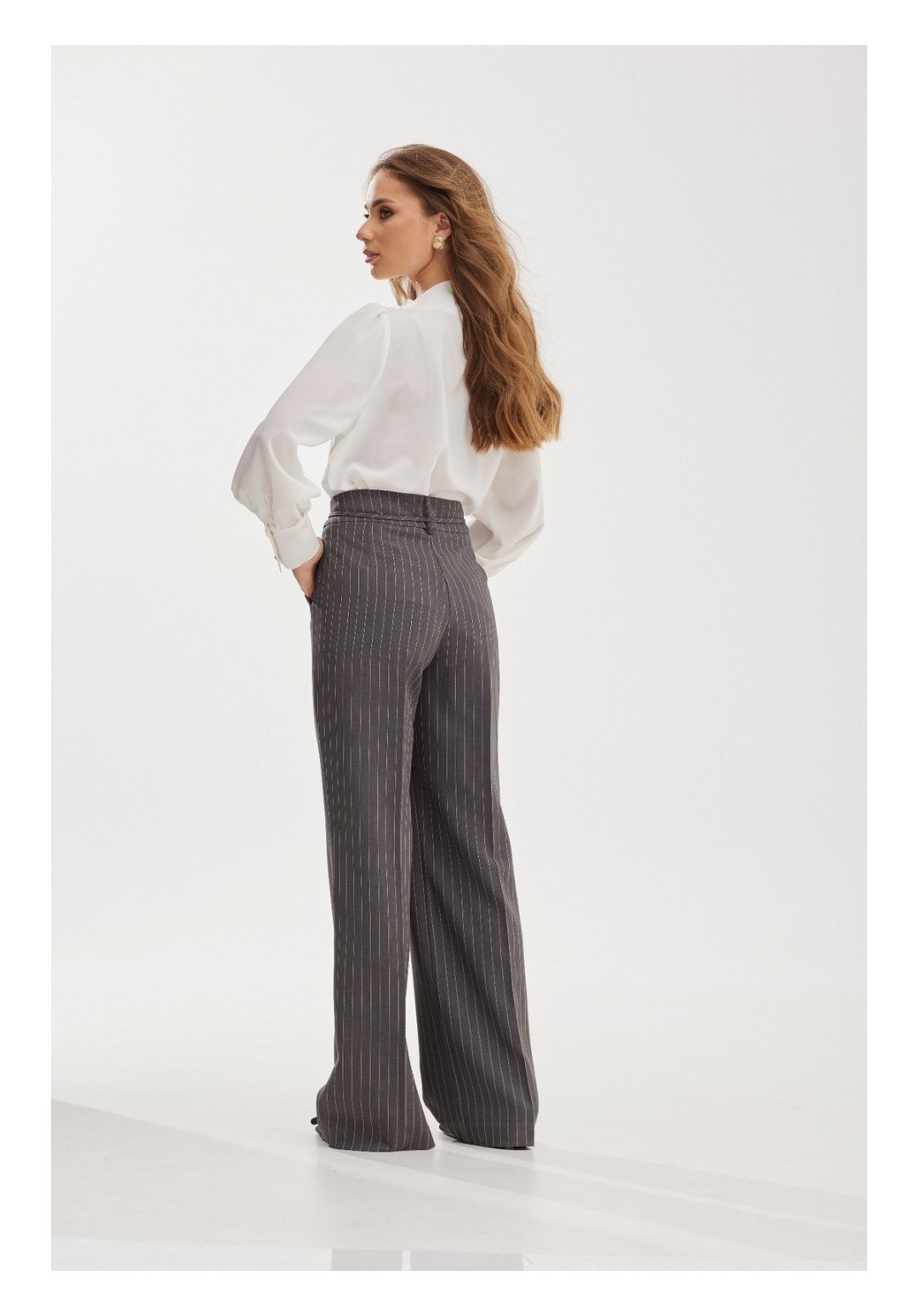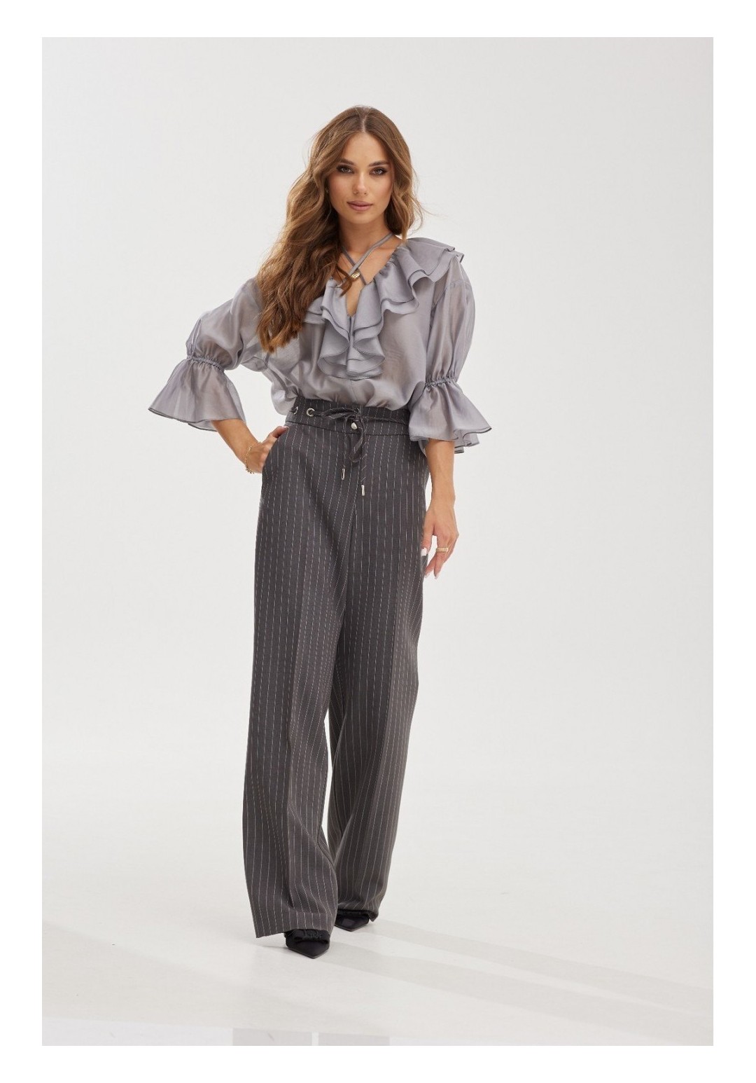 Брюки классические из костюмной ткани. По верху брюк пояс-кокетка. Застежка по переду на молнию и кнопки на поясе. В боковых швах карманы. На поясе переда декоративные люверсы. Талия фиксируется съемным поясом-завязкой.