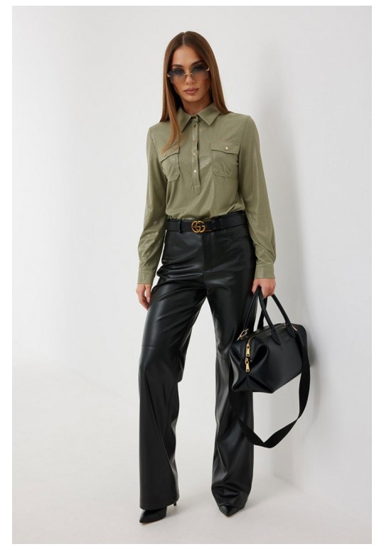 Брюки прямого силуэта из экокожи. Застёжка по переду на молнию и кнопку на поясе. Пояс притачной со шлёвками. По переду боковые карманы. Сзади накладные карманы. На брюках выполнен декоративный подрез. 44 р-р: ОТ - 76 см., ОБ - 96 см. 46 р-р: ОТ - 80 см., ОБ - 100 см. 48 р-р: ОТ - 84 см., ОБ - 104 см. 50 р-р: ОТ - 88 см., ОБ - 108 см. 52 р-р: ОТ - 92 см., ОБ - 112 см.