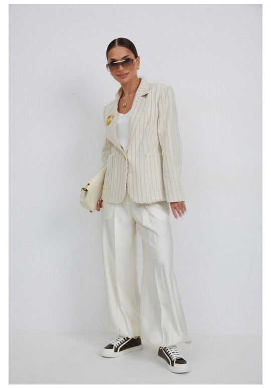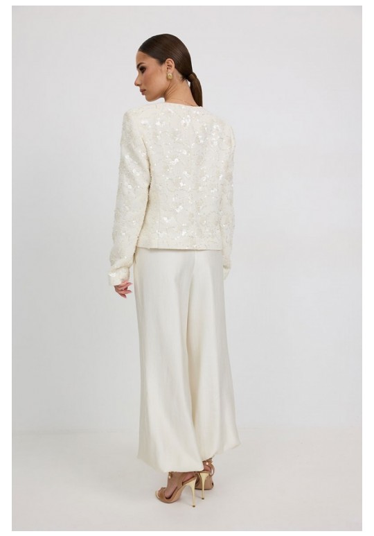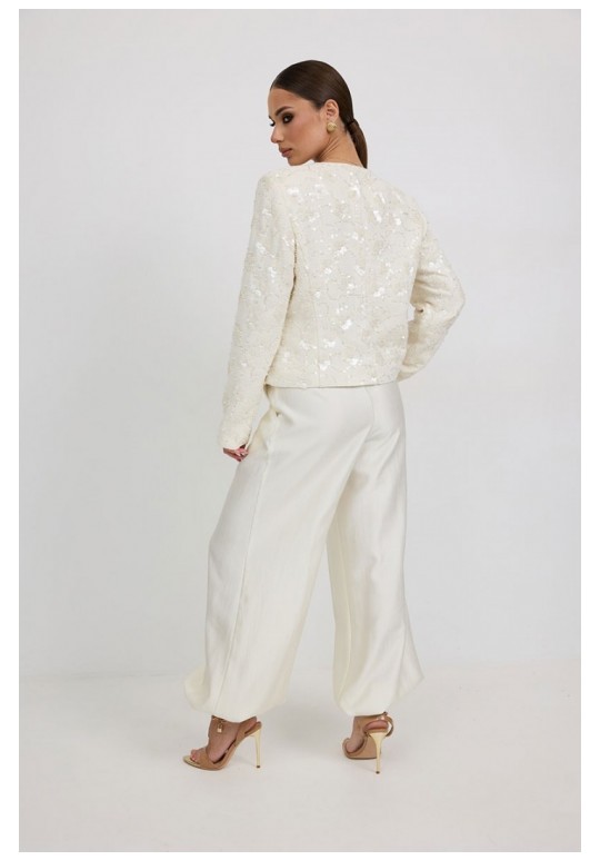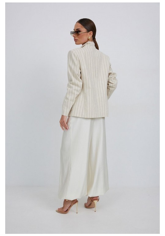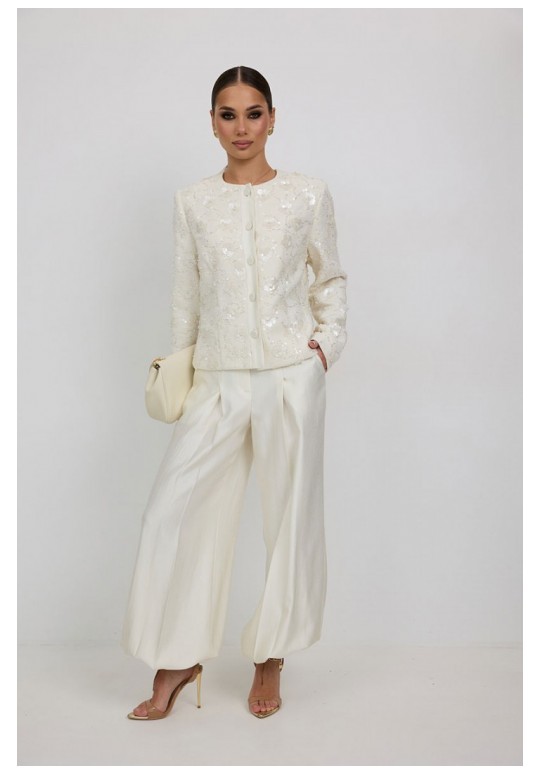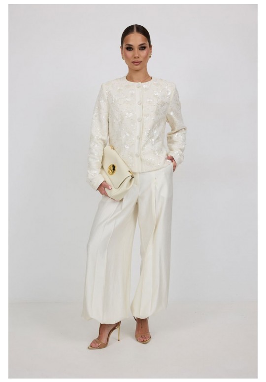 Брюки женские из костюмной ткани с деликатным мерцанием, имеют актуальный крой - брюки-алладины, собранные на резинку по низу, высокая посадка, пояс притачной со шлевками под ремень, застежка спереди на молнию и пуговицу, боковые карманы в швах, по переду глубокие заутюженные складки, дающие дополнительный объём внизу. 44 р-р: ОТ (в застегнутом виде) - 75 см., ОБ (с учетом складок) - 100 см. 46 р-р: ОТ (в застегнутом виде)- 79 см., ОБ (с учетом складок) - 104 см. 48 р-р: ОТ (в застегнутом виде)- 83 см., ОБ (с учетом складок) - 108 см. 50 р-р: ОТ (в застегнутом виде)- 87 см., ОБ (с учетом складок) - 112 см. 52 р-р: ОТ (в застегнутом виде)- 91 см., ОБ (с учетом складок) - 116 см.