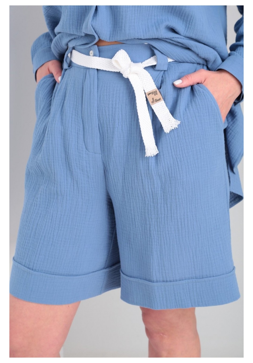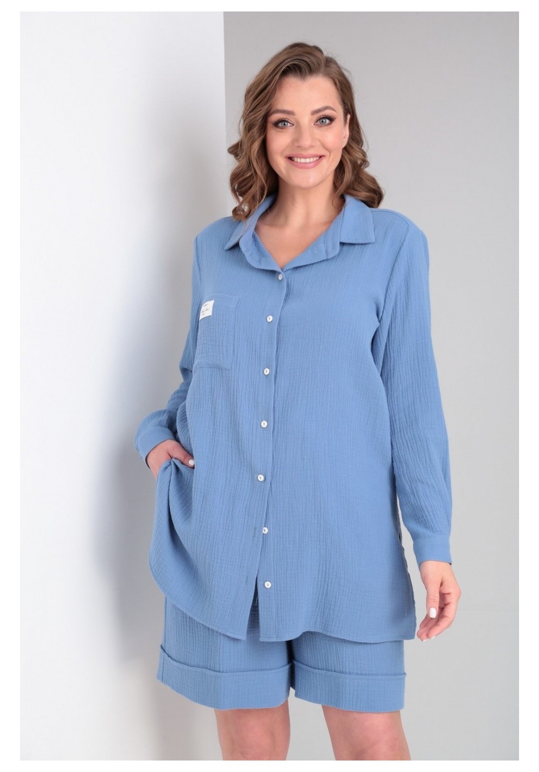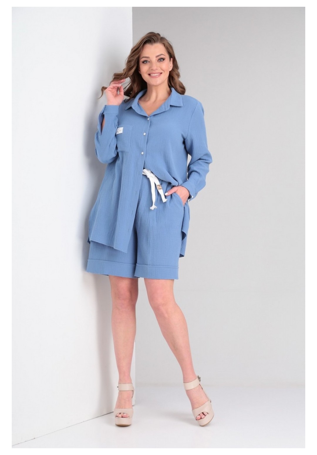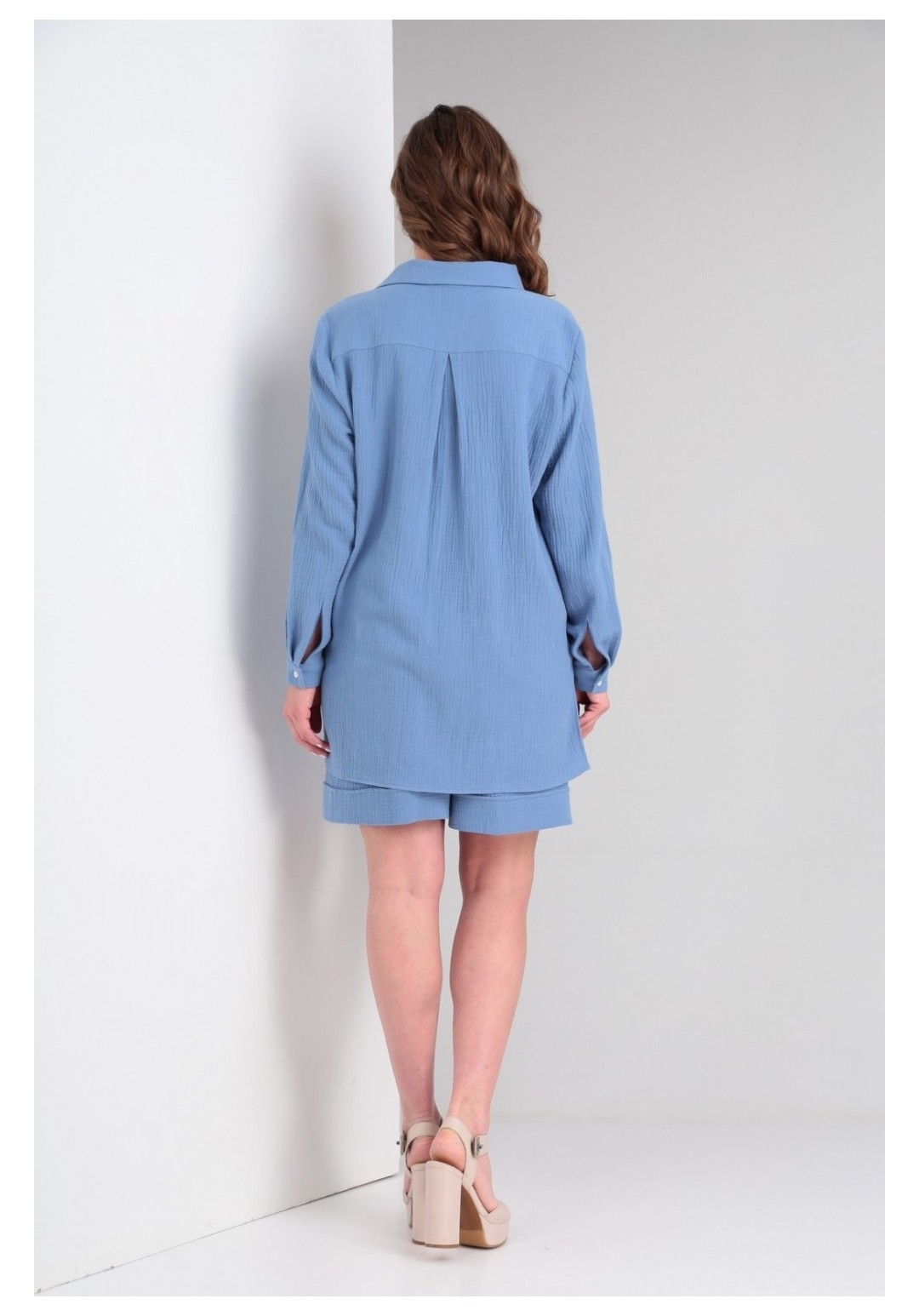 Костюм женский с шортами:блуза прямого силуэта с центральной застёжкой на петли и пуговицы. По переду накладной карман. По спинке кокетка и складка по шву притачивания нижней части к кокетке. Рукав втачной одношовный с притачным манжетом с застёжкой на петлю и пуговицу, по шву притачивания рукава к манжету заложены складки. Воротник стояче-отложной с отрезной стойкой. Шорты прямые, по низу манжеты, в боковых швах обработаны карманы. Верхний срез обработан поясом с резинкой. Застёжка на тесьму-молнию петлю и пуговицу. В качестве отделки используется фурнитура. Длина 80 см. , длина рукава 59 см.,длина шорт 54 см.