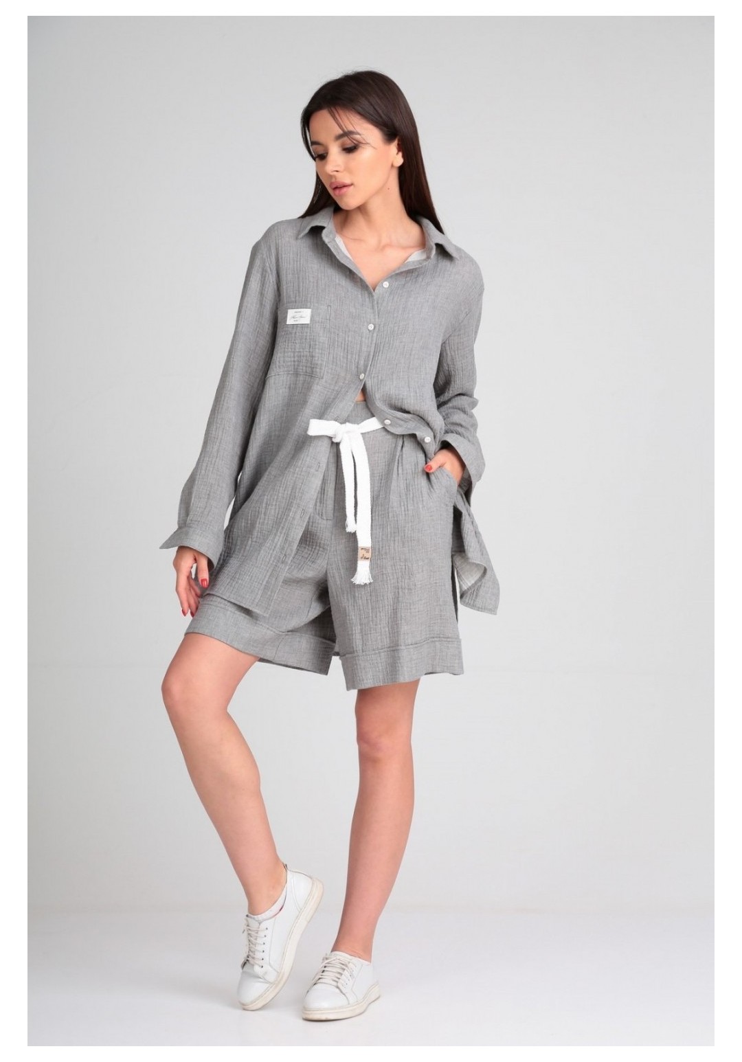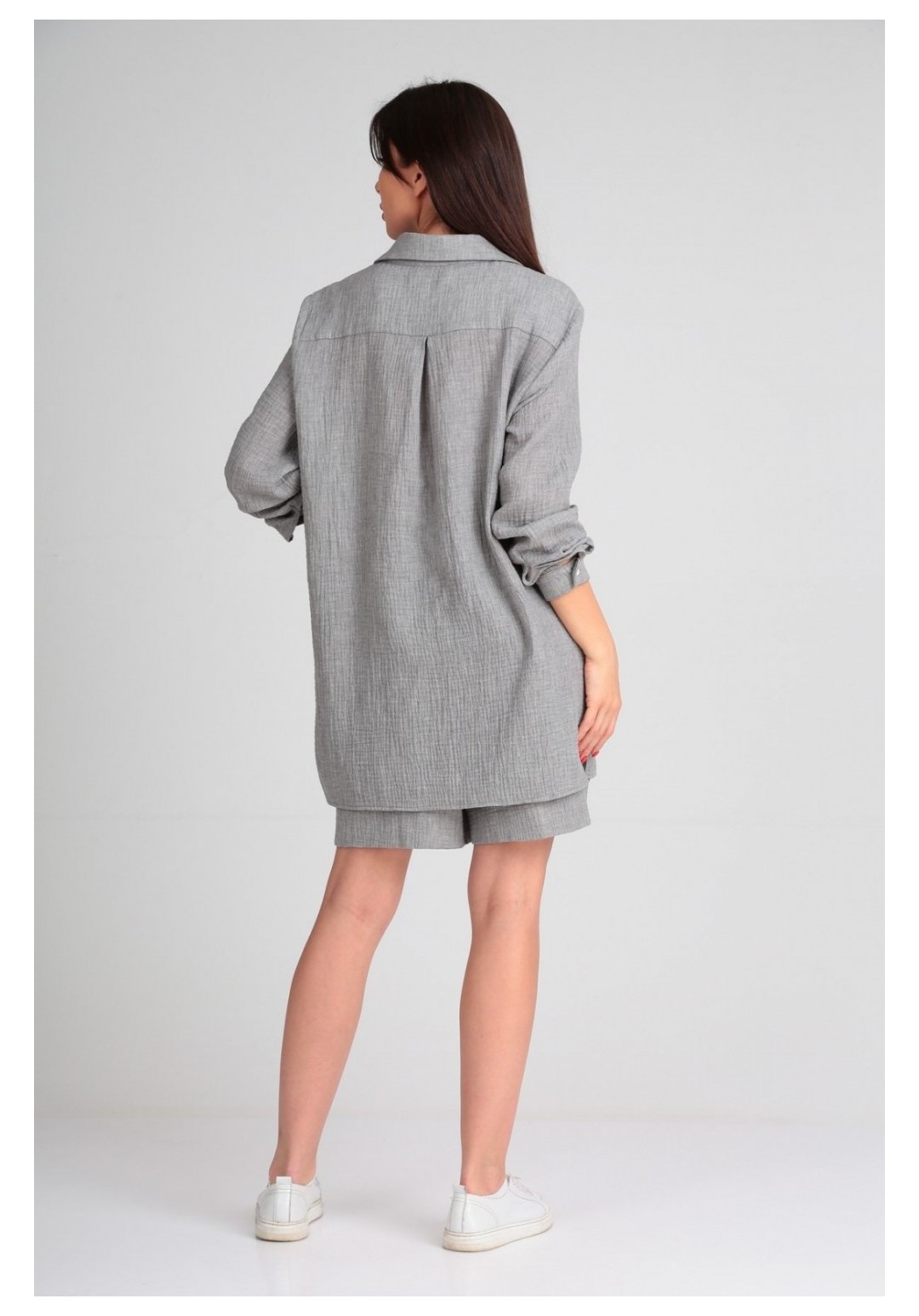 Костюм женский с шортами:блуза прямого силуэта с центральной застёжкой на петли и пуговицы. По переду накладной карман. По спинке кокетка и складка по шву притачивания нижней части к кокетке. Рукав втачной одношовный с притачным манжетом с застёжкой на петлю и пуговицу, по шву притачивания рукава к манжету заложены складки. Воротник стояче-отложной с отрезной стойкой. Шорты прямые, по низу манжеты, в боковых швах обработаны карманы. Верхний срез обработан поясом с резинкой. Застёжка на тесьму-молнию петлю и пуговицу. В качестве отделки используется фурнитура. Длина 80 см. , длина рукава 59 см.,длина шорт 54 см.