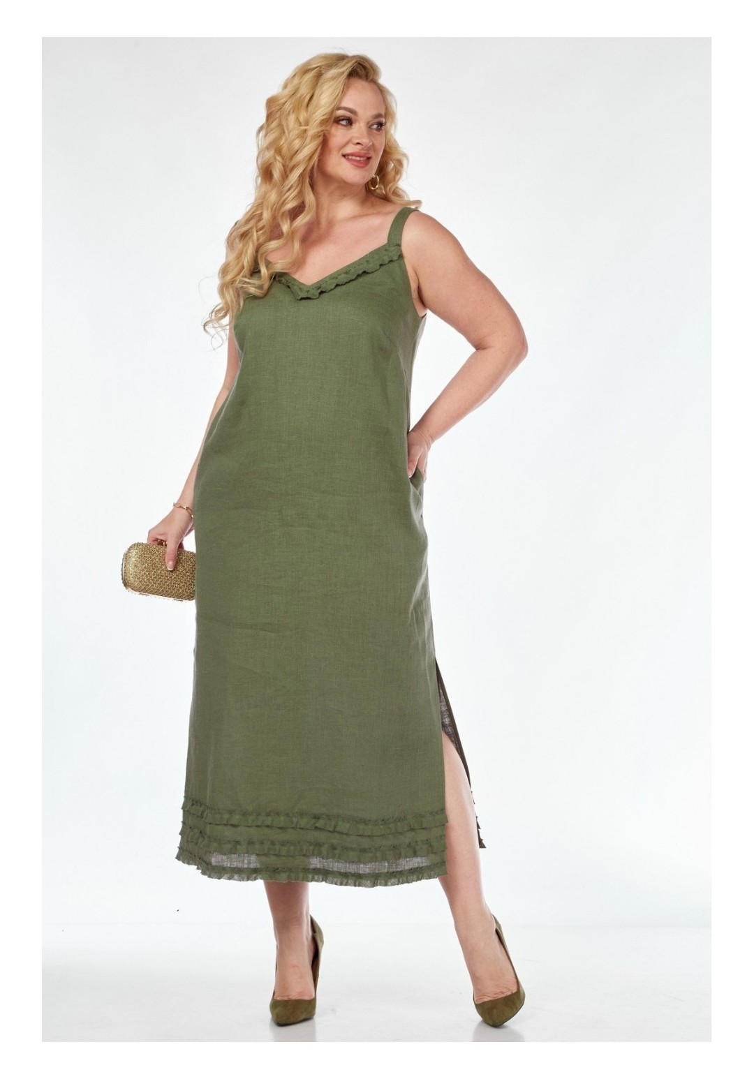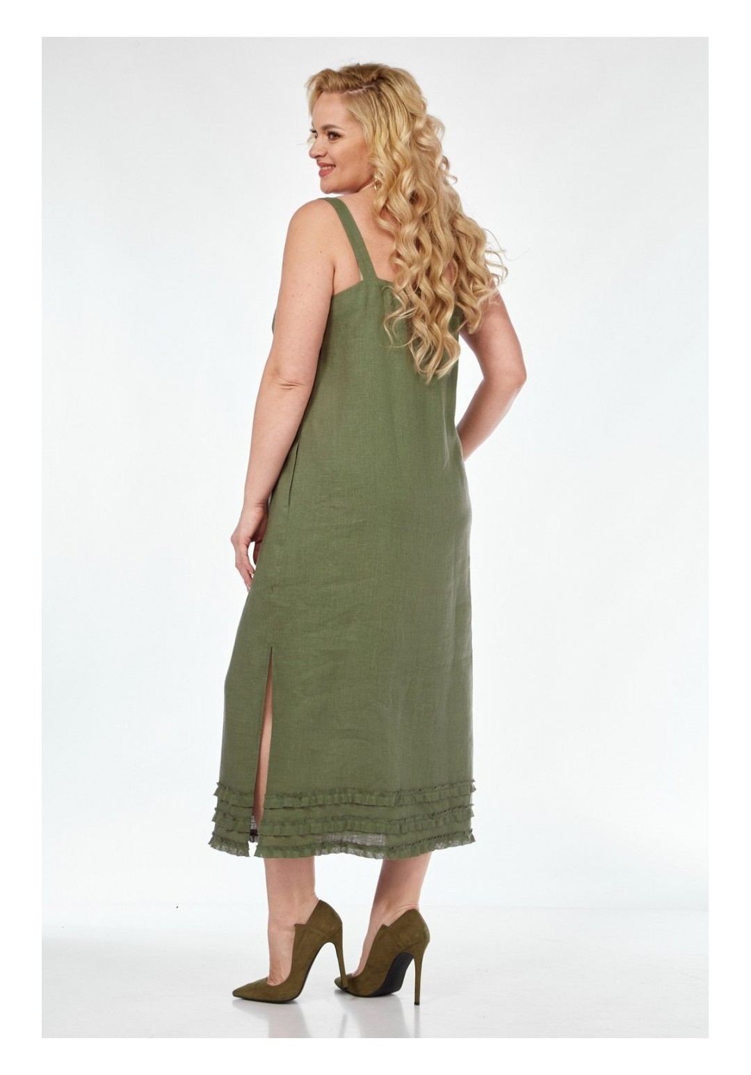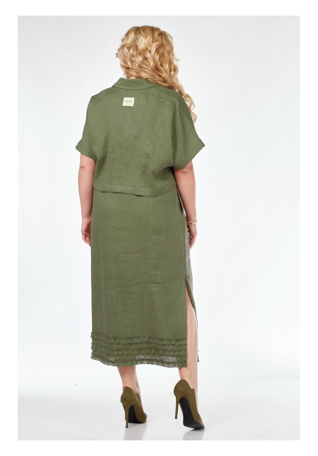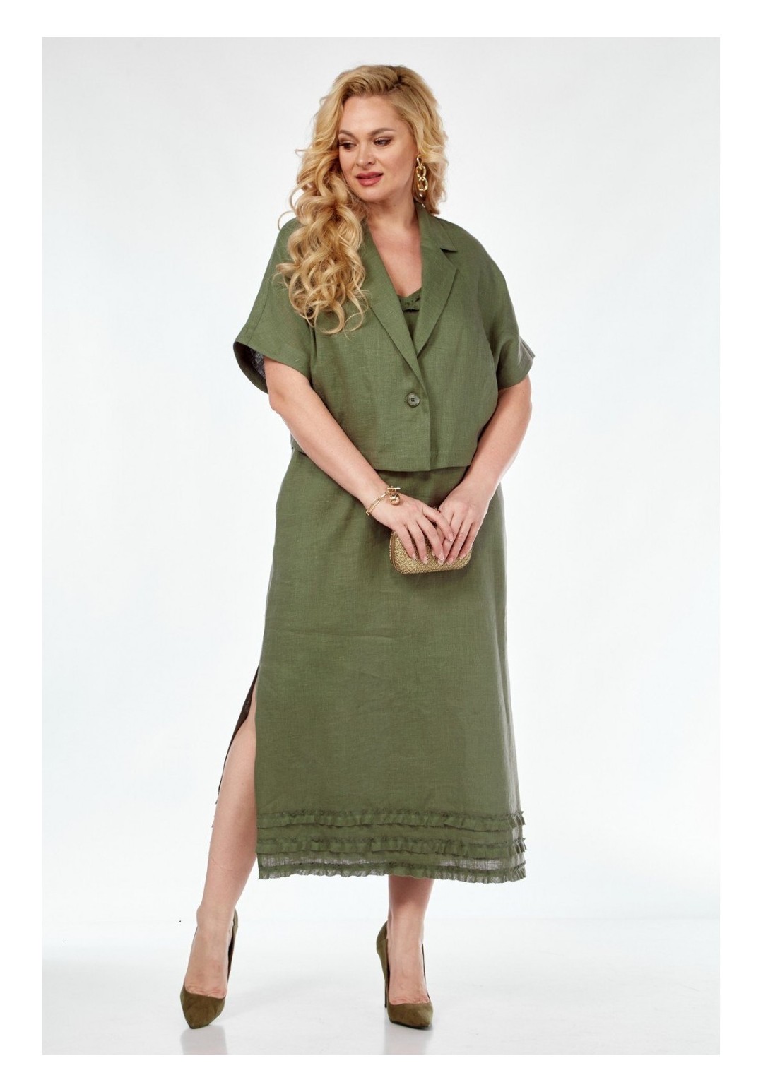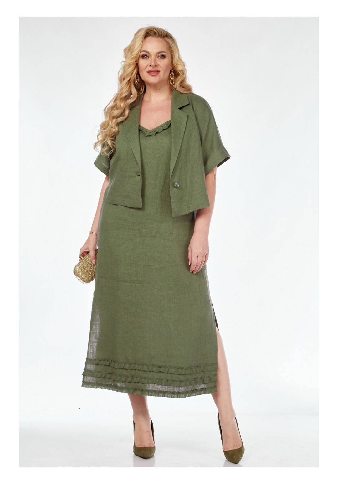 Комплект женский состоит из сарафана и жакета. Сарафан женский полуприлегающего силуэта, прямого кроя на широких бретелях. Перед с V-образной горловиной и нагрудными вытачками. Вдоль горловины настрочена тесьма, по низу три ряда рюш. В сарафане между бретелей резинка по верху, в боковых швах обработаны карманы.По бокам выполнены разрезы. Жакет укороченный, свободного кроя с застежкой на 1 петлю и пуговицу. Жакет с цельнокройным рукавом длиной до локтя. Воротник пиджачного типа с лацканом. Спинка украшена нашивкой. Длина жакета по спинке 46 см.,длина рукава+ширина плеча 37 см. Длина сарафана по спинке 98 см.