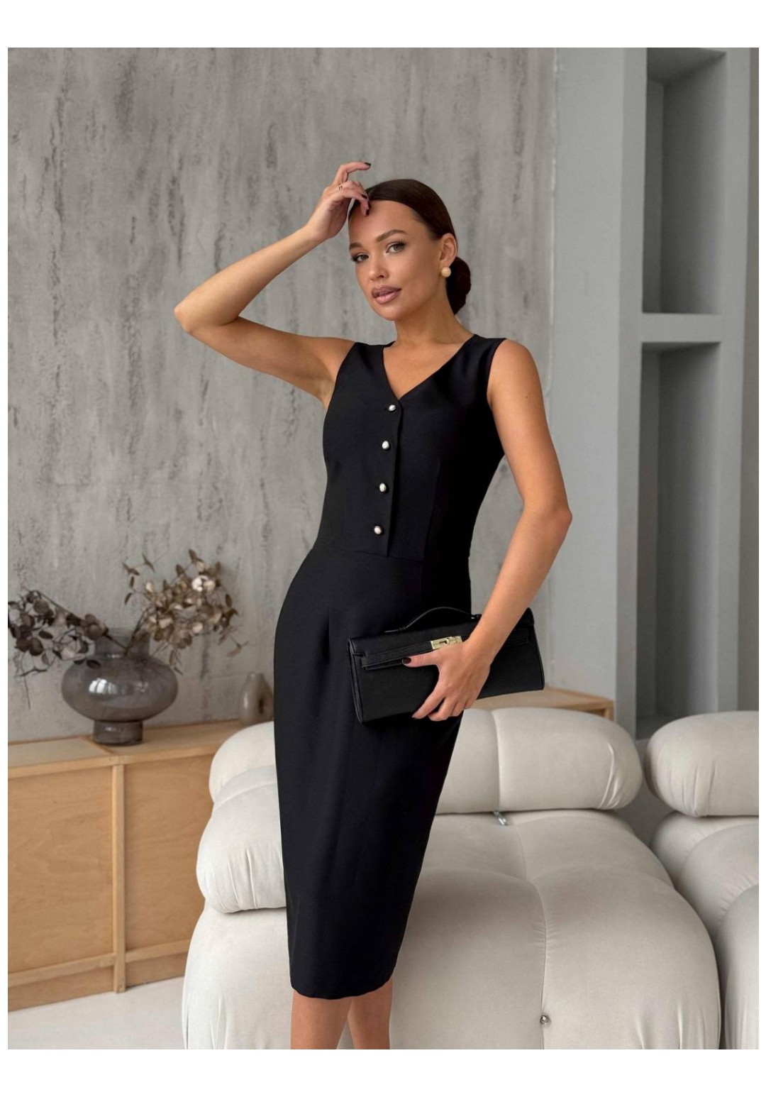 Костюм женский двух-предметный, состоящий из платья и жакета. Платье полуприлегающего силуэта, длинной чуть ниже колена. Перед отрезной по линии талии. Нижняя часть переда с таллиевыми вытачками. Верхняя часть переда с нагрудными вытачками от линии талии, с центральной застежкой на петли- пуговицы и фигурным вырезом горловины. Спинка с таллиевыми вытачками, со средним швом спинки, в котором обработана застежка на тесьму молнию и шлица. Жакет полуприлегающего силуэта, длинной чуть ниже линии бедер. Спинка с вертикальными рельефами. Перед с рельефами от проймы и отрезным бочком. С нагрудными вытачками от рельефов. В шве рельефа обработаны карманы в швах. Жакет с фигурным вырезом горловины, фигурным бортом, застегивающимся на одну пуговицу. Рукава втачные двух-шовные. Длина рукава жакета - 61,5 см Длина жакета - 63,5 см Ширина плеча платья - 6,9-7,9 см Длина платья - 109,0 см
