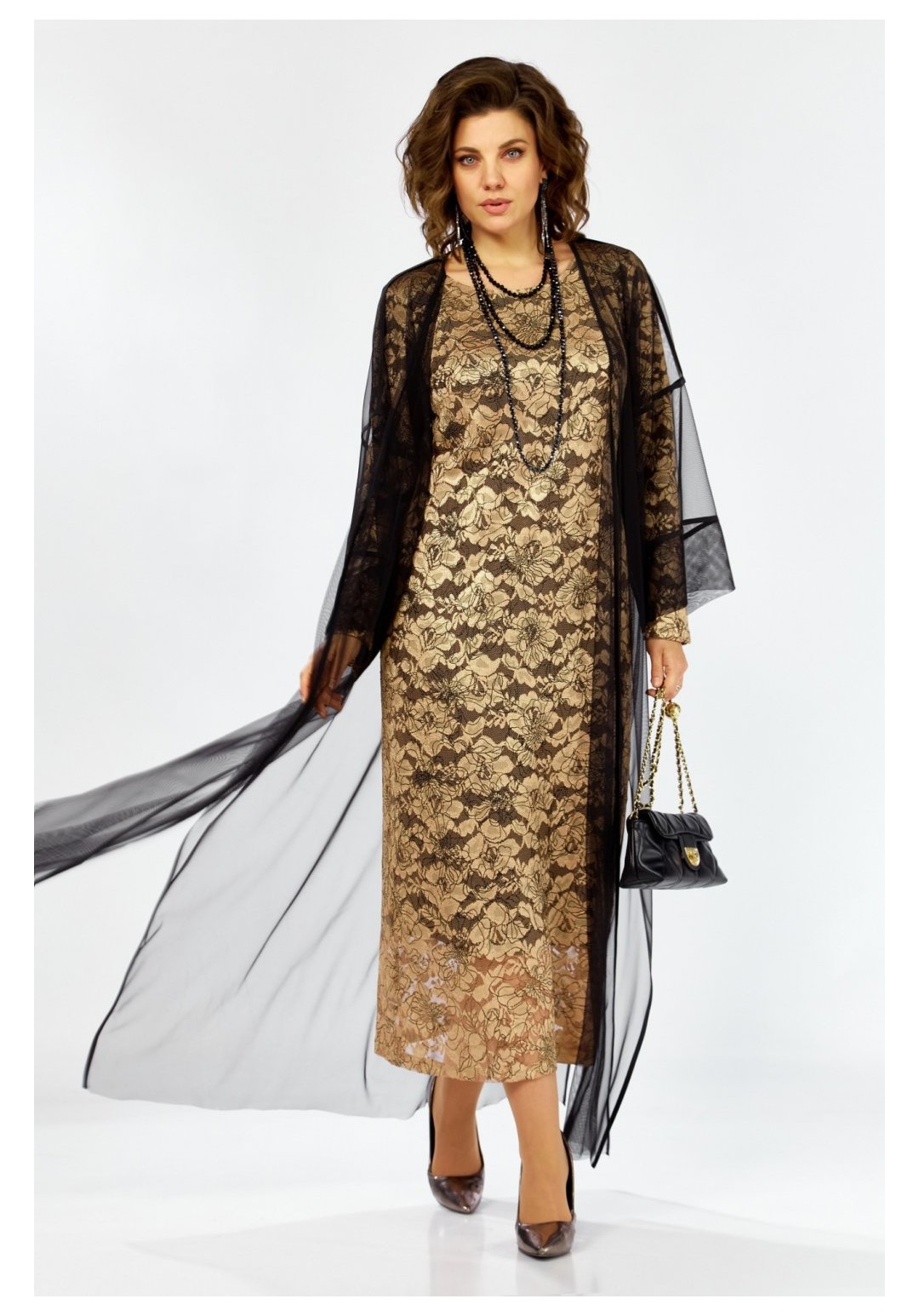Элегантный и утонченный комплект созданный для особых случаев в основе платье полуприлегающего силуэта на трикотажной подкладке из кружевного гипюра с контрастным рисунком в цветочной тематике ,Сверху легкая накидка шазюбль из прозрачной сетки , она мягко драпируется , создавая воздушный легкий силуэт длинные рукава и свободный крой добавляют образу благородства и загадочности .