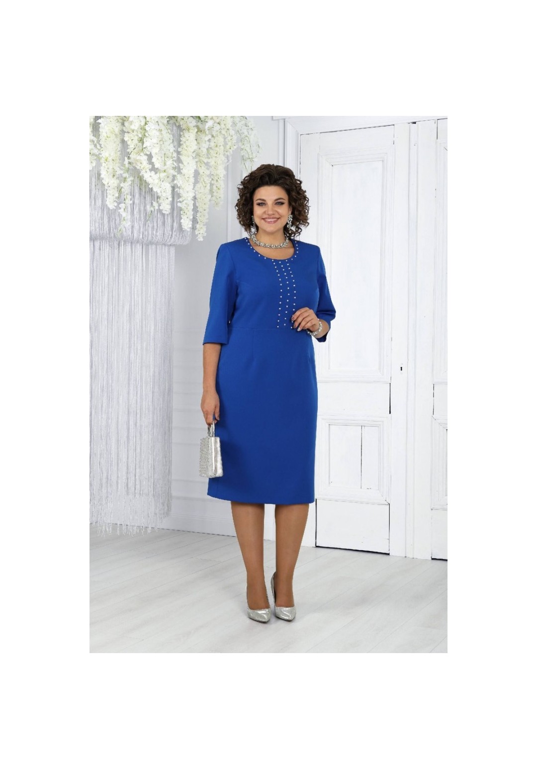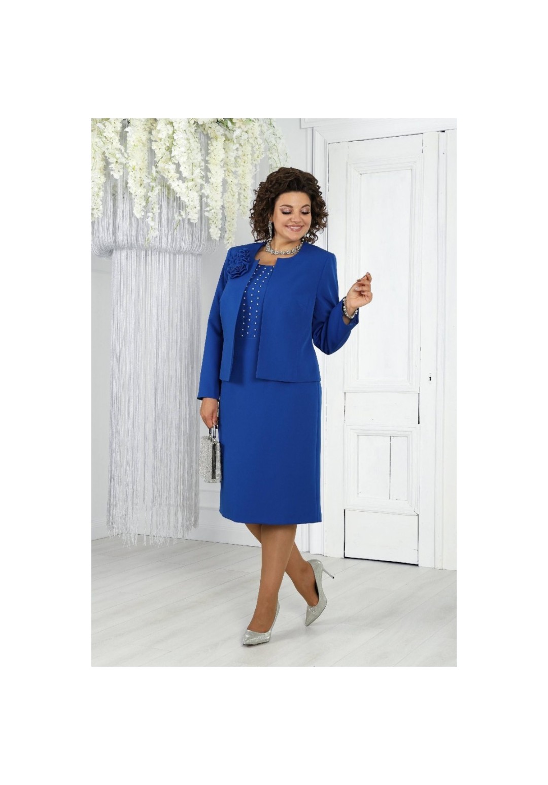 Этот элегантный костюм – воплощение классики и изысканности, он станет прекрасным выбором для особых случаев, таких как торжественные мероприятия, юбилеи или корпоративные вечера. Жакет дополнен роскошной объемной цветочной аппликацией на плечах, придающей образу утонченную женственность. Легкий акцент на талии и прямой крой жакета делают силуэт визуально стройнее, а минималистичная отделка подчеркивает его элегантность. Комплект женский, двух предметный, состоящий из жакета и платья. Комплект выполнен из костюмной – плательной ткани. Жакет полуприлегающего силуэта, длиной по среднему шву спинки 55 см. Перед с рельефными швами, выходящими из пройм до низа и нагрудными вытачками, идущими из рельефов к центру груди. Борта прямые, без застежки, не доходят до центра переда. В верхней правой части переда нашит декоративный цветок. Спинка со средним швом, с рельефами, идущими от плеча до низа. Горловина спинки и переда округлой формой, спереди углубленная. Рукава втачные, двушовные. Длина рукава 60 см. Жакет на подкладке, с плечевыми накладками. Платье женское полуприлегающего силуэта, длинной 107 см по среднему шву спинки. Перед отрезной по линии талии. Верхняя часть с нагрудными вытачками, идущими из пройм и двумя вертикальными подрезами по центру. В нижней части расположены талиевые вытачки, выходящие из подреза. По вертикальным подрезам и по краю горловины нашиты бусинки. Спинка с талиевыми вытачками. со средним швом, в верхней части которого расположена застежка на потайную тесьму-молнию, а в нижней части расположена шлица. Горловина переда и спинки округлой формы, по переду углубленная. Рукава втачные, одношовные, длиной 41 см. Платье на трикотажной подкладке, с плечевыми накладками.