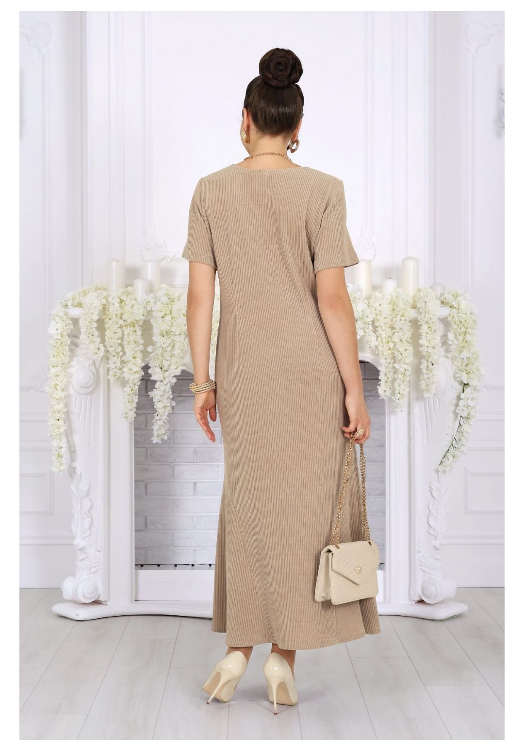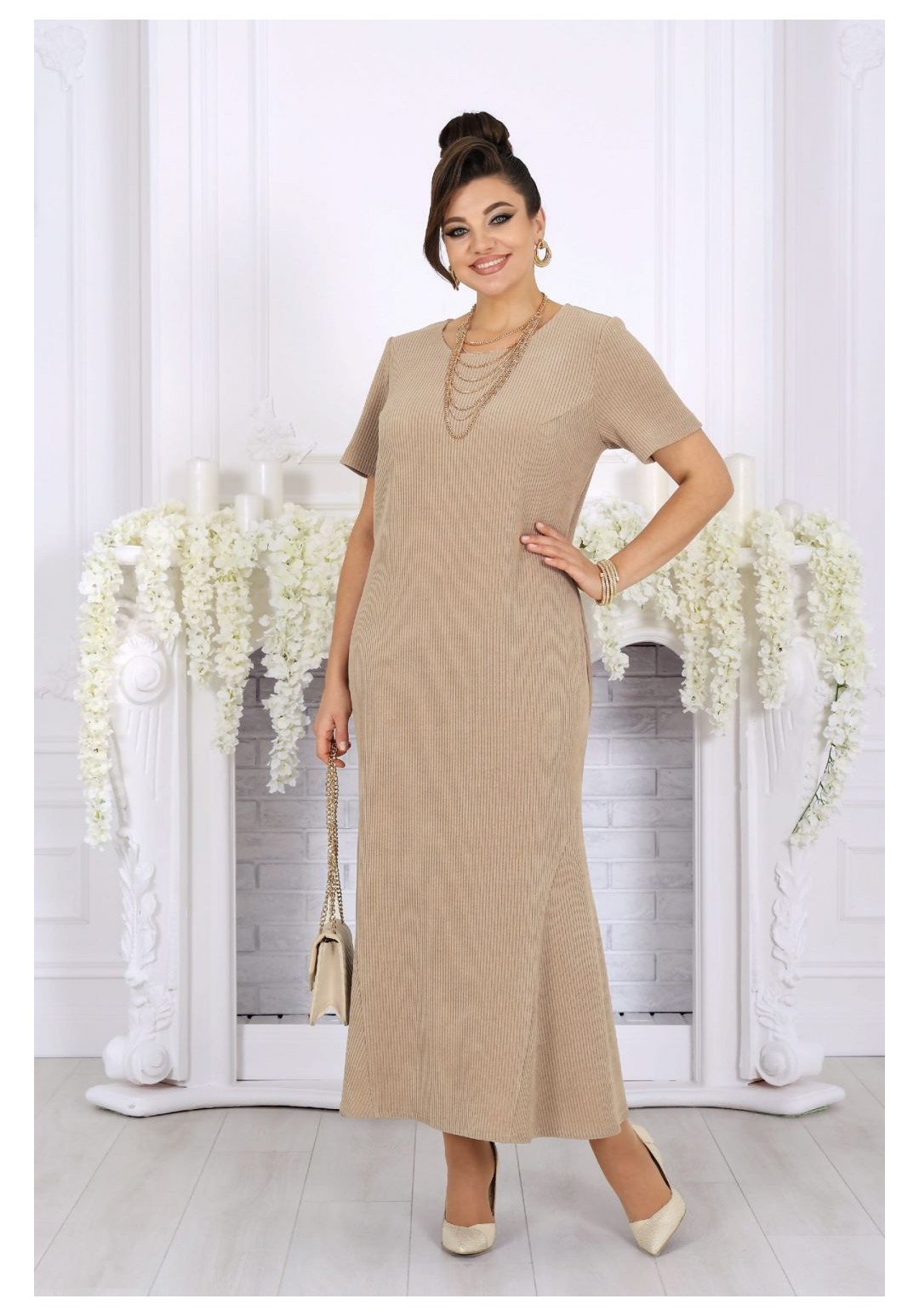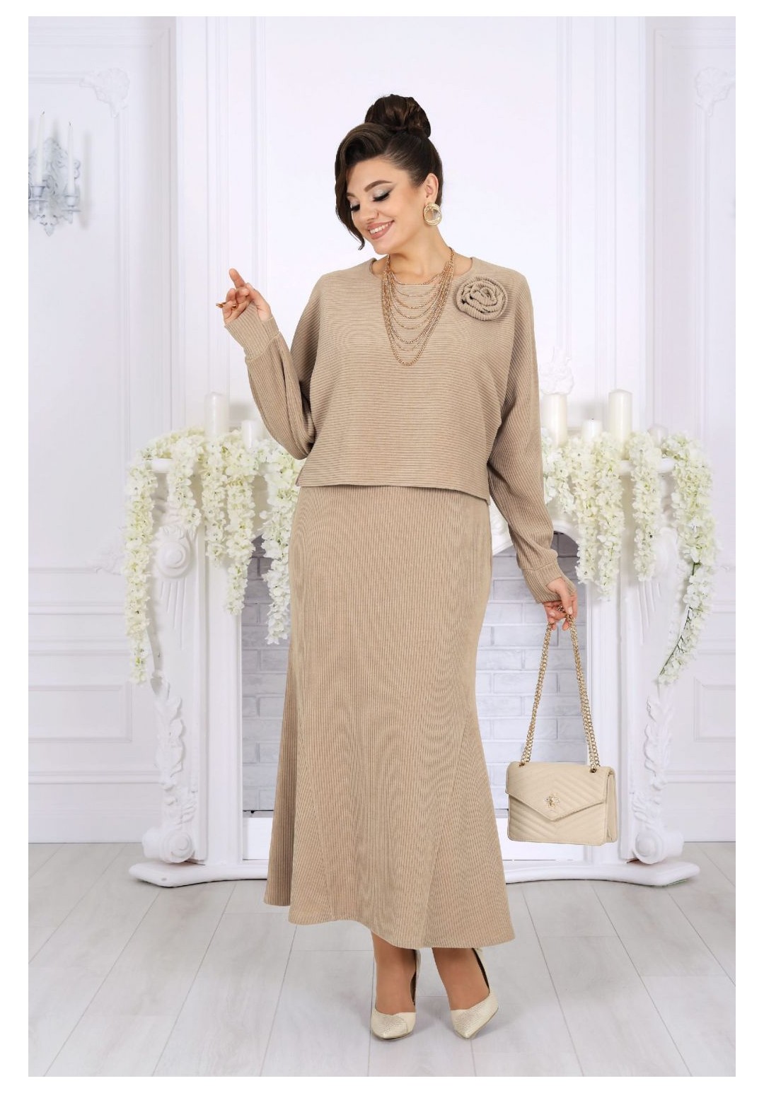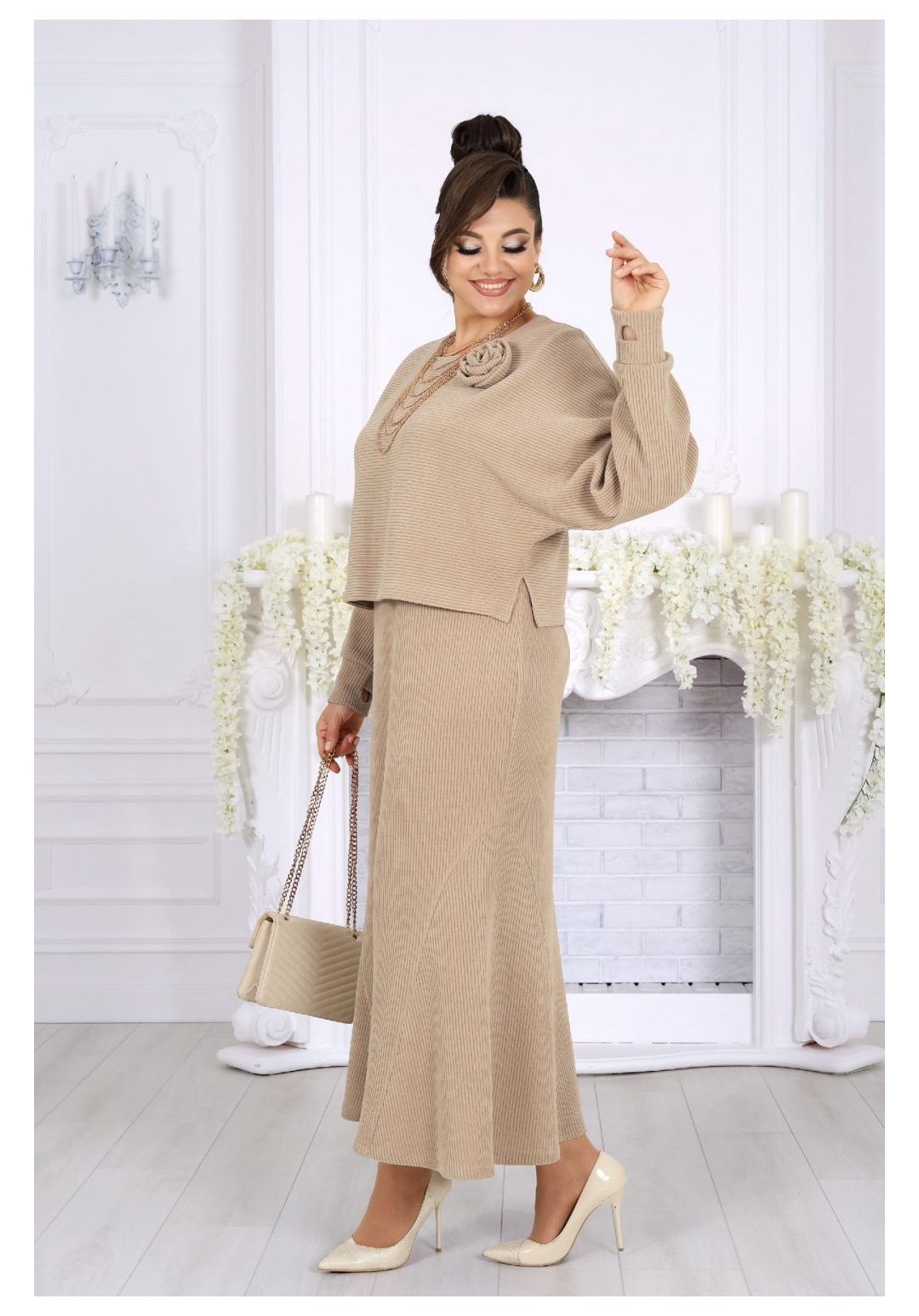 Практичный, стильный и по-настоящему универсальный костюм, который станет базой вашего гардероба и будет радовать не один сезон. Этот костюм создан для женщин, которые ценят комфорт, аккуратную посадку и продуманный дизайн. Фактурный трикотаж с рубчиком мягко ложится по фигуре, визуально вытягивает силуэт и не сковывает движений. Модель отлично подходит для женщин с формами и уверенно смотрится в больших размерах. Платье полуприлегающего силуэта красиво подчеркивает линии фигуры, а притачные клинья по бокам создают плавное расширение к низу, обеспечивая свободу шага и женственный силуэт. Удобная длина делает образ уместным как для деловой обстановки, так и для прогулок или встреч. Свободный джемпер добавляет образу уюта и многослойности: его можно носить поверх платья или отдельно. Разрезы по бокам, мягкая горловина и манжеты с вырезом для большого пальца создают современный, продуманный образ. Съемный декоративный цветок позволяет менять настроение комплекта — от лаконичного до более нарядного. Костюм легко адаптируется под разные случаи: — с аксессуарами и каблуками — для праздничного или делового выхода — с обувью на низком ходу — для комфортных повседневных образов Комплект женский 2-х предметный, состоящий из джемпера и платья. Джемпер свободного силуэта, выполнен из фактурного трикотажного полотна с рубчиком. Модель с разрезами в боковых швах, без подкладки, без застежки и плечевых накладок Горловина круглой формы, углубленная спереди. Рукав длинный, цельнокроеный с деталями переда и спинки; по низу рукава манжета с вырезом для большого пальца. Джемпер дополнен съемным цветком из основного полотна. Длина джемпера – 46 см; длина рукава (от горловины) – 77 см. Платье полуприлегающего силуэта, выполнено из фактурного трикотажного полотна с рубчиком. На продолжении боковых швов, в нижней части платья – притачные клинья, придающие силуэту расширение к низу. Модель без подкладки, без застежки и плечевых накладок. Перед с нагрудными вытачками, направленными от пройм, спинка – с талиевыми. Горловина круглой формы, углубленная спереди. Рукав втачной, короткий. Длина платья – 130 см; длина рукава – 22 см.
