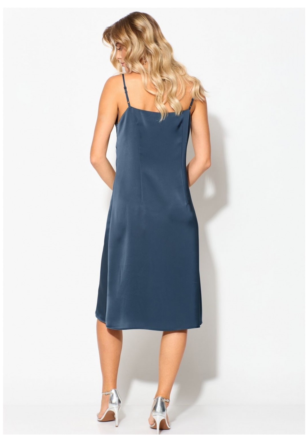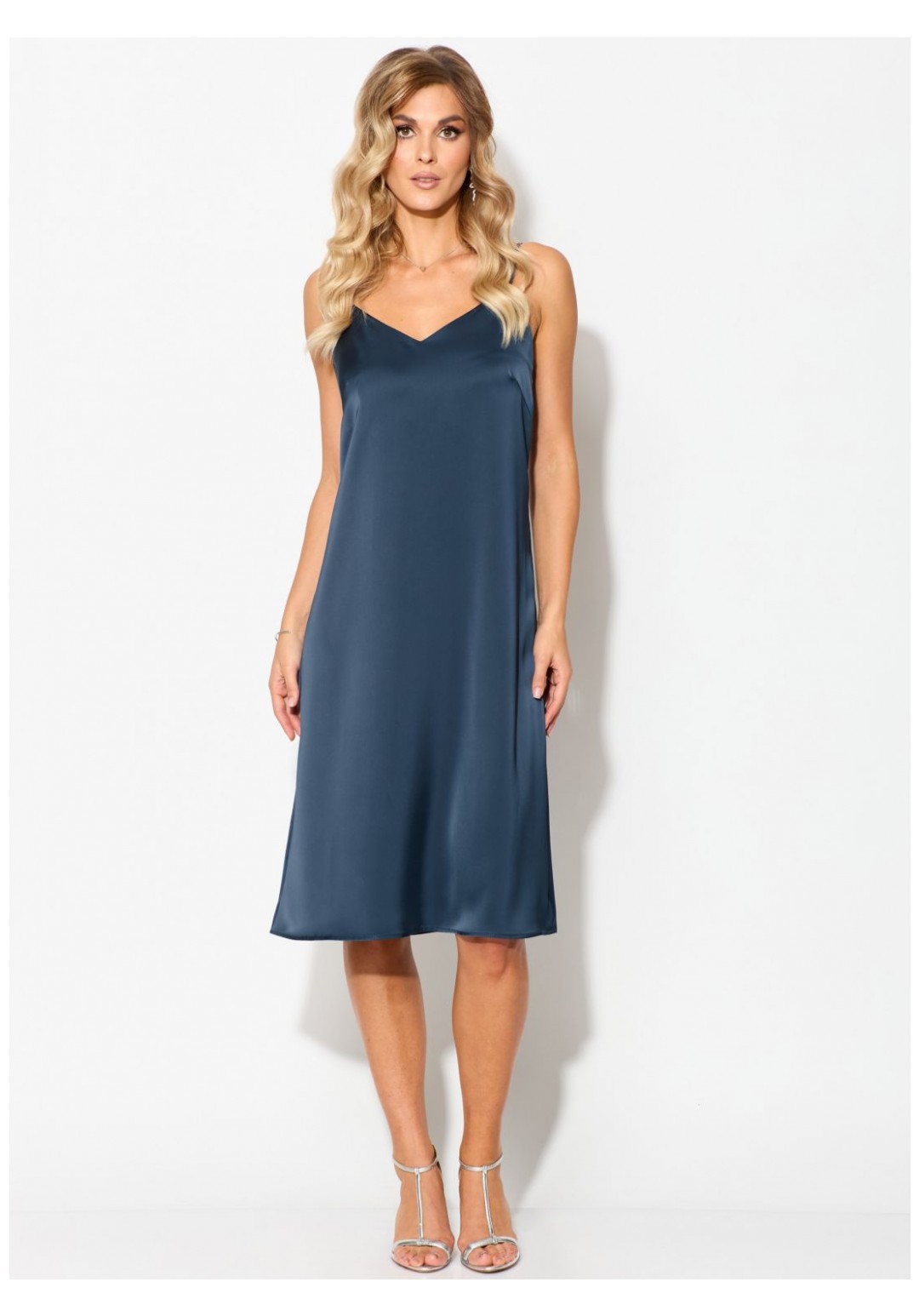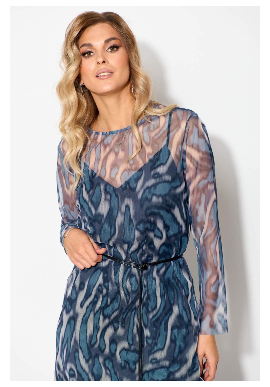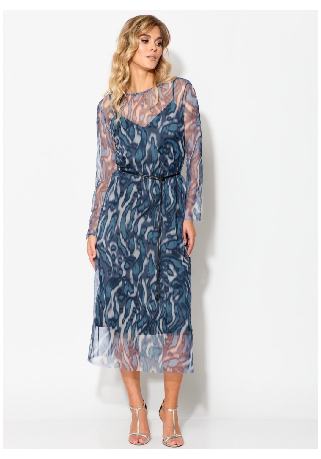 Комплект женский нарядный, состоящий из двух слоев платья. Верхнее платье свободного силуэта из сетки под фатин с принтом, со спущенной линией плеча, с втачными рукавами, длиной до середины икр, со съемным декоративным шнуром. Рукава втачные одношовные. Нижнее платье из атласной ткани полуприлегающего силуэта, длиной ниже коленей, на бретелях. Деталь переда – с нагрудными вытачками. Декор может отличаться от представленного на фотографии. Платье верхнее: длина рукава - 57см, ширина рукава – 20см, длина спинки – 124см. Платье нижнее: длина середины спинки – 116см.