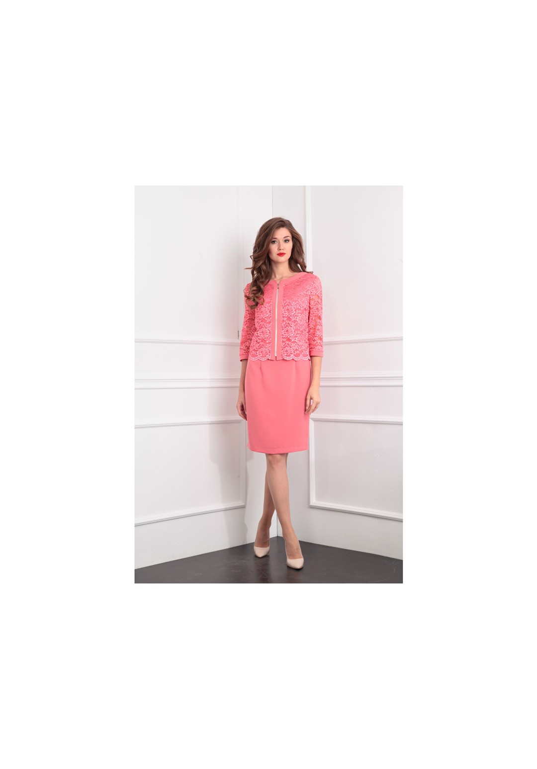 Нарядный женственный комплект, состоящий из гипюрного жакета и прилегающего платья из одноцветной плательной ткани.