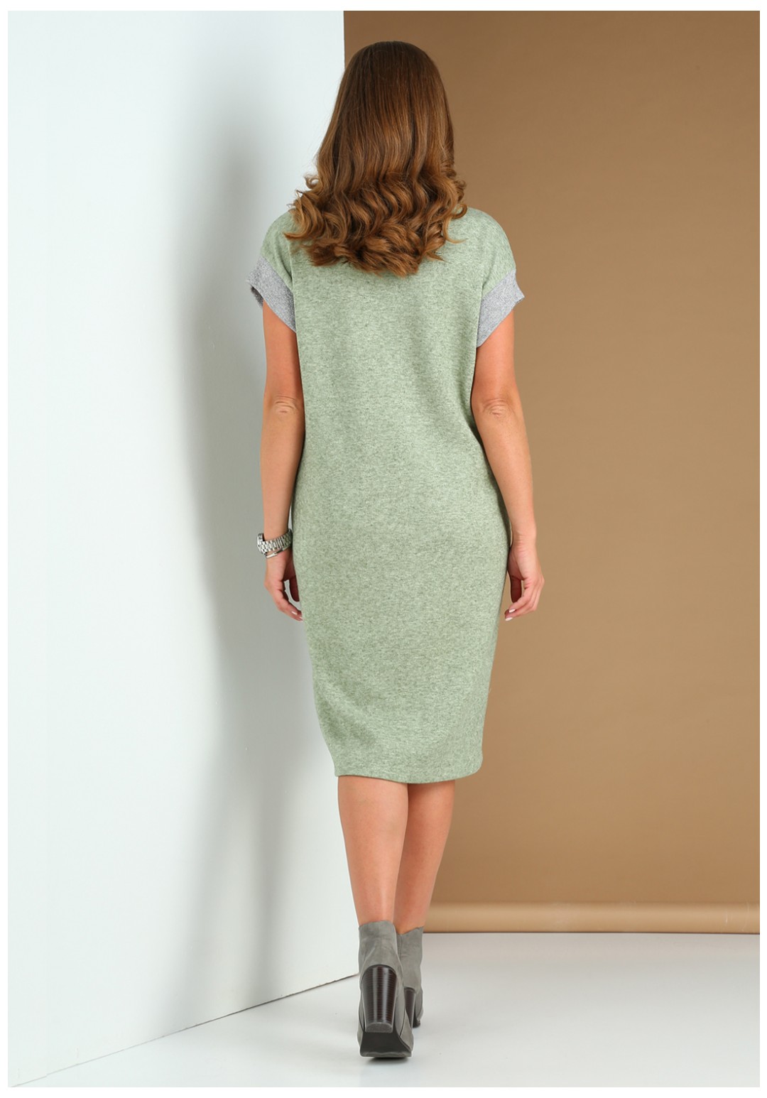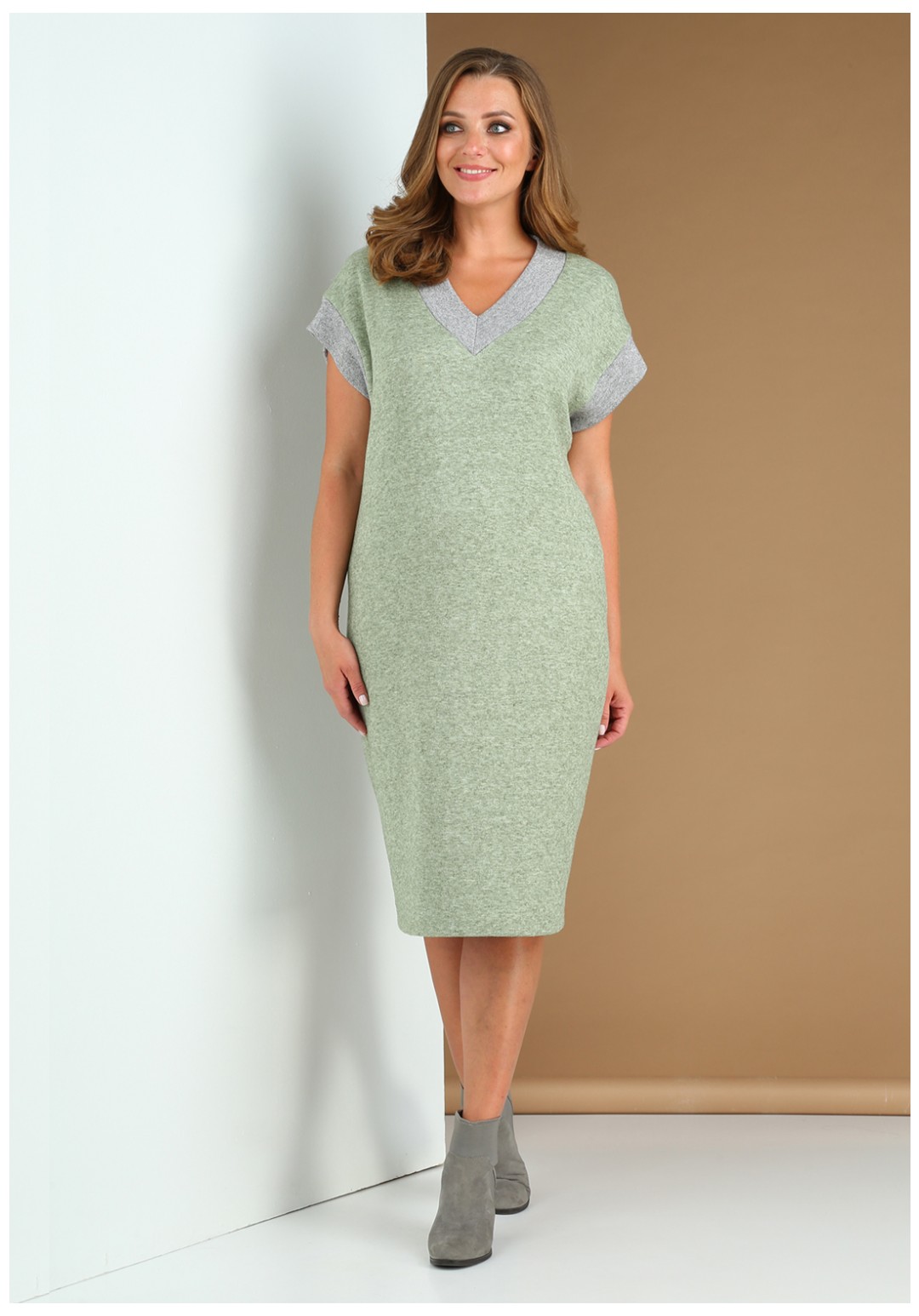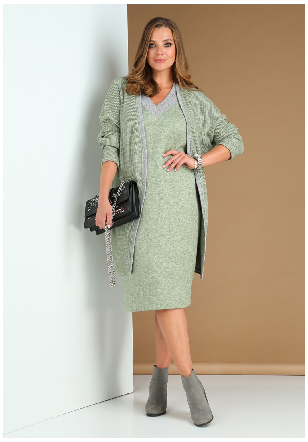 Уютный трикотажный комплект. Платье-жилет прямого покроя. Горловина платья с V-образным вырезом. Горловина и рукава с отделкой из серебристого трикотажного довяза. Длина платья - 111 см. Кардиган прямого свободного силуэта из трикотажного полотна с рельефной вязкой, со спущенной линией плеча с притачной планкой по борту. Длина кардигана - 93 см.