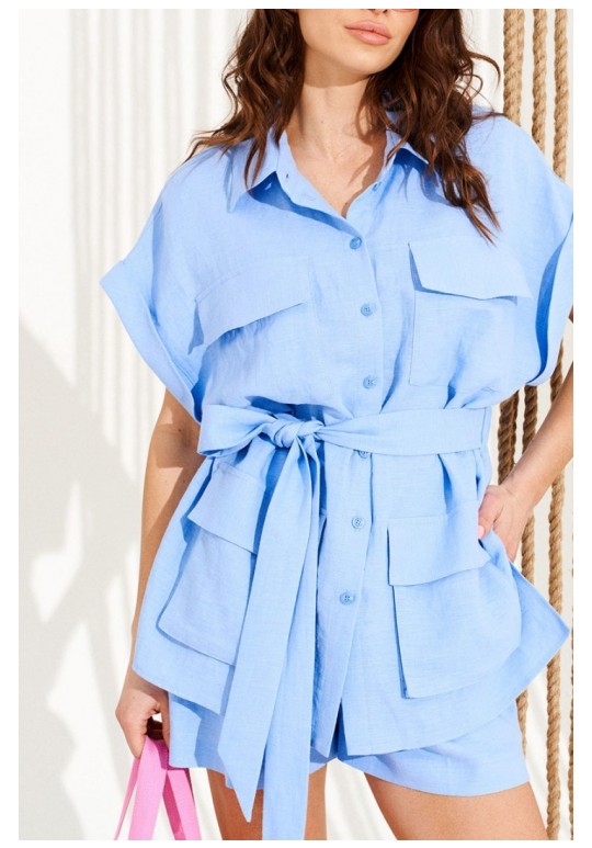 Комплект 2-х предметный, состоящий из блузки и шорт. Блузка свободного объема, приталенного силуэта, с центральной застежкой на петли и пуговицы. Воротник стояче-отложной на отрезной стойке. Детали переда с накладными карманами и клапанами. Спинка с эластичной тесьмой по линии талии. Для регулировки приталенности в боковые швы вставлены завязки. Проймы оформлены притачными отложными манжетами. Шорты умеренного объема, прямого силуэта. Детали переда оформлены боковыми карманами с отрезным бочком и односторонними складками. Застежка — гульфик на молнии. Пояс притачной, с застежкой на одну петлю и одну пуговицу. Длина блузки на модели вдоль середины спинки — 72,5 см. Длина шорт на модели вдоль бокового шва с учетом пояса — 38 см (допустимое отклонение +/- 1 см)