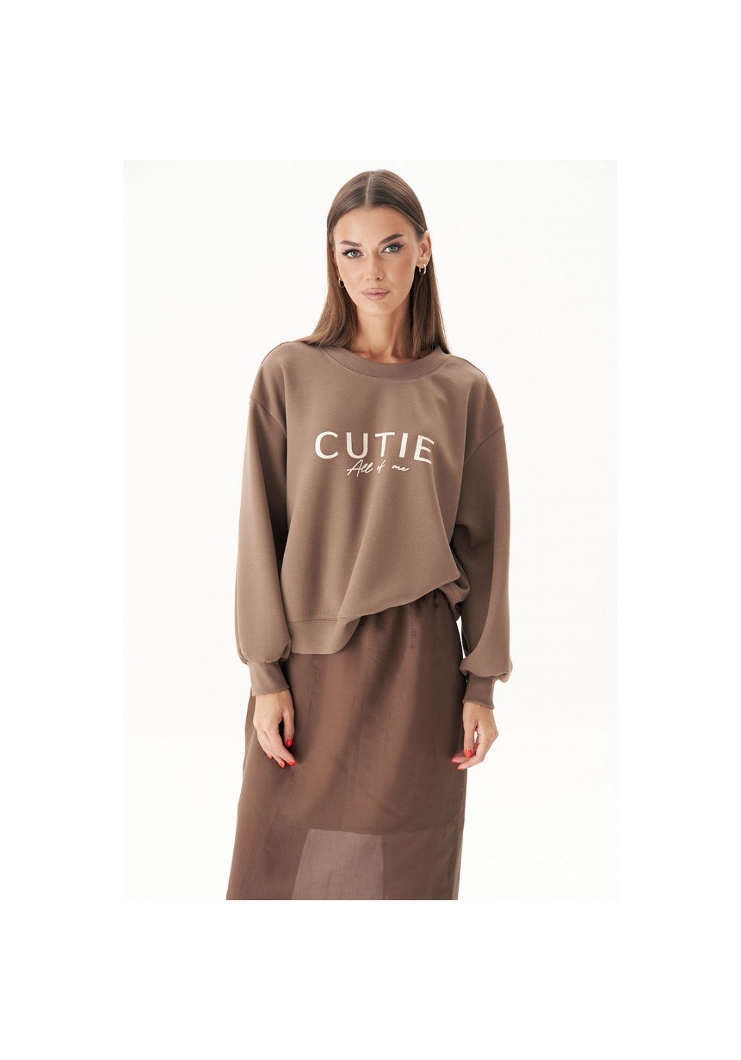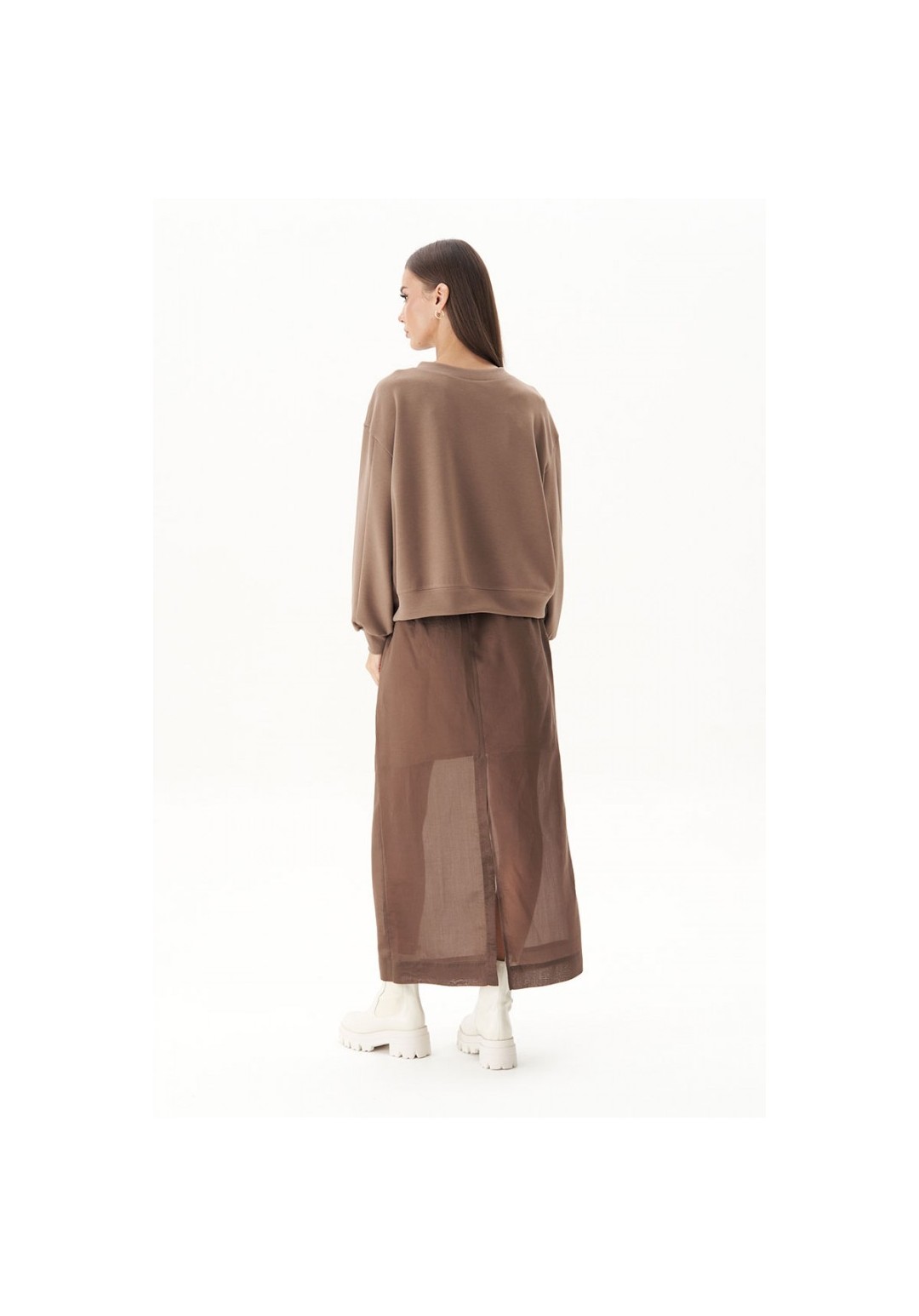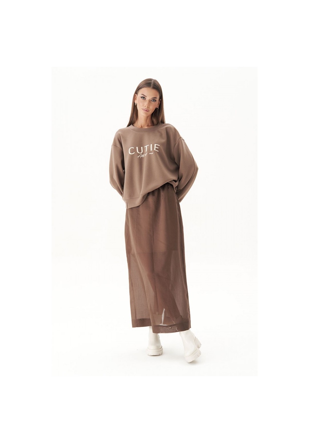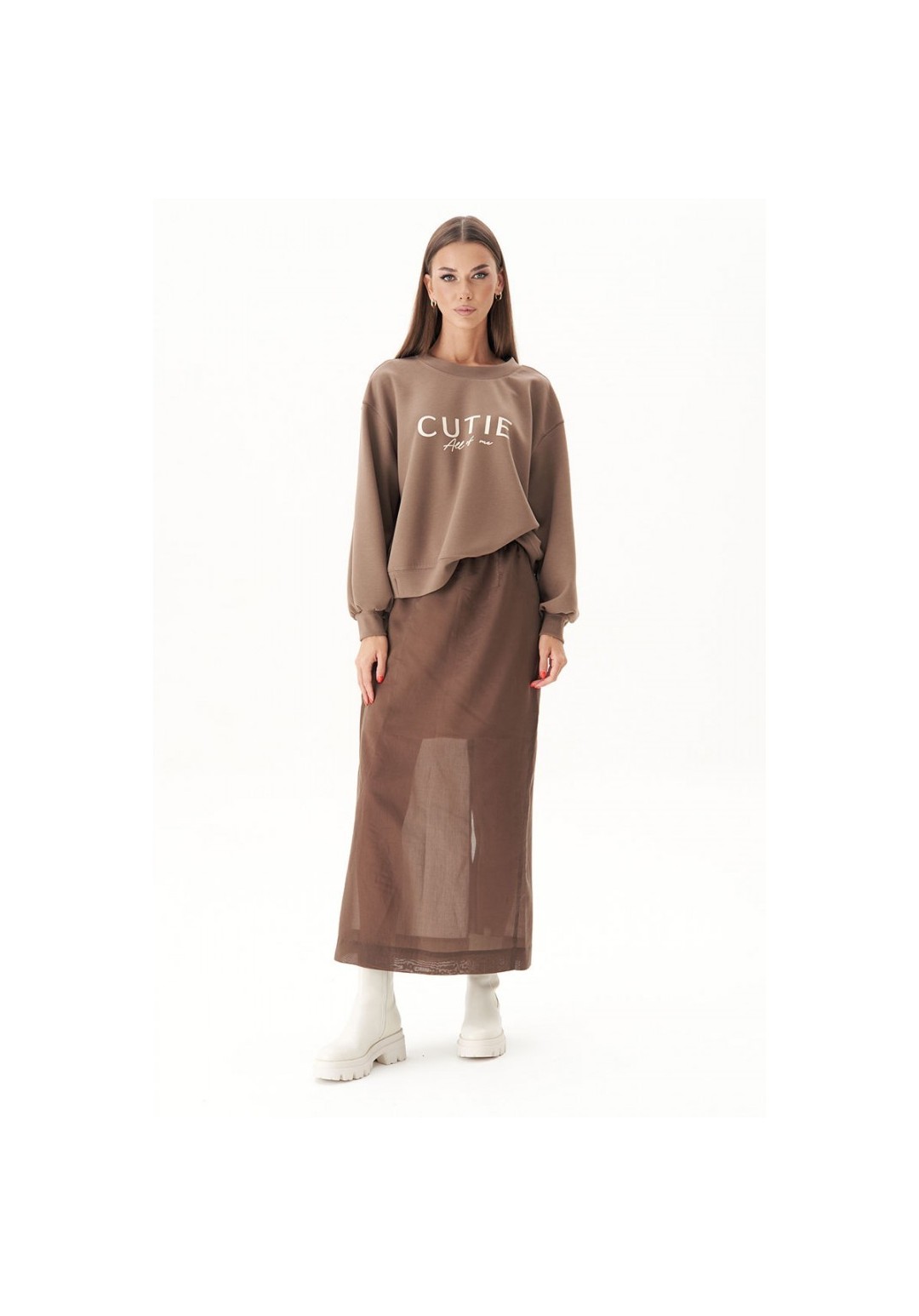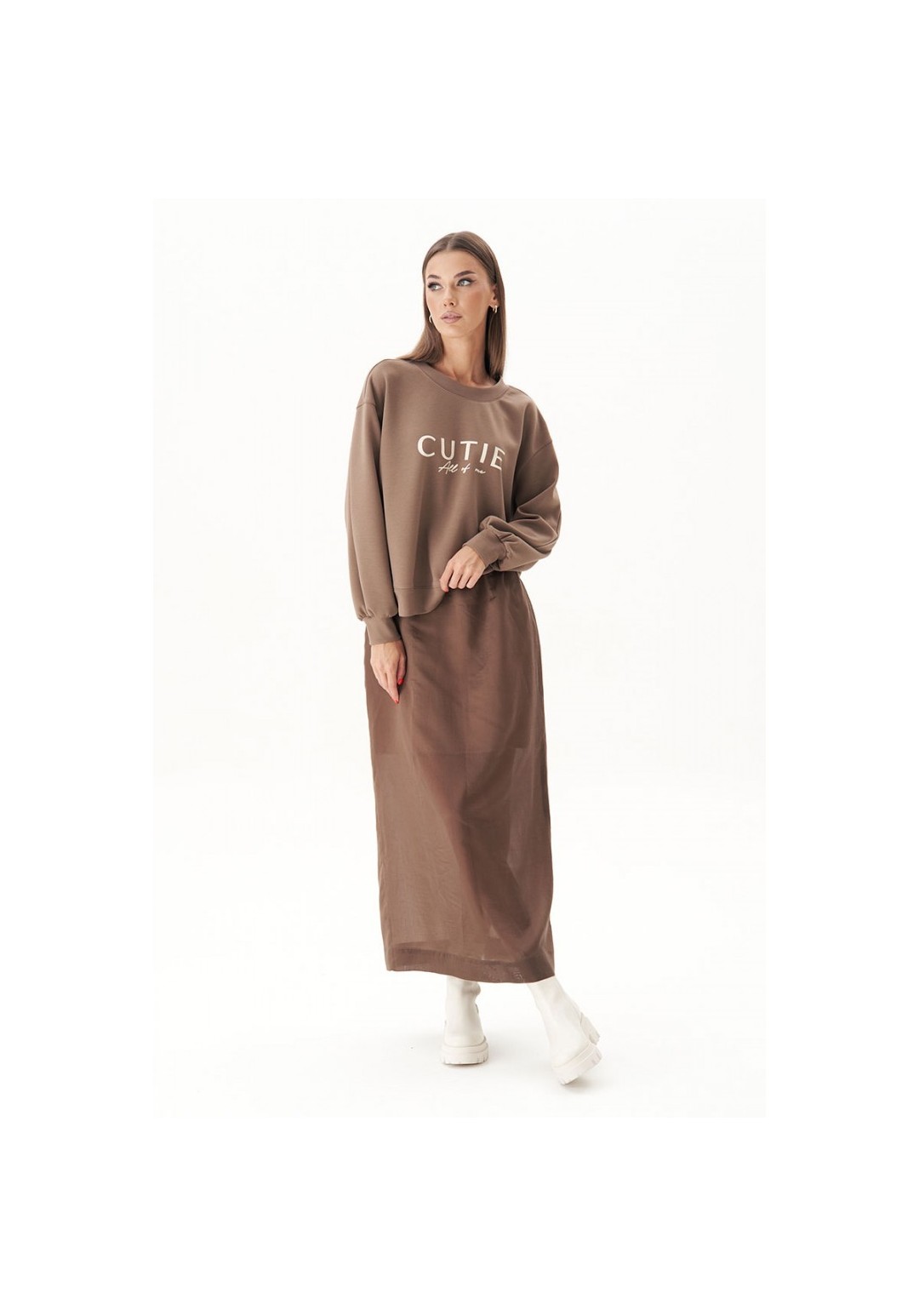 Базовый женский джемпер с круглой горловиной в сочетании с длинной элегантной юбкой - ещё один тренд этой осенью и зимой. Главный секрет, который сделает из юбочных комбинаций ультрамодные, скрывается в сочетании в одном образе вещей контрастных текстур. Такой монохромный look идеально подходит для создания нескучного аутфита. Прямая юбка длины макси на эластичном тонком поясе, с уютной трикотажной хлопковой подкладкой. Заднее полотнище юбки с центральным швом, талиевой вытачкой и высокой шлицей. Застёжка на потайную тесьму-молнию. Свитшот свободный, с заниженной линией плеча, манжетой по низкам рукавов и низу изделия и трендовым принтом. Длина юбки около 87 см. Длина свитшота около 60 см. Длина рукава с плечом около 74 см.