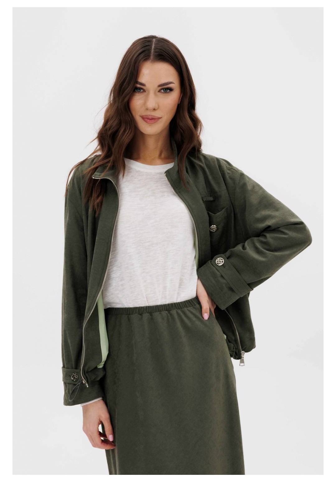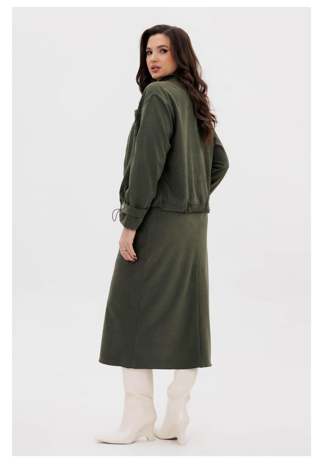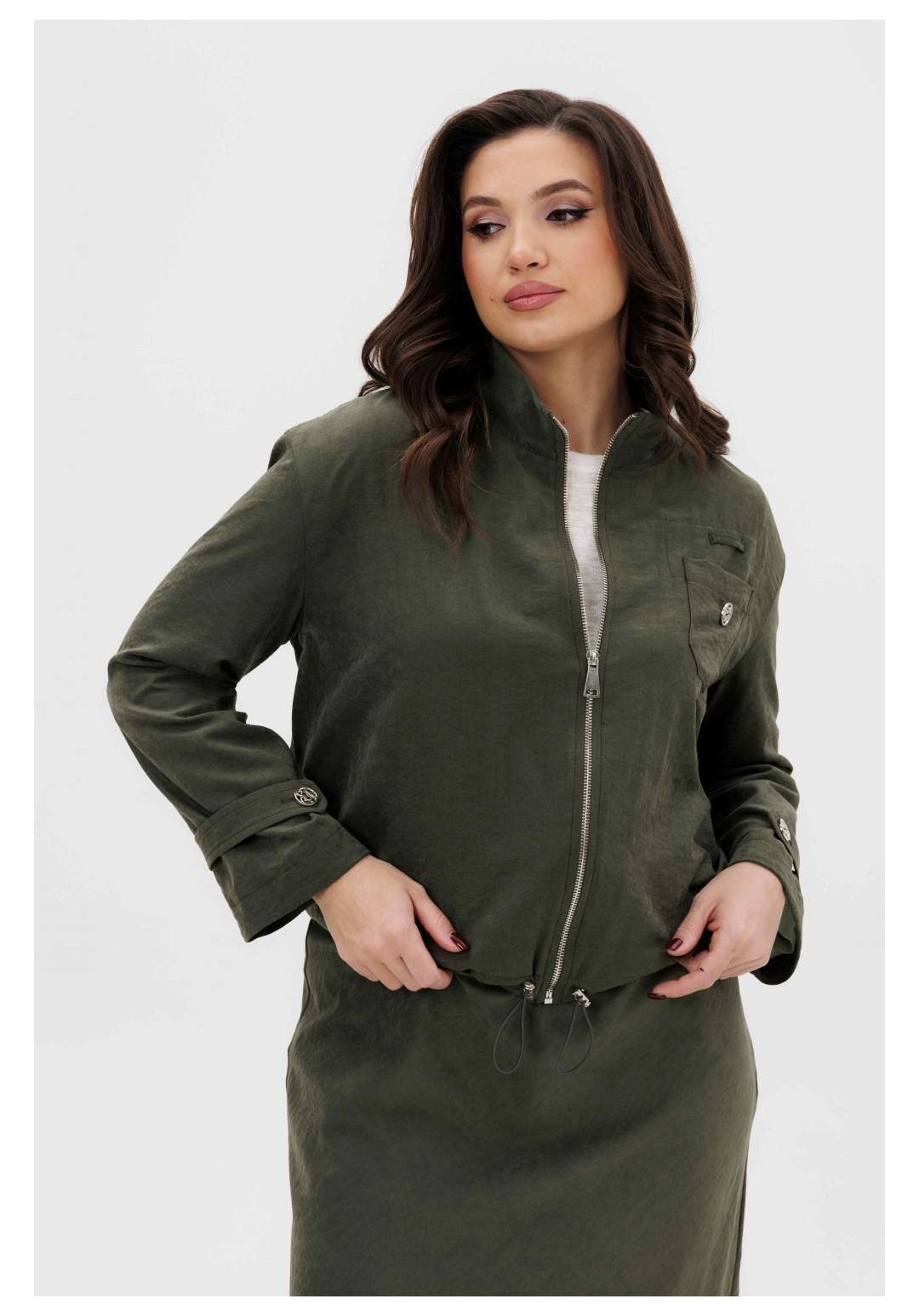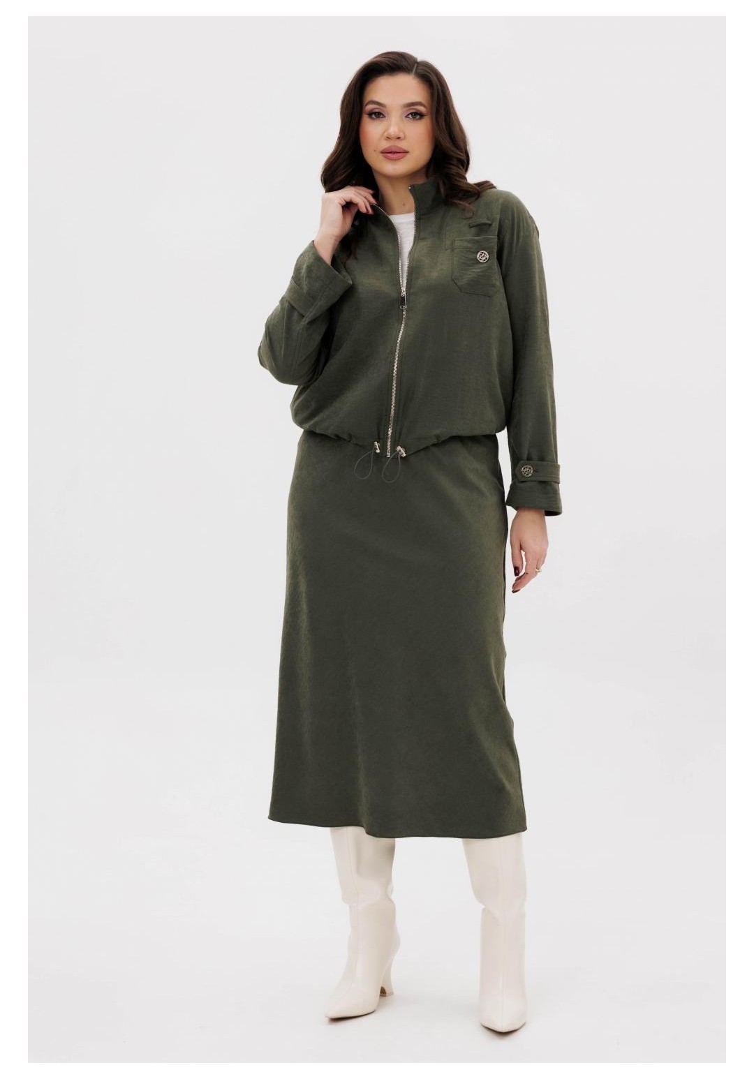 Этот вариант комплекта практически универсален, поскольку одинаково хорошо подойдет и молодым девушкам и леди элегантного возраста. Для тех, кто ищет комфортную повседневную одежду, интересную и привлекательную, модель просто идеальна. Свободная куртка на подкладке и юбка, косого кроя, из невероятного полотна с эффектом бархатистости или в народе мокрым эффектом. Куртка свободного силуэта, рубашечного покроя с воротником-стойкой и центральной застежкой на тесьму-молнию. Полочка с накладным карманом в области груди. Рукав с патой на пуговице в нижней части. По низу куртки-кулиса, с эластичной тесьмой и фиксаторами. Юбка на подкладке, косого кроя, с застежкой по боковому шву на потайную молнию и пуговицу и эластичным притачным поясом. Длина куртки около 60 см. Длина рукава с плечом около 74 см. Длина юбки около 80 см.