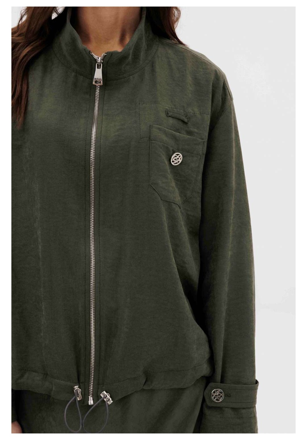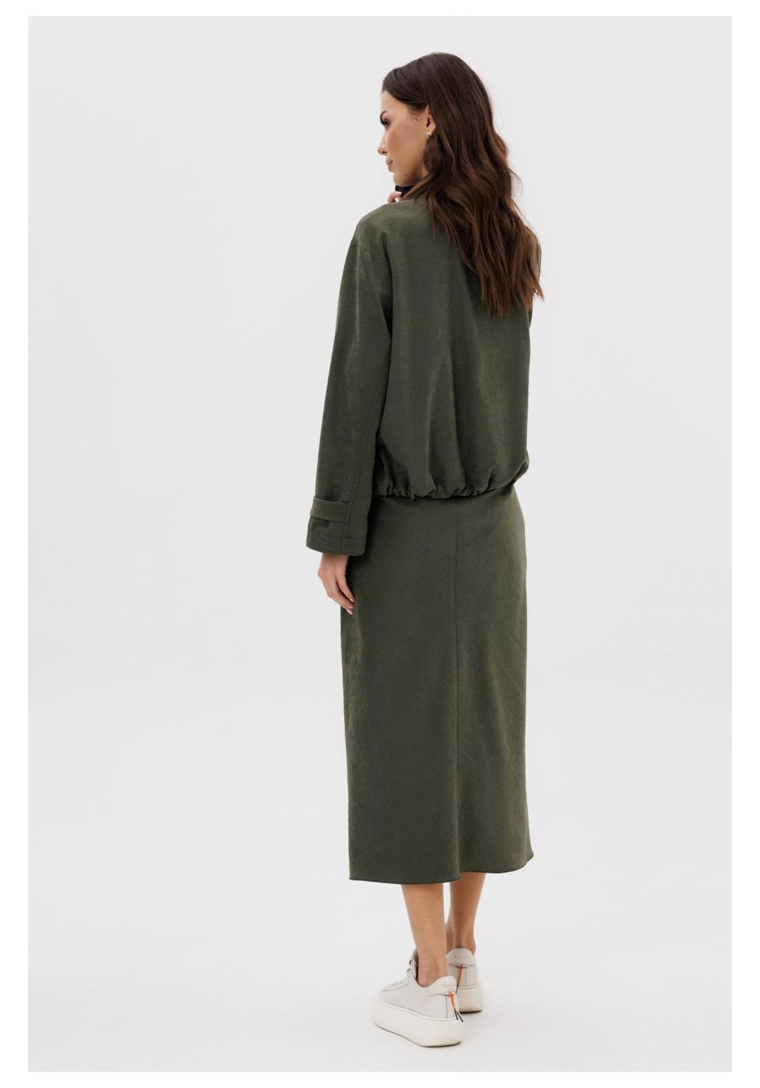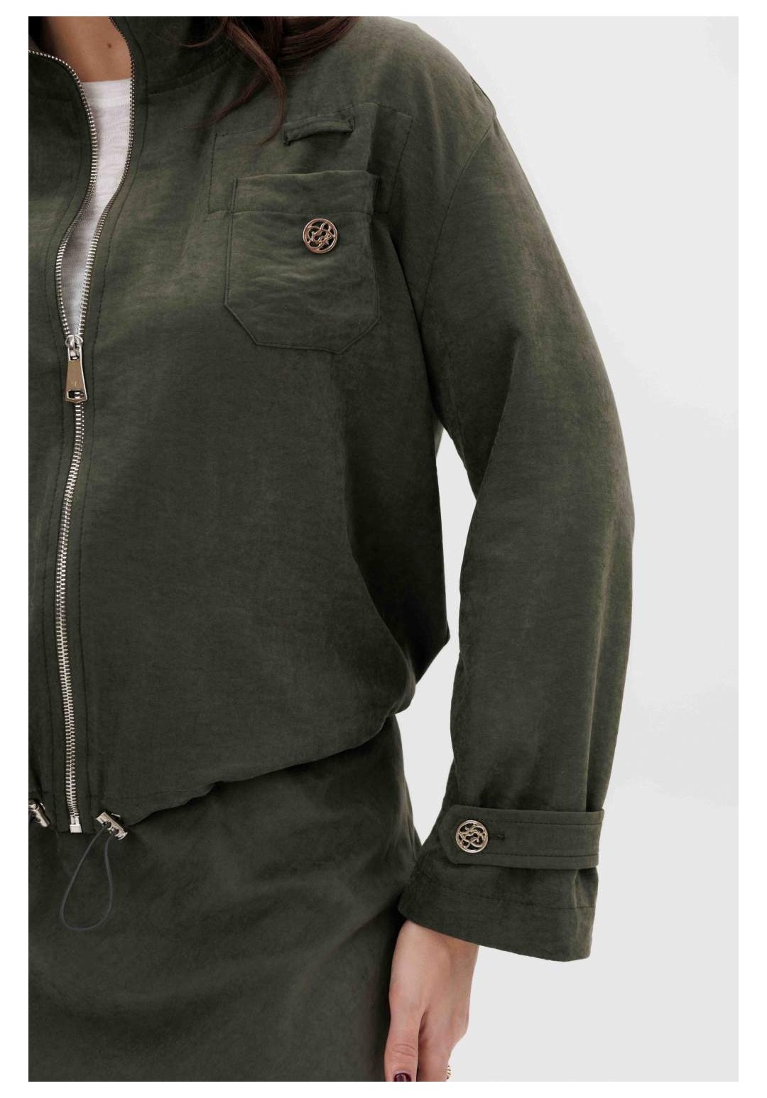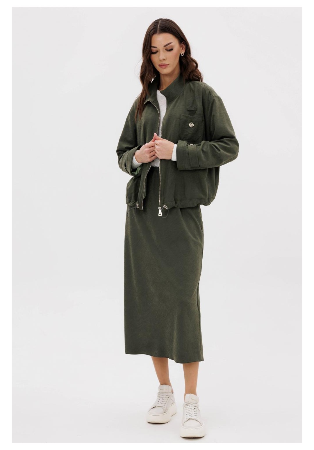 Этот вариант комплекта практически универсален, поскольку одинаково хорошо подойдет и молодым девушкам и леди элегантного возраста. Для тех, кто ищет комфортную повседневную одежду, интересную и привлекательную, модель просто идеальна. Свободная куртка на подкладке и юбка, косого кроя, из невероятного полотна с эффектом бархатистости или в народе мокрым эффектом. Куртка свободного силуэта, рубашечного покроя с воротником-стойкой и центральной застежкой на тесьму-молнию. Полочка с накладным карманом в области груди. Рукав с патой на пуговице в нижней части. По низу куртки-кулиса, с эластичной тесьмой и фиксаторами. Юбка на подкладке, косого кроя, с застежкой по боковому шву на потайную молнию и пуговицу и эластичным притачным поясом. Длина куртки около 60 см. Длина рукава с плечом около 74 см. Длина юбки около 80 см.