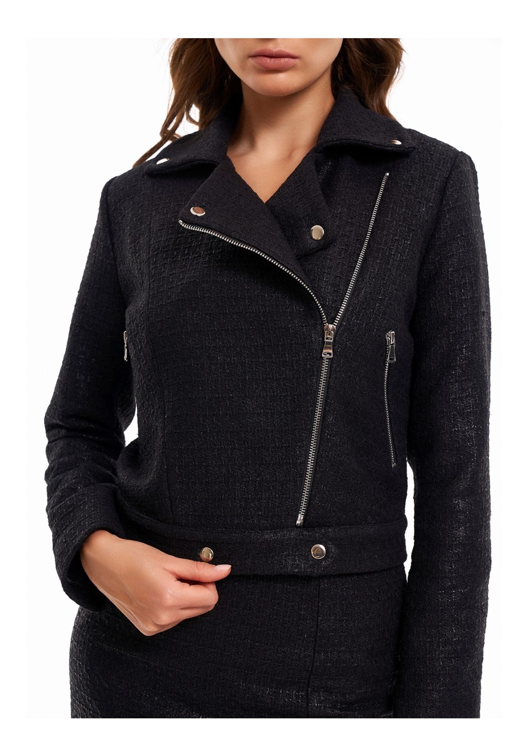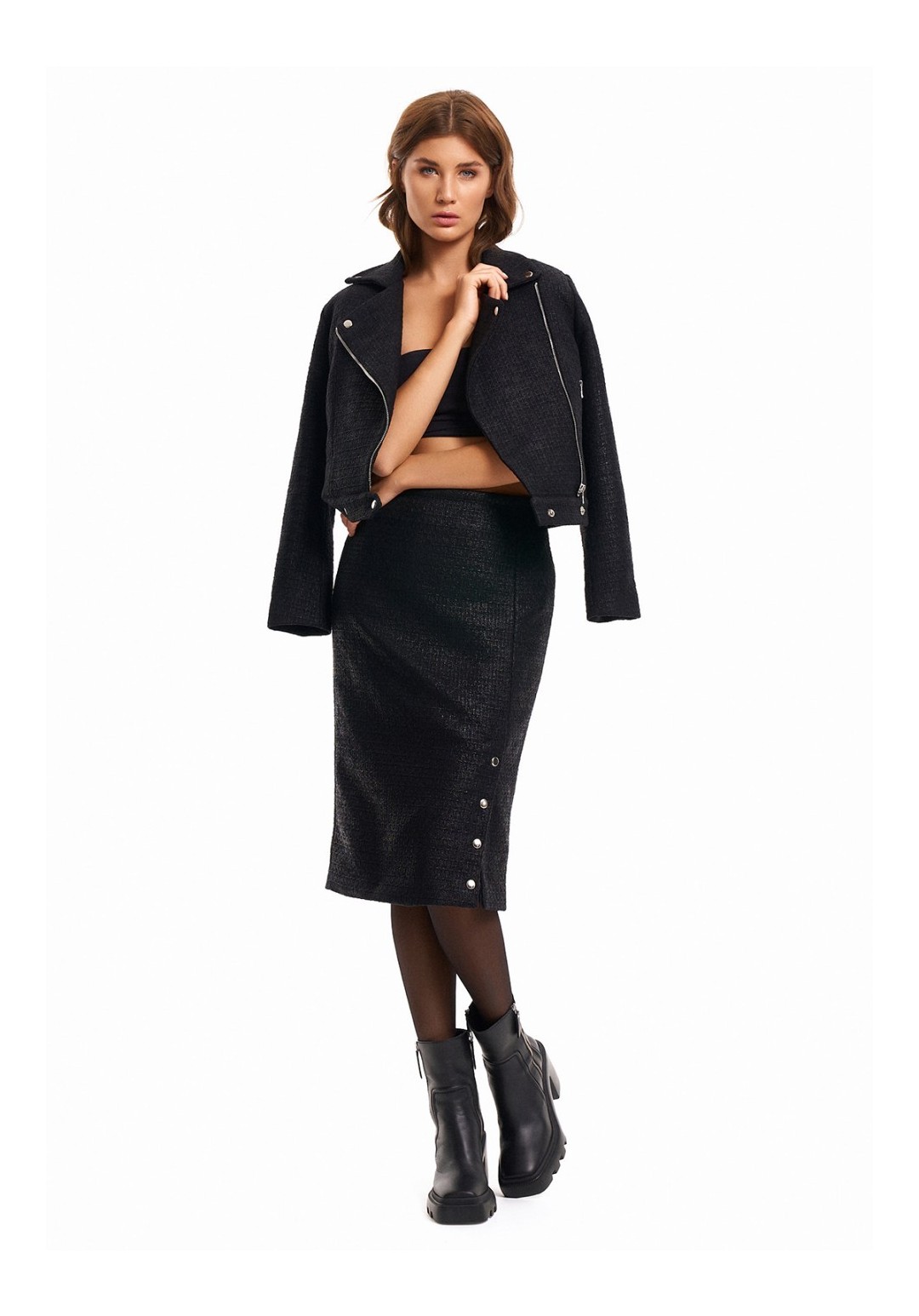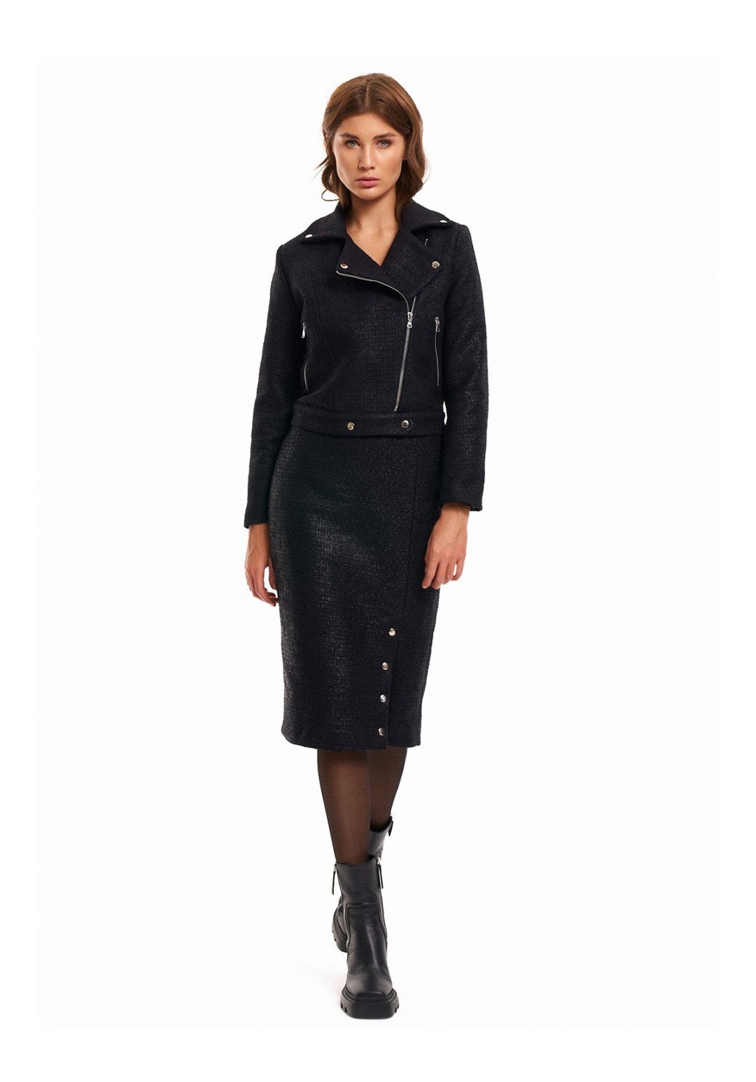 Стильный 2-х предметный комплект, состоящий из жакета и юбки. Жакет-косуха женская со смещенной застежкой на молнию, на подкладке. Перед с вертикальными рельефами и косыми прорезными карманами в рамку на молнии. Спинка с вертикальными рельефами. Рукав втачной двухшовный до линии запястья. Воротник стояче-отложной на отрезной стойке. Куртка длиной до середины бедра. По низу притачной пояс, который застегивается на 2 кнопки. В углах воротника расположены декоративные кнопки. Юбка умеренного объема, прямого силуэта, слегка зауженная книзу. Юбка без пояса, на обтачке. На переднем и заднем полотнищах юбки талиевые вытачки. На переднем полотнище с правой стороны рельеф, переходящий в шлицу. На верхней части шлицы расположены 4 кнопки: первая функциональная, остальные декоративные. На заднем полотнище средний шов с застежкой на потайную молнию. Юбка на притачной подкладке длинной ниже линии колена.