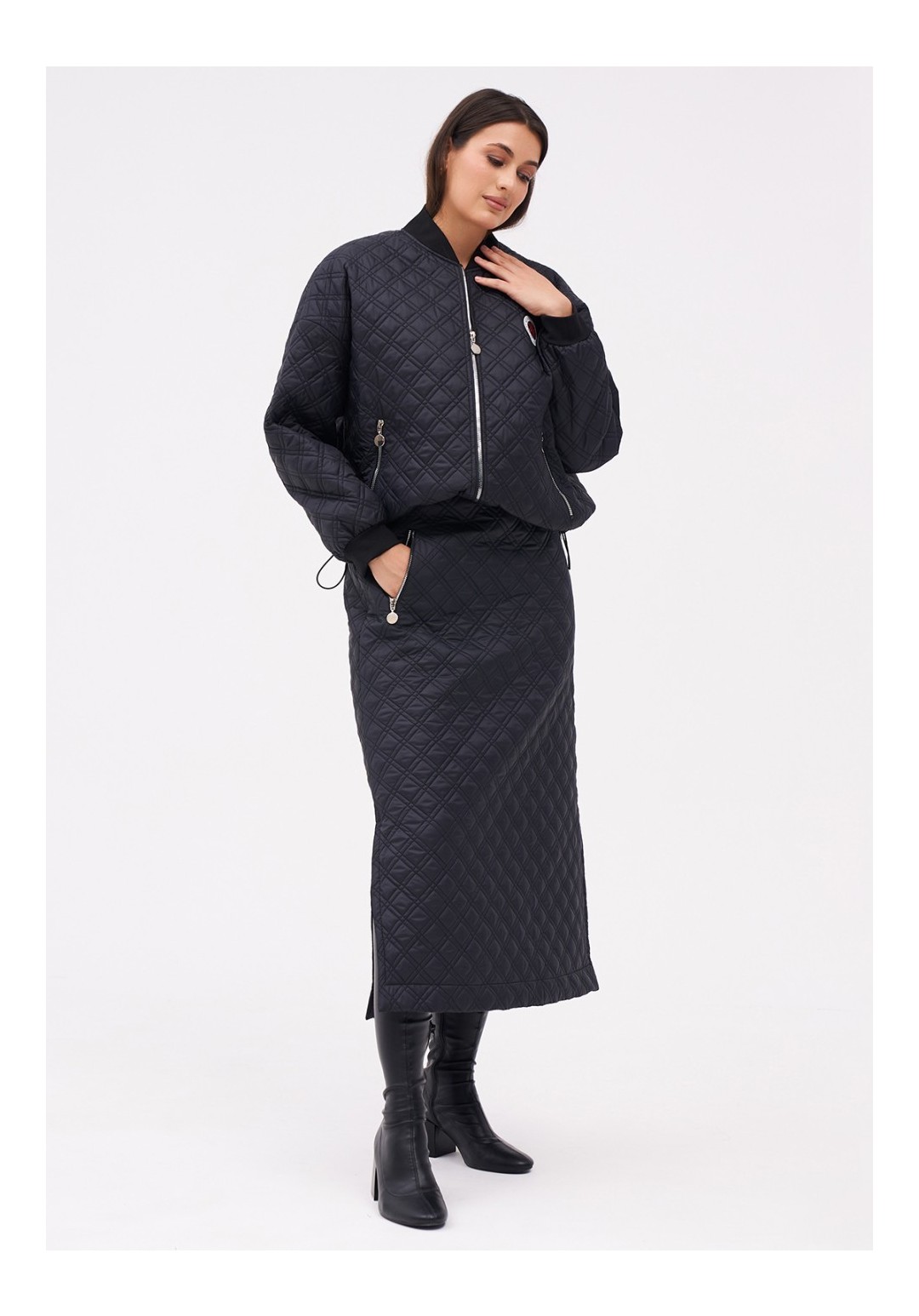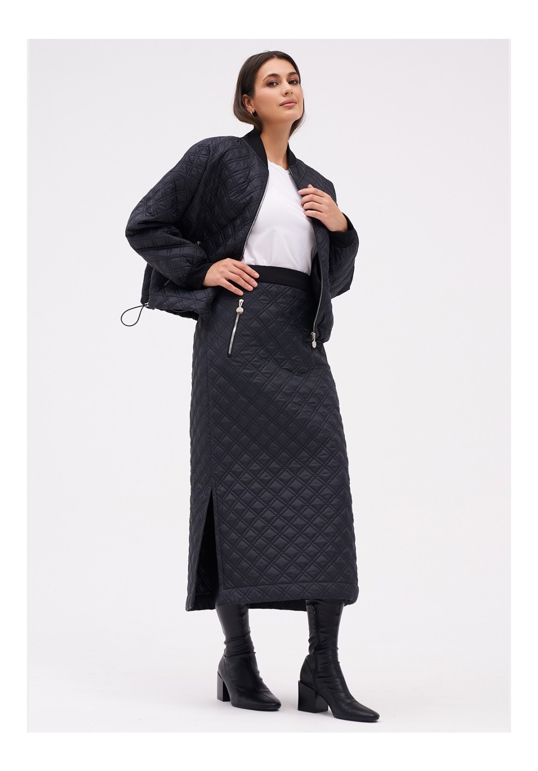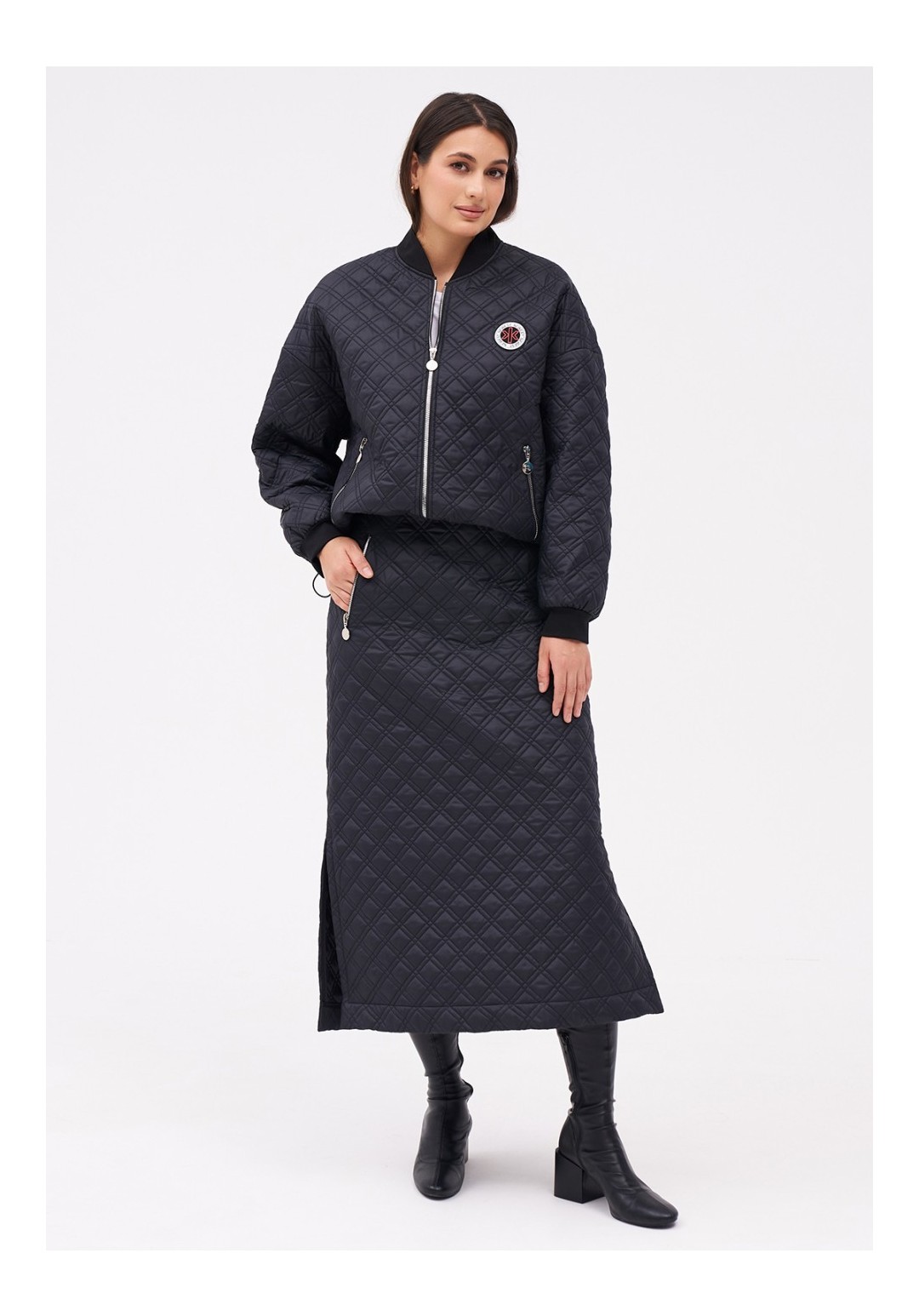 Комплект из стёганной плащёвки, состоящий из бомбера и юбки миди. Бомбер с трикотажной стойкой по горловине и манжетами. По низу на кулисе со шнуром и фиксаторами. Спереди два кармана и застёжка на металлическую молнию. На груди слева настрочен декоративный шеврон. Юбка на трикотажном поясе с карманами по переду и застёжкой на потайную молнию сбоку. Снизу по бокам разрезы.
