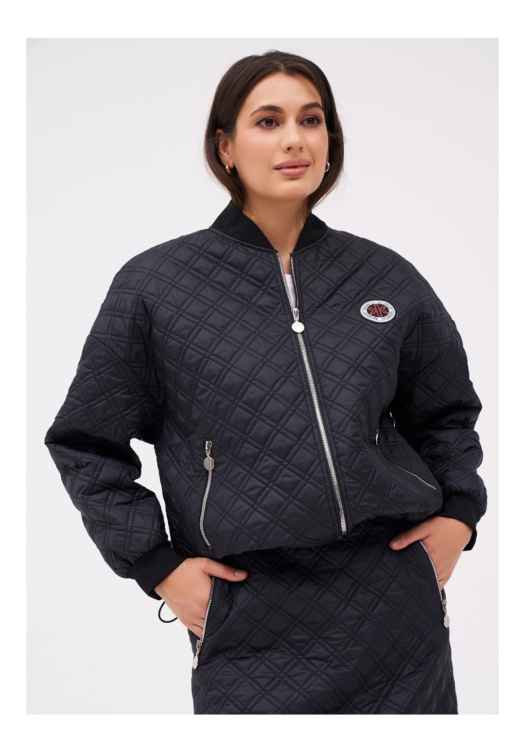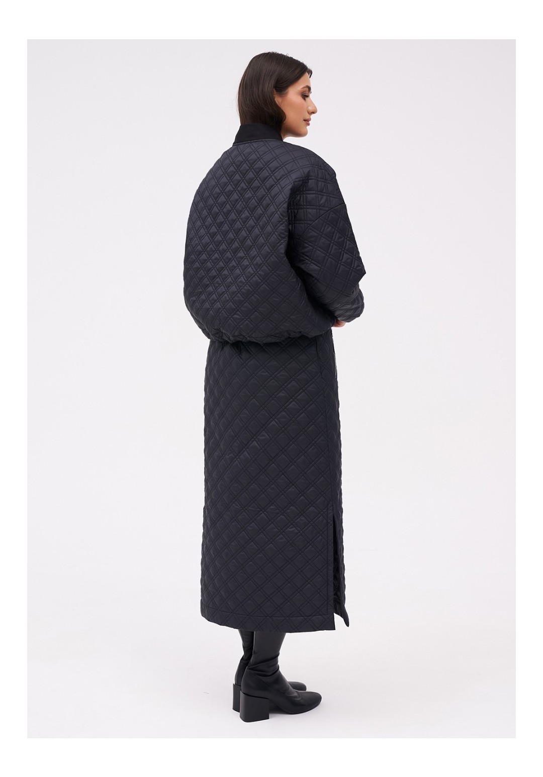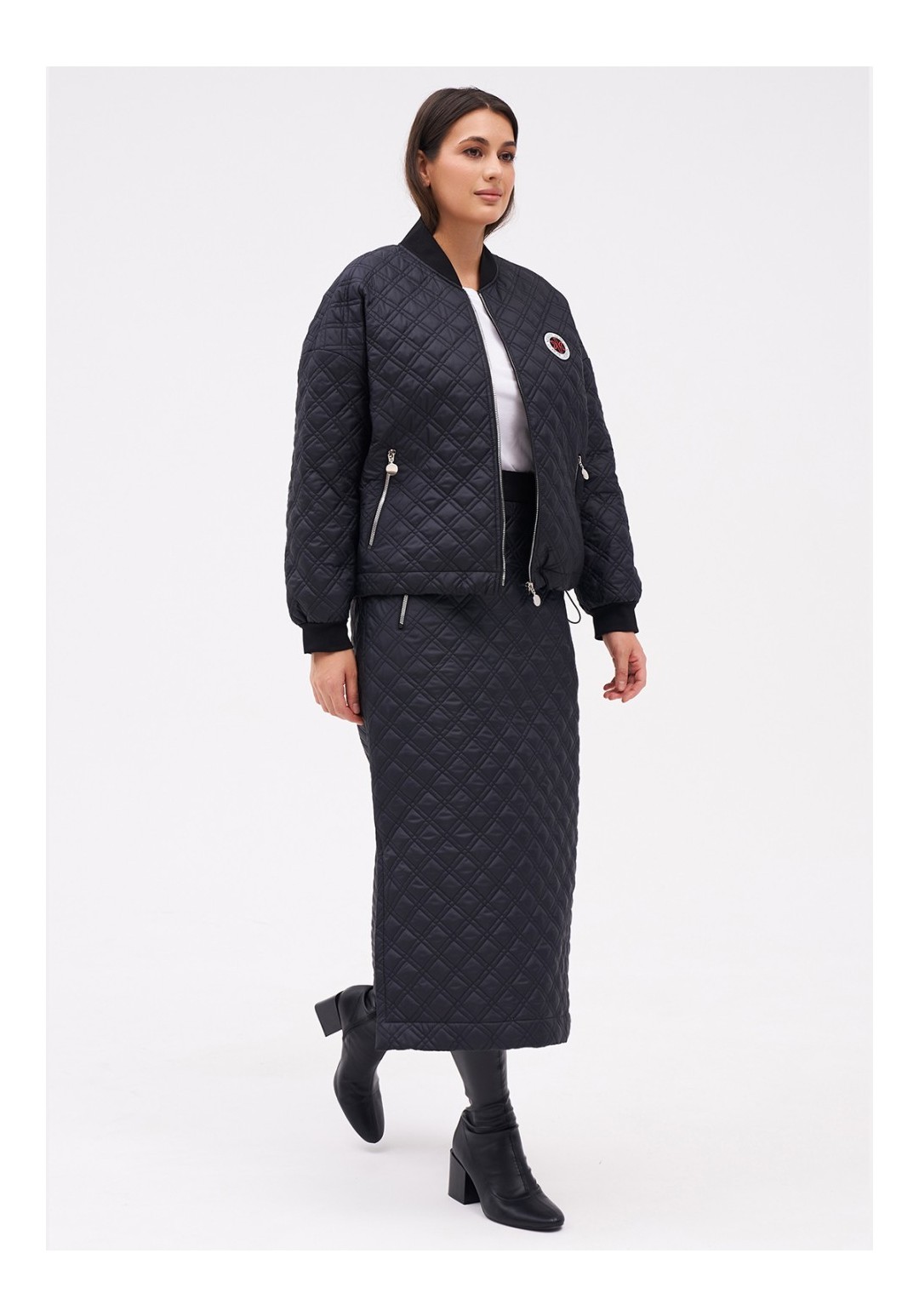 Комплект из стёганной плащёвки, состоящий из бомбера и юбки миди. Бомбер с трикотажной стойкой по горловине и манжетами. По низу на кулисе со шнуром и фиксаторами. Спереди два кармана и застёжка на металлическую молнию. На груди слева настрочен декоративный шеврон. Юбка на трикотажном поясе с карманами по переду и застёжкой на потайную молнию сбоку. Снизу по бокам разрезы.