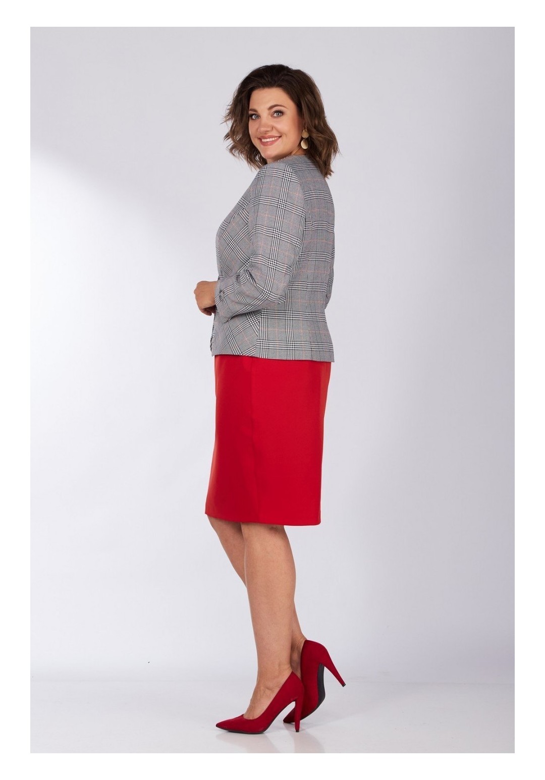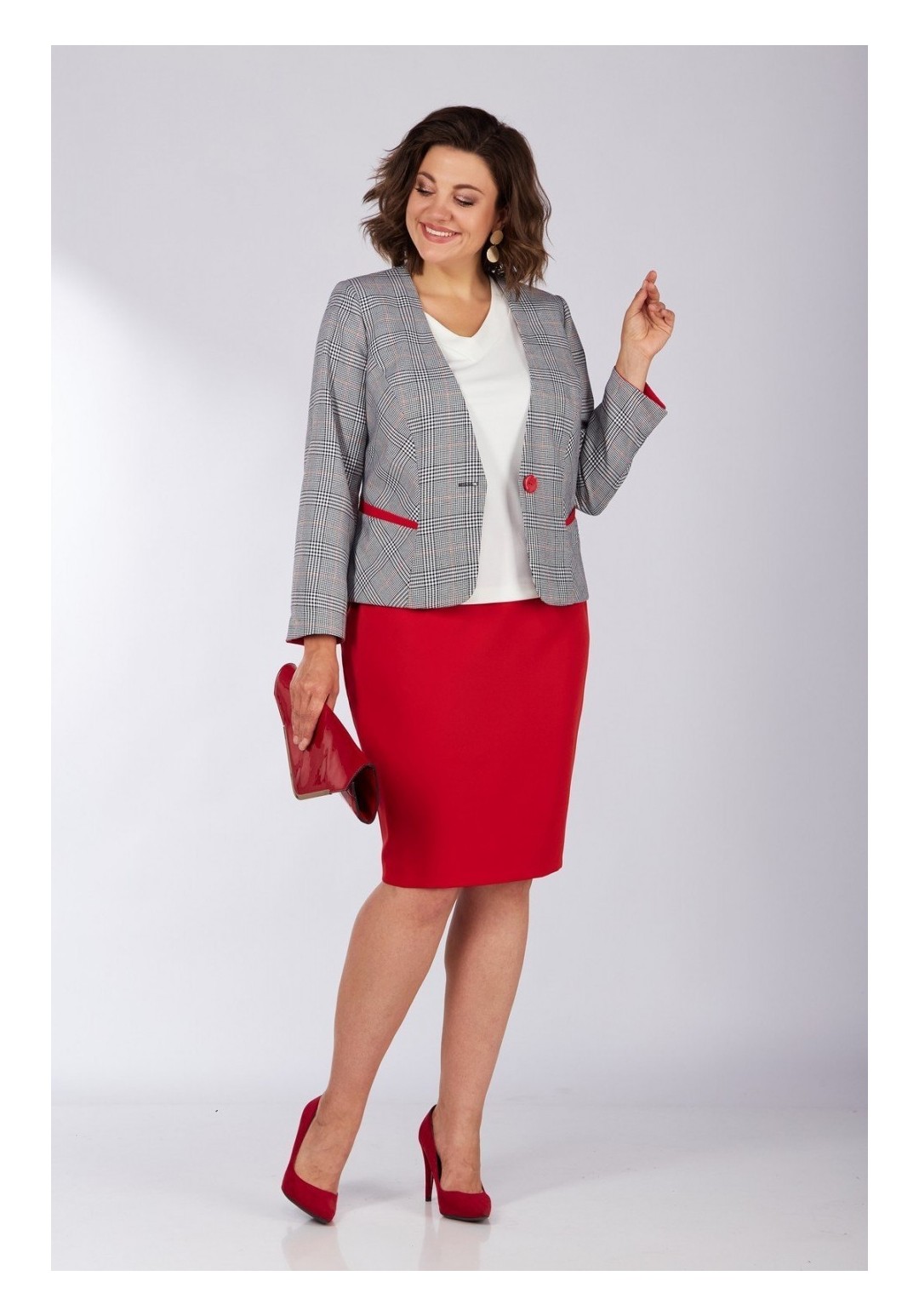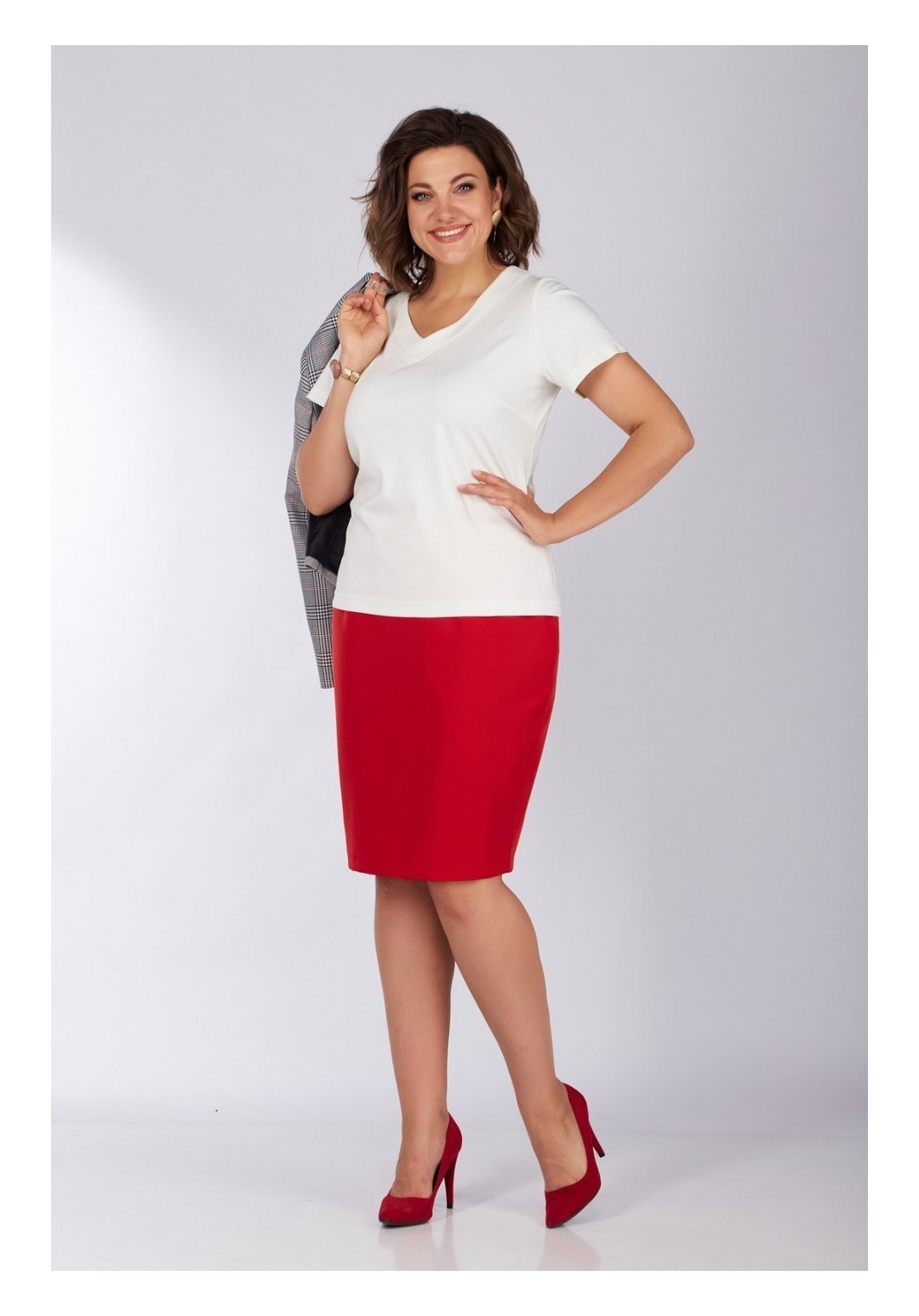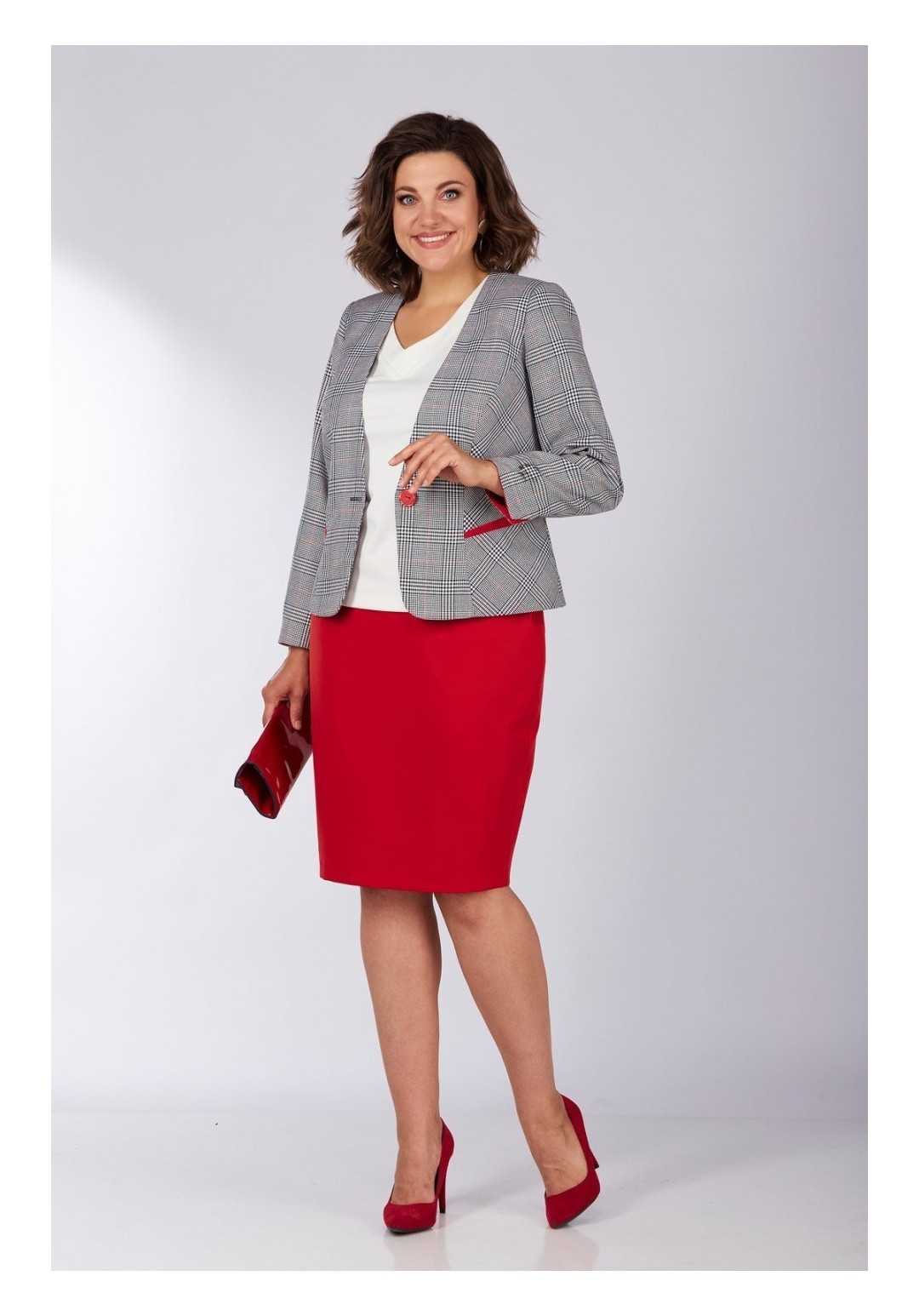 Элегантный дизайн костюма с жакетом подарит комфорт и уверенность в себе. Выполненный из комфортной костюмной ткани. Жакет приталенного силуэта длиной до линии бедер, с застежкой на одну пуговицу на линии талии. Горловина глубокая V-образная, край борта по низу закругленный. Полочки декорированы листочками из отделочной ткани. Рукав три четверти с разрезами в локтевом шве. Низ рукава обработан обтачкой из отделочной ткани, позволяющей отвернуть рукав в виде манжета. На подкладке. Юбка-карандаш на поясе-обтачке. Сзади застежка-молния и разрез по низу юбки. На подкладке. Топ из стрейчевой ткани с рукавом. Горловина V-образная обработанная планкой. длина жакета-55см длина рукава-57см длина юбки-60см длина майки-60см. Юбка ПЭ 49% вискоза 48% спандекс 3% длина майки-60см длинна рукава-20см Майка ПЭ96%, эластан 4% об груди-50р-97,52р-101,54р-105,56р-109 об талии-50р-90,52р-94,54р-98,56р-102 об бедер-50р-105,52р-109,54р-113,56р-117 об плеча-50р-37,52р-38,54р-40,56р-42