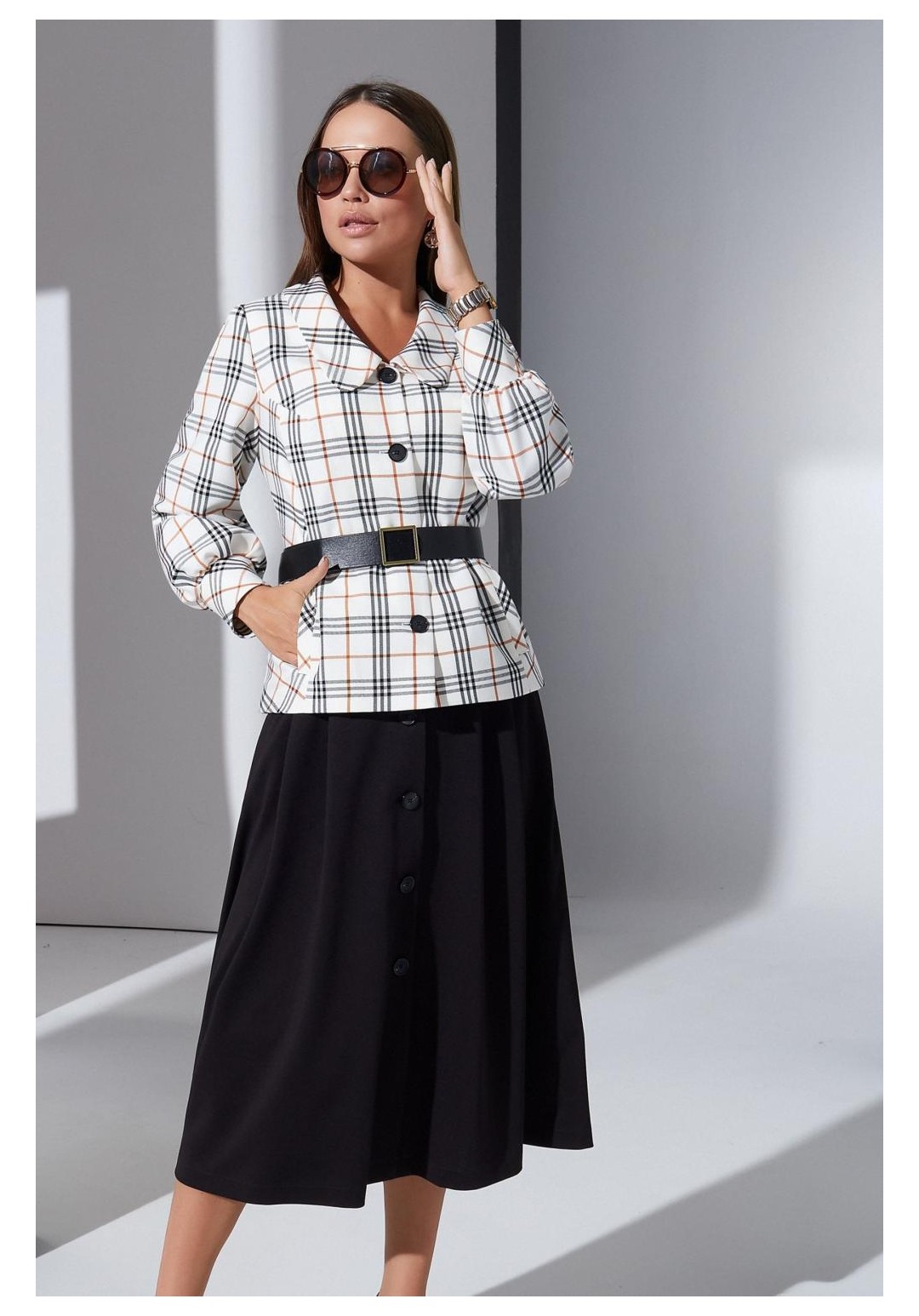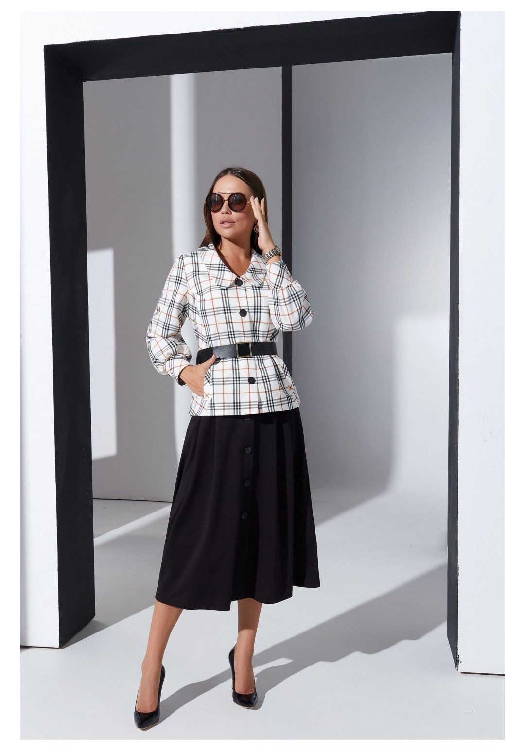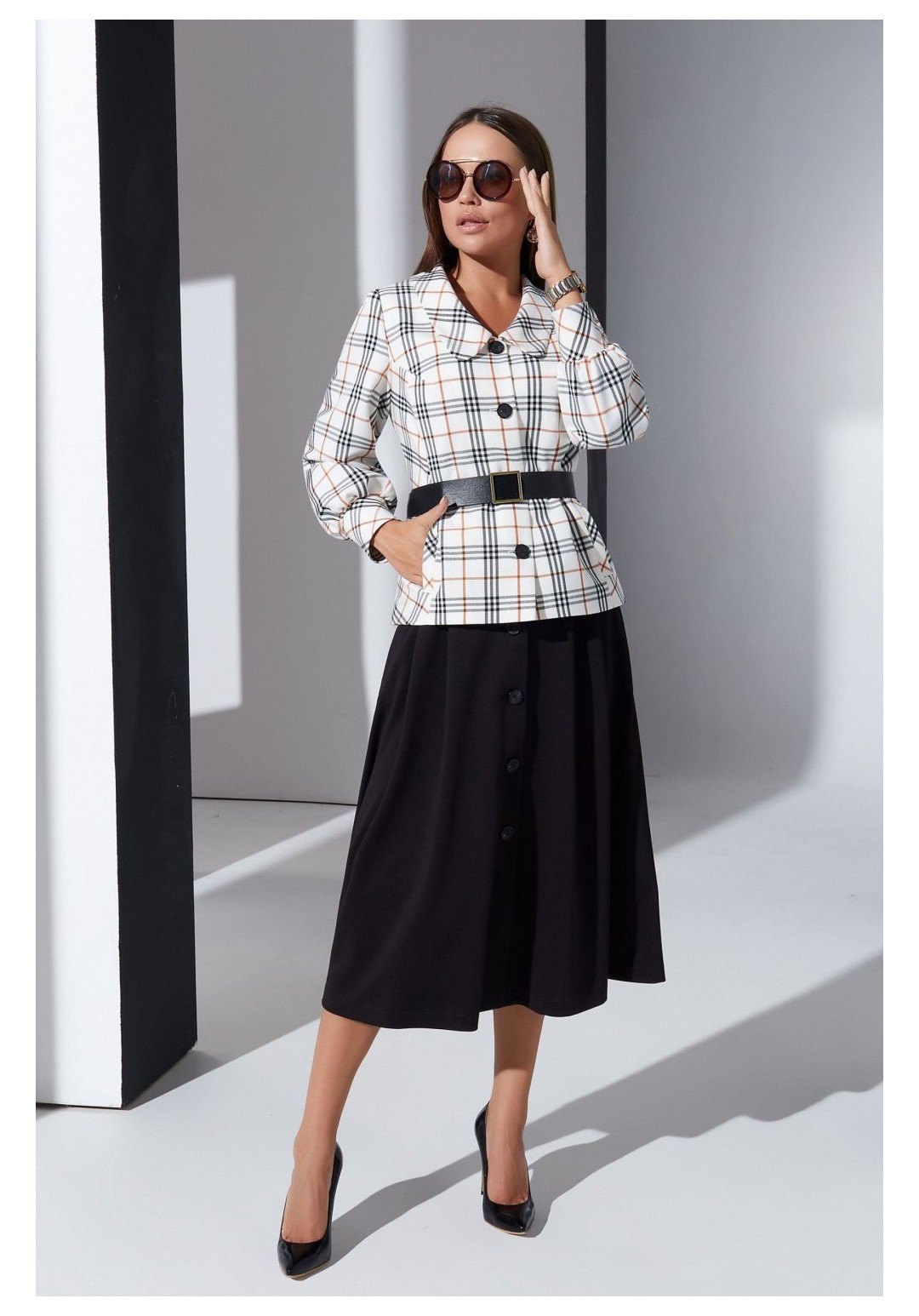 Костюм юбочный Жакет со стояче – отложным воротником, ремнём по талии и центральной застёжкой на петли и пуговицы. Перед с карманами с листочками в нижней части. Спинка с талиевыми вытачками. Рукава втачные с манжетами по низу. Жакет на подкладке. Юбка на притачном поясе. Переднее полотнище с застёжкой на петли и пуговицы, наклонными карманами к боковым швам и складками от пояса. Заднее полотнище со складками от пояса. Юбка на подкладке. ВОЗМОЖНА ЗАМЕНА ФУРНИТУРЫ НА АНАЛОГИЧНУЮ ТАКОГО ЖЕ КАЧЕСТВА.