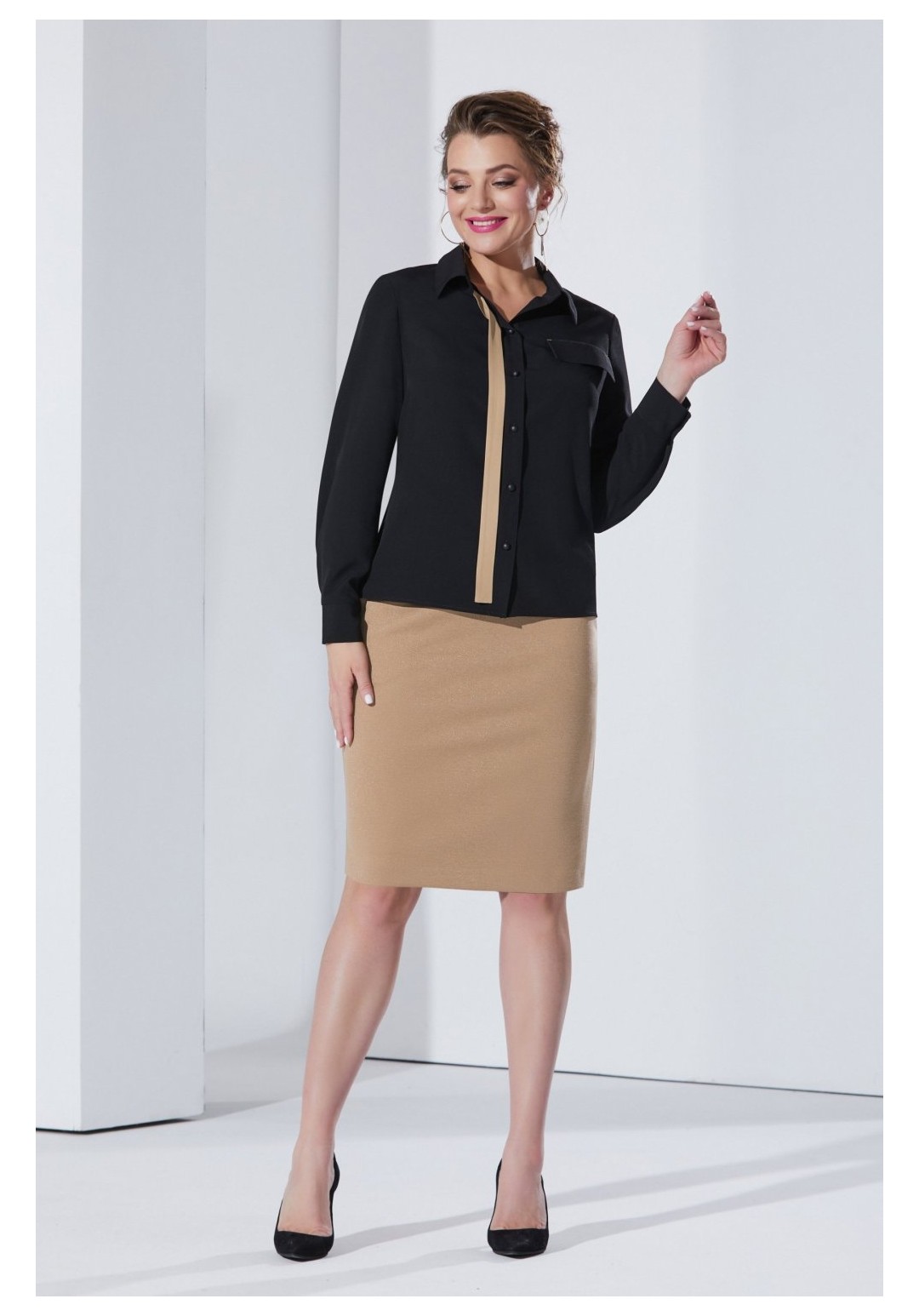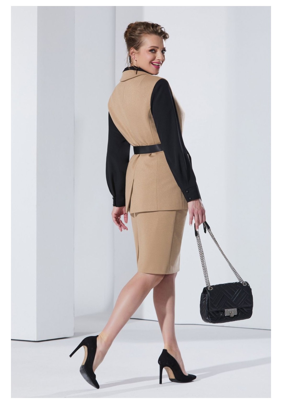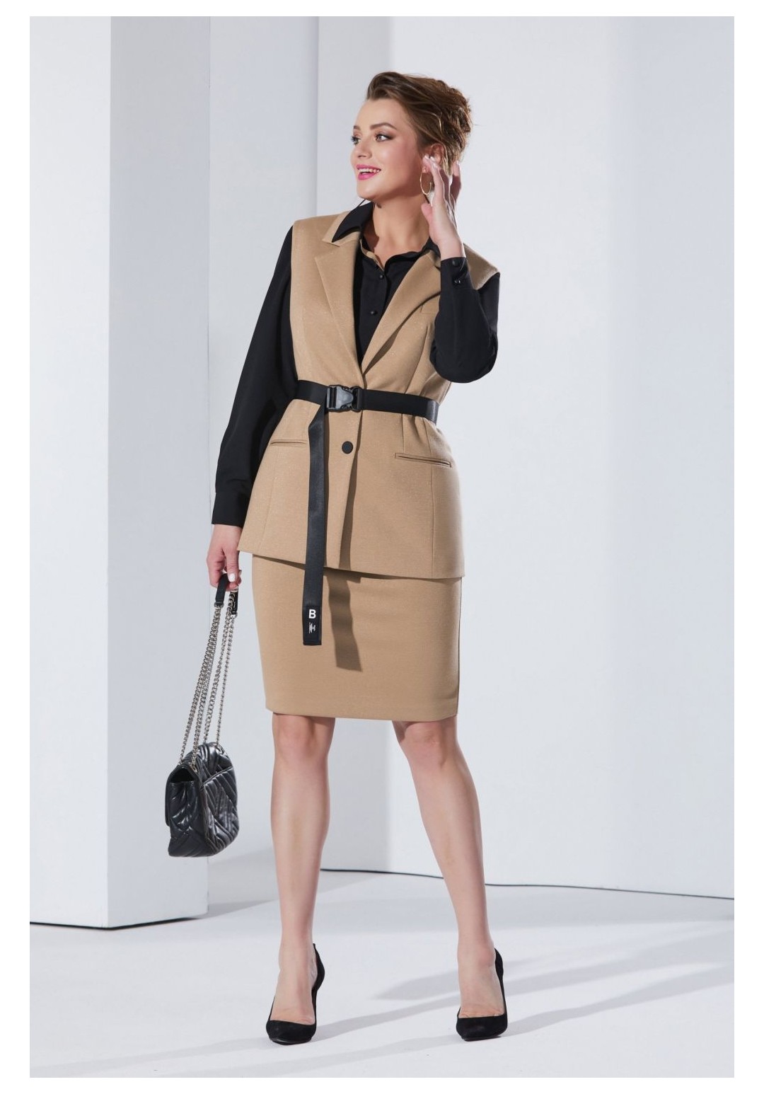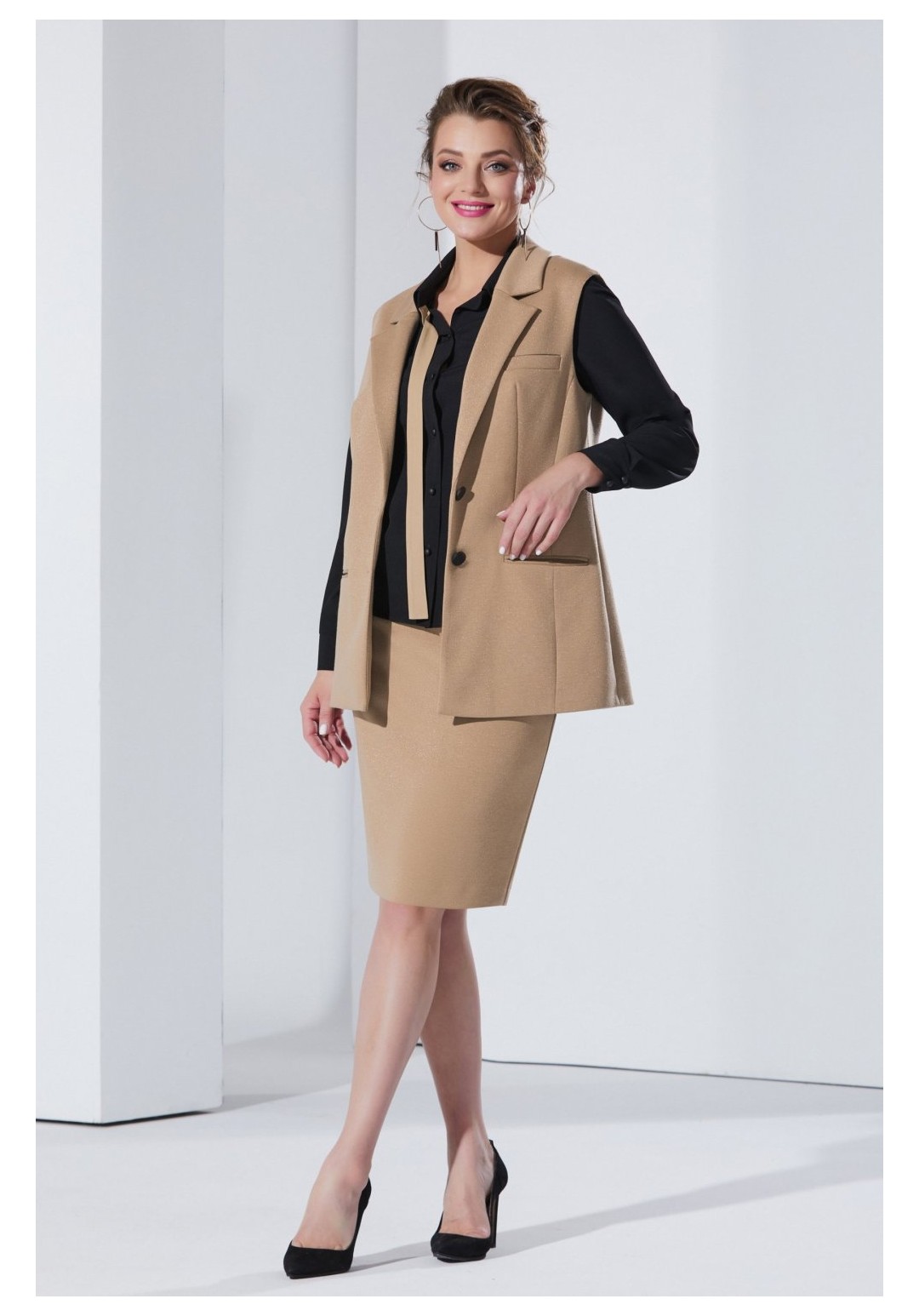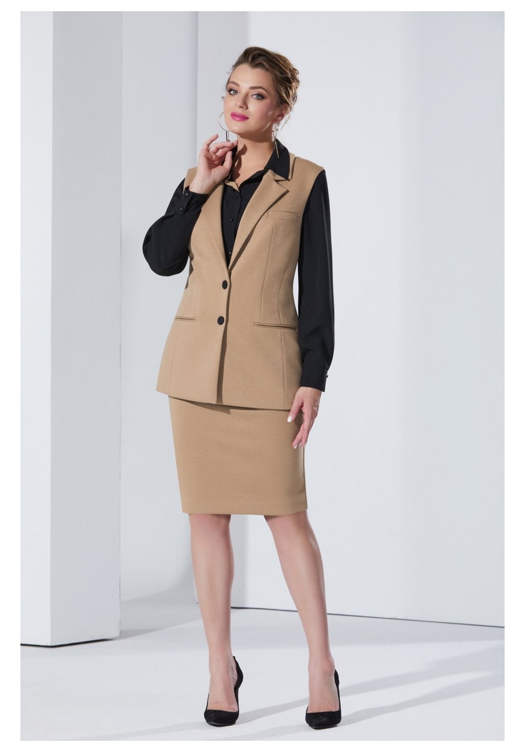 Костюм юбочный Жилет со стояче-отложным воротником и центральной застёжкой на петли и пуговицы. Перед с рельефами и карманами в нижней части. Спинка с рельефами и шлицей в среднем шве. На уровне талии съёмный пояс. Изделие на подкладке. Блуза со стояче – отложным воротником и центральной застёжкой на петли и пуговицы. Изделие с декоративной деталью в верхней части края борта. Перед с клапаном в верхней части. Рукава втачные, с манжетами и застёжкой на пуговицы. Юбка на притачном поясе. Переднее полотнище с наклонными карманами к боковым швам. Заднее полотнище со шлицей и потайной молнией в среднем шве. Юбка на подкладке. ВОЗМОЖНА ЗАМЕНА ФУРНИТУРЫ НА АНАЛОГИЧНУЮ ТАКОГО ЖЕ КАЧЕСТВА.