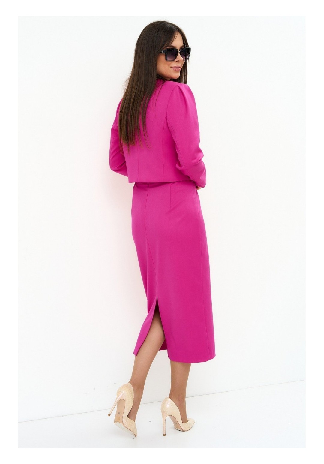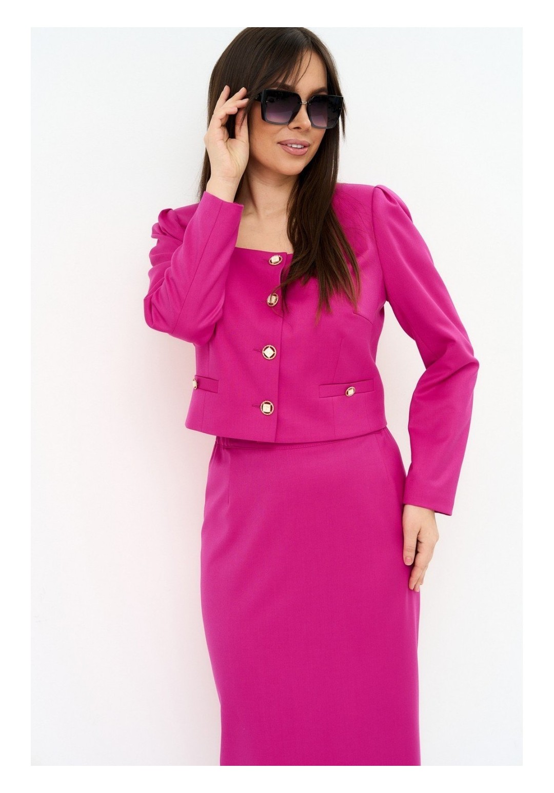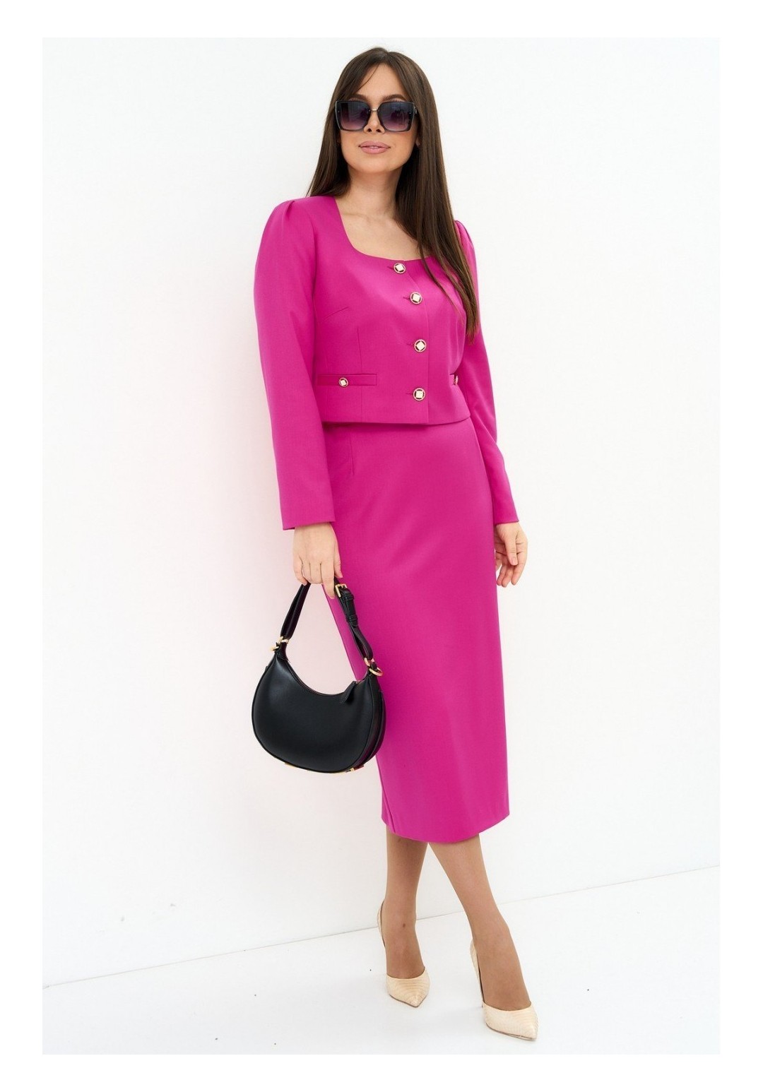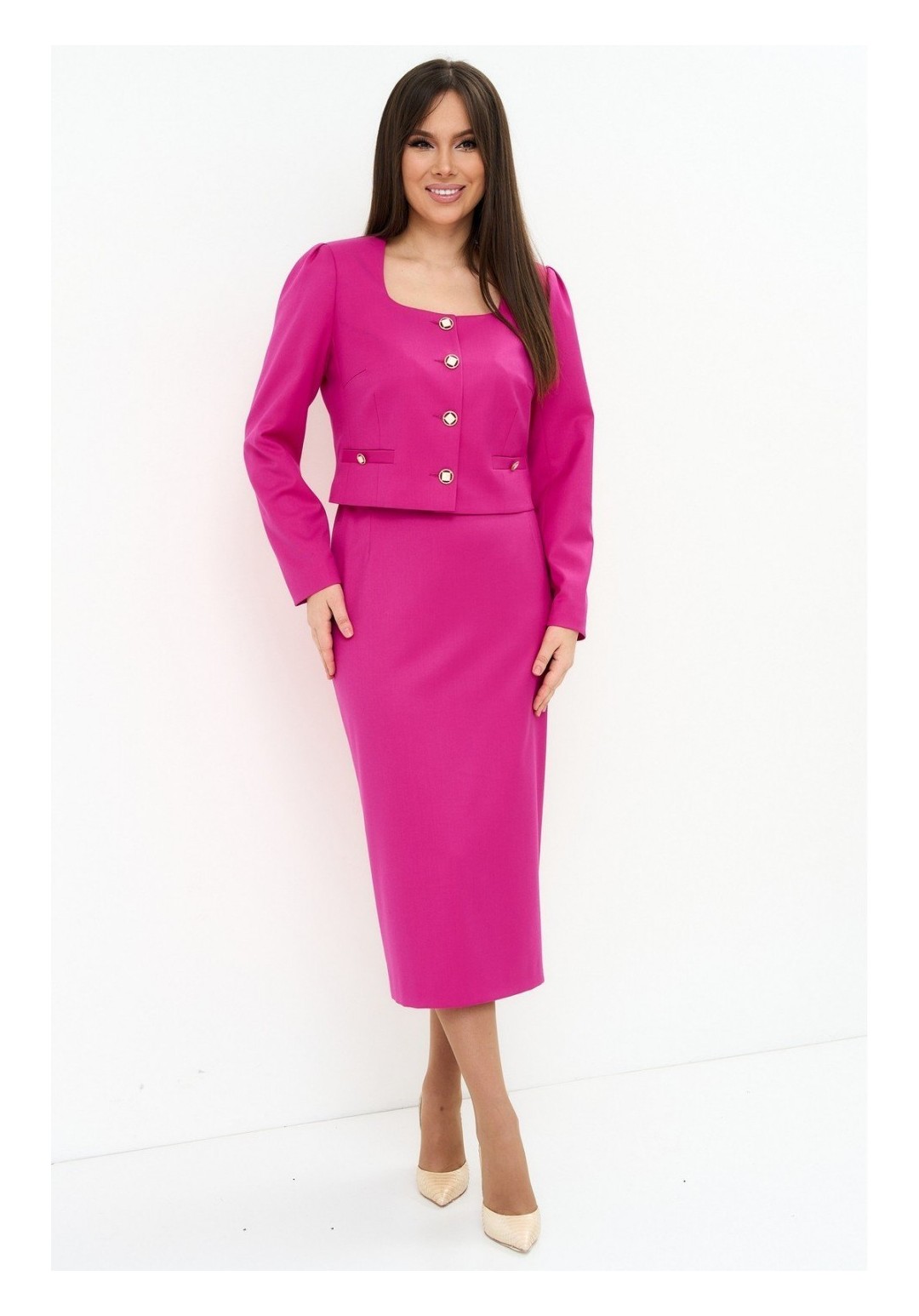 Элегантный комплект из жакета и юбки. Укороченый жакет полуприталенного силуэта , на подкладке. Рукав втачной. Застежка центральная на пришивные пуговицы. Юбка -миди классического кроя, слегка заужена книзу. Пояс притачной, дополнен эластичной тесьмой. Застежка по спинке на потайную молнию. Длина жакета от плечевого шва 48см. Длина рукава 60см. Длина юбки 79 см.