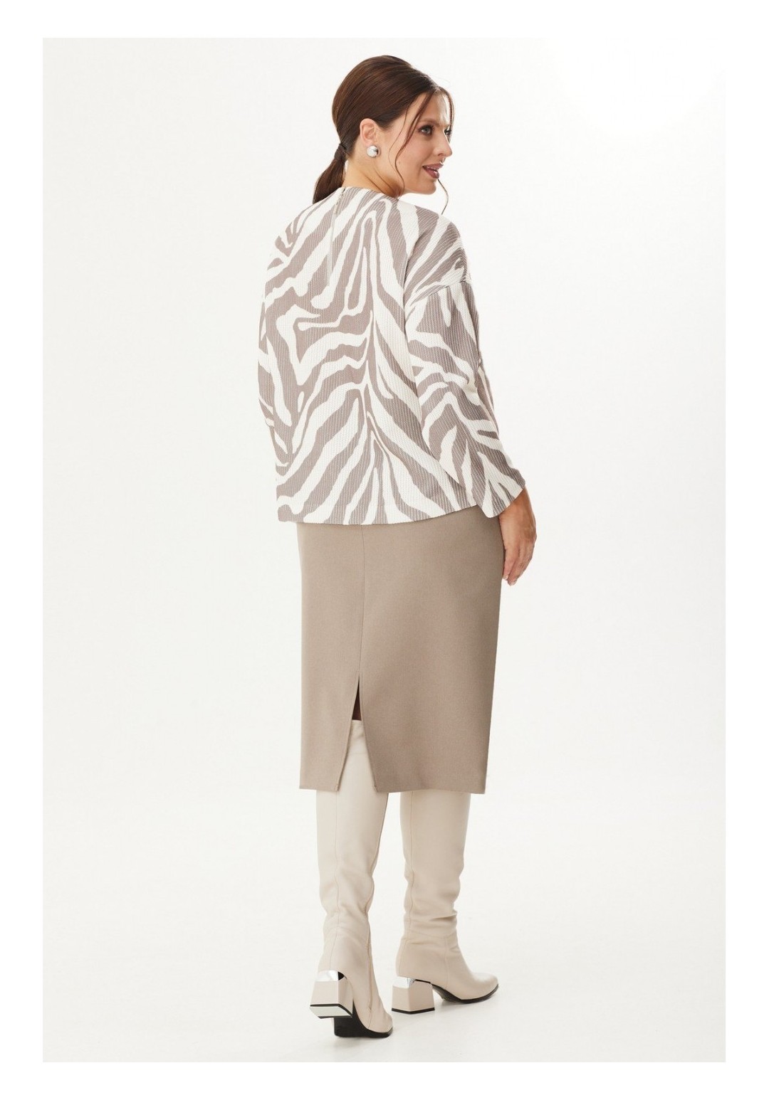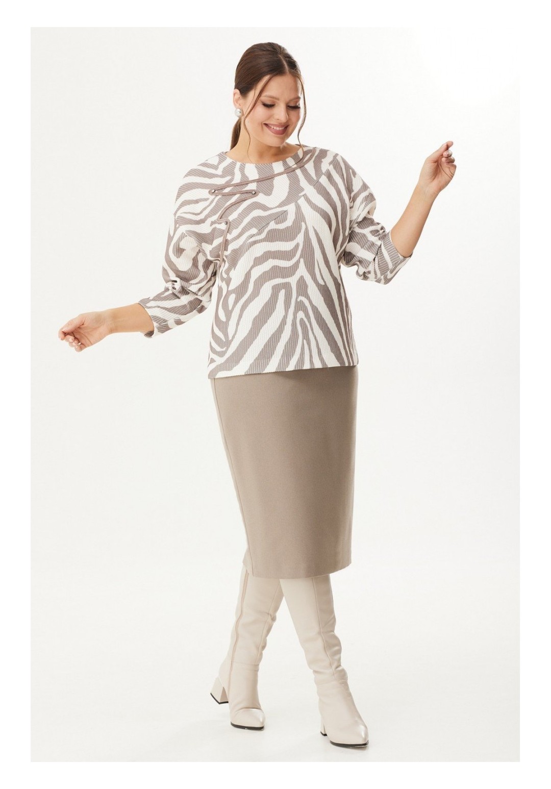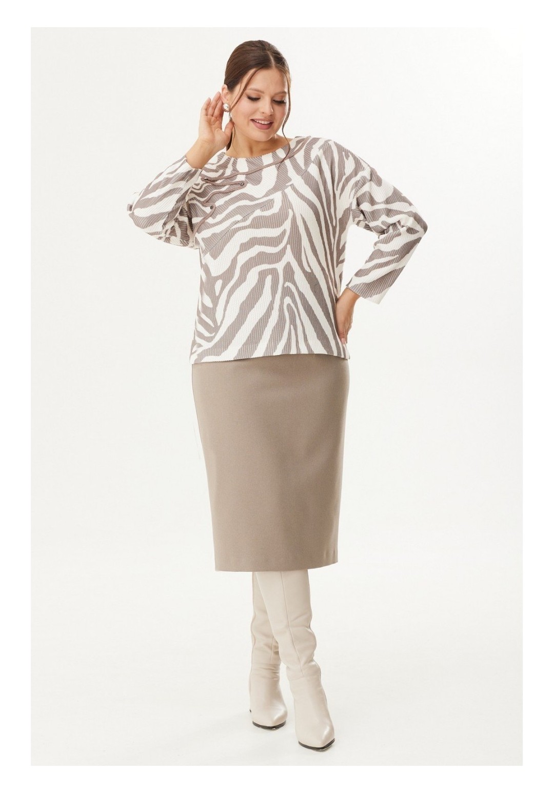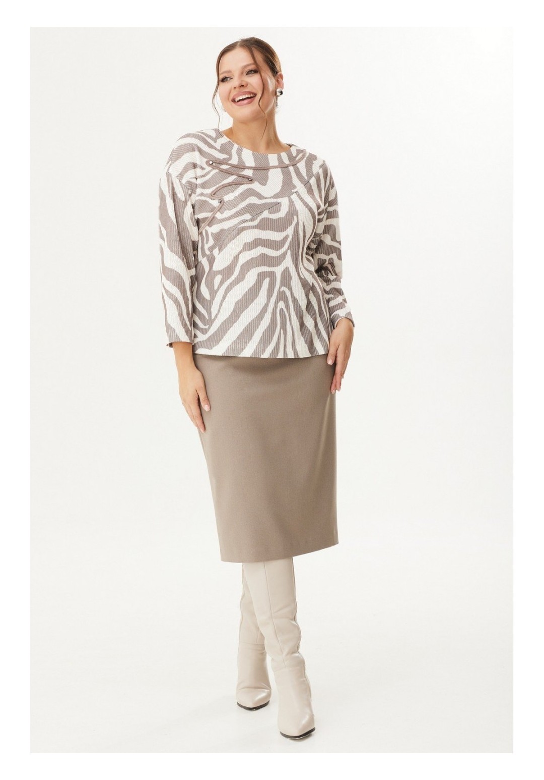Элегантный комплект из блузы и юбки в бежевых тонах. Блуза . свободного кроя со спущенным рукавом. Выполнена из фактурного трикотажного полотна средней плотности. Горловина округлой формы. По груди отделка декоративной тесьмой и бусинами. По спинке застежка на металлическую молнию. Юбка прямого классического кроя на подкладке. По спинке застежка на потайную молнию. Длина блузы от плечевого шва 61см. Длина рукава 56см. Длина юбки 74см.