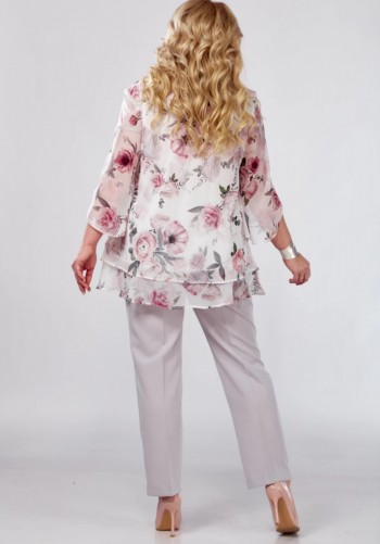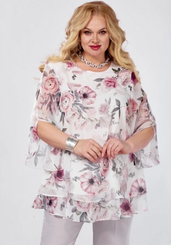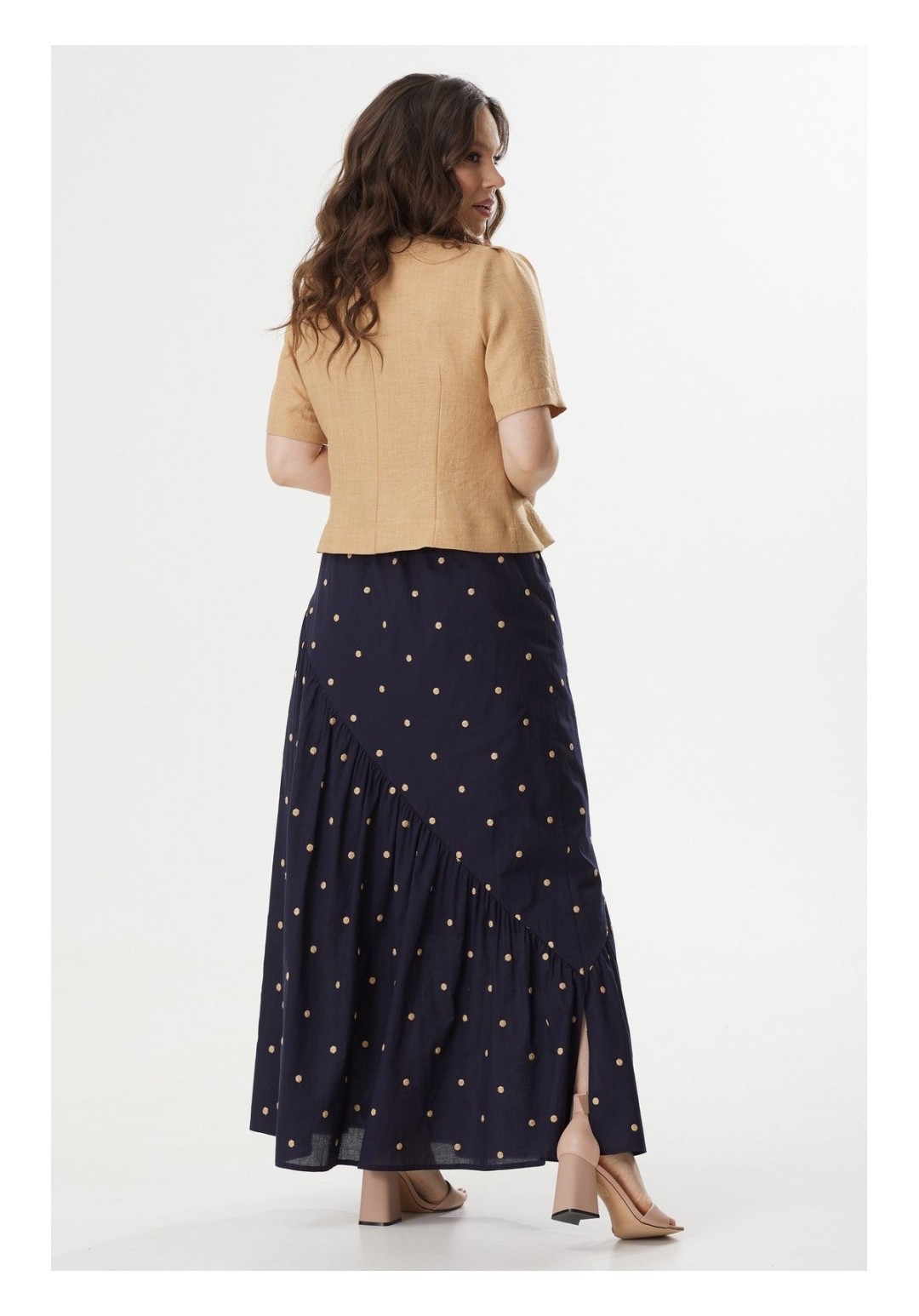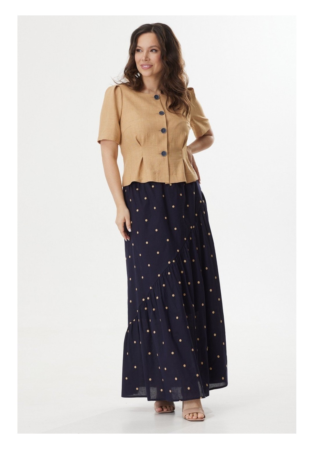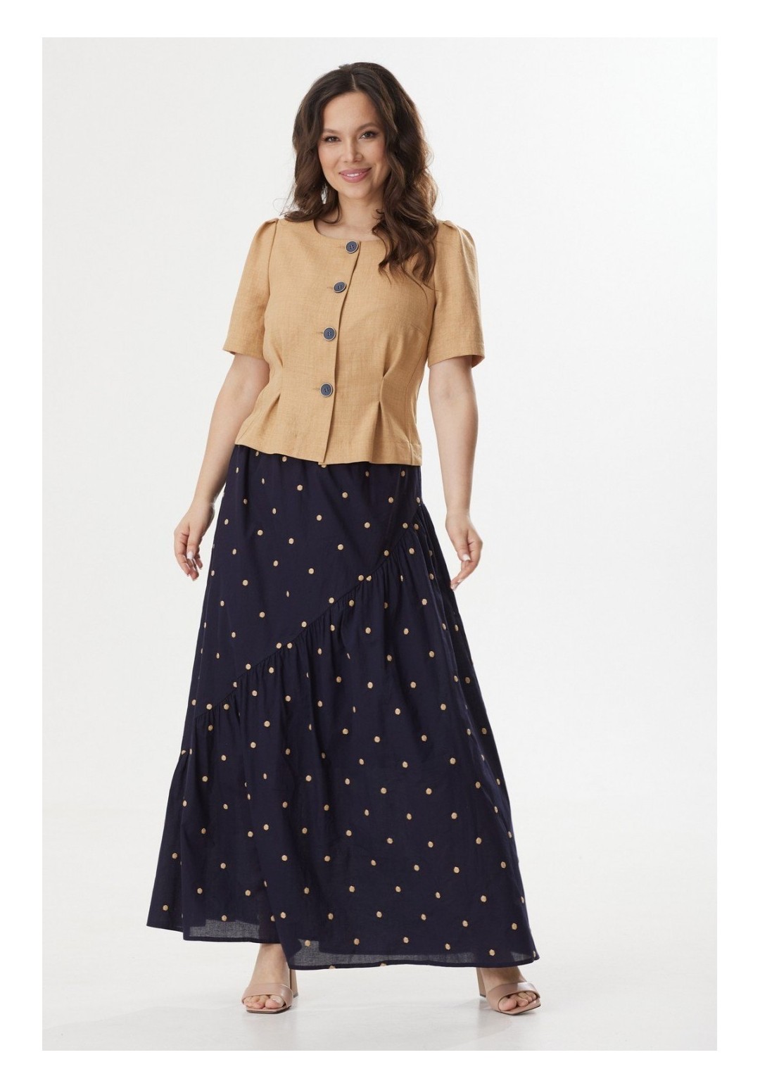 Элегантный костюм из легкого жакета и юбки. Жакет полуприлегающего силуэта с центральной застежкой на пришивные пуговицы. Выполнен из комфортной поливискозной ткани. Горловина округлой формы Рукав втачной, длина выше локтя. Юбка А-силуэта на хлопковой подкладке, по талии дополнена эластичной тесьмой. Выполнена из хлопоковой ткани. Длина жакета от плечевого шва 53 см. Длина рукава 30см. Длина юбки 95см.