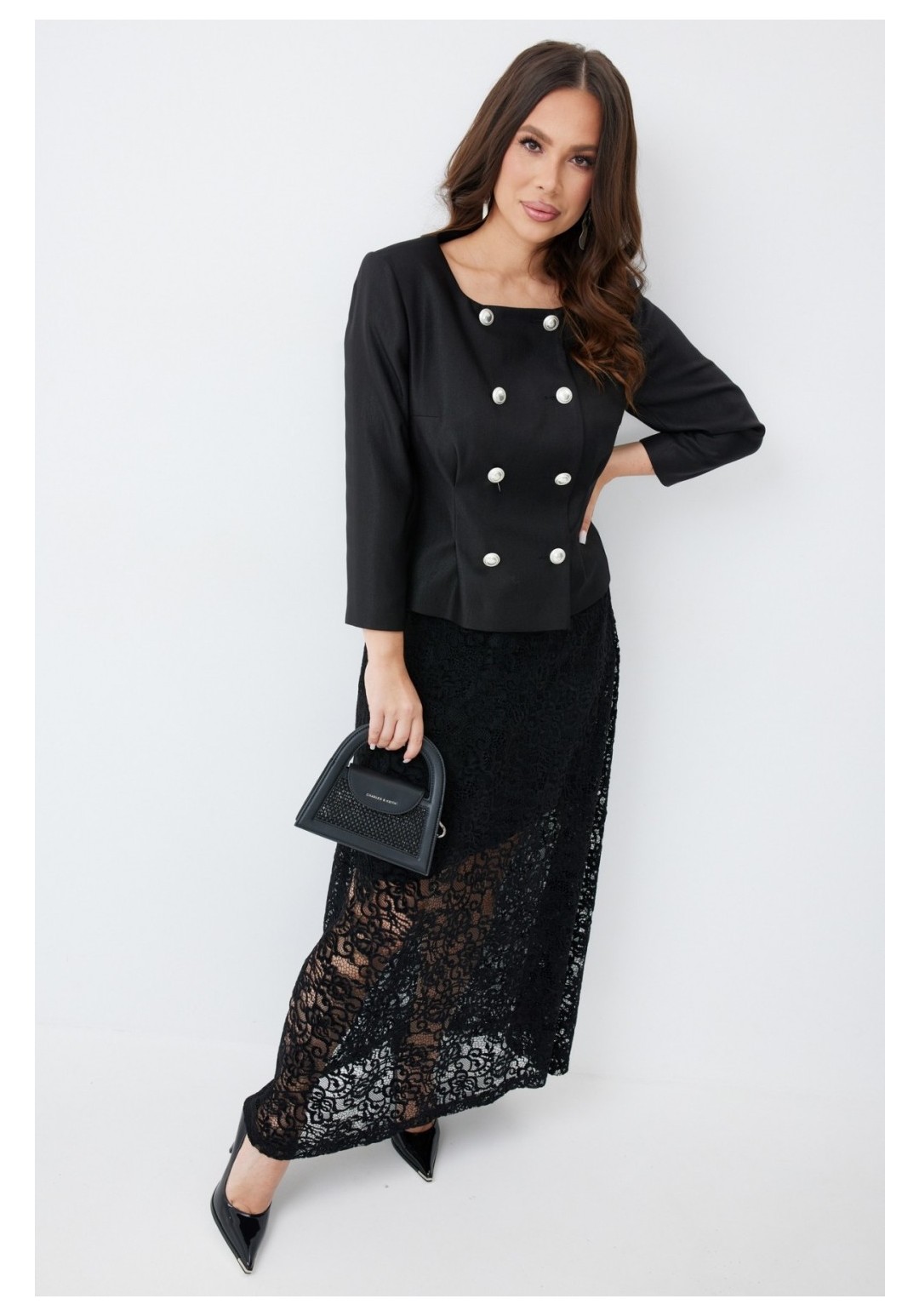 Нарядный комплект из жакета и кружевной юбки. Двубортный жакет полуприлегающего силуэта, на подкладке. Рукав длинный, втачной. Центральная застежка на красивые пришивные пуговицы. Юбка А-образного силуэта. Выполнена из красивого бархатного кружева на комфортной к телу подкладке. Юбка с притачным поясом, дополненным эластичной тесьмой. Застежка на потайную молнию и пуговицу. Длина жакета от плечевого шва 53см. Длина рукава 54см. Длина юбки 94см.