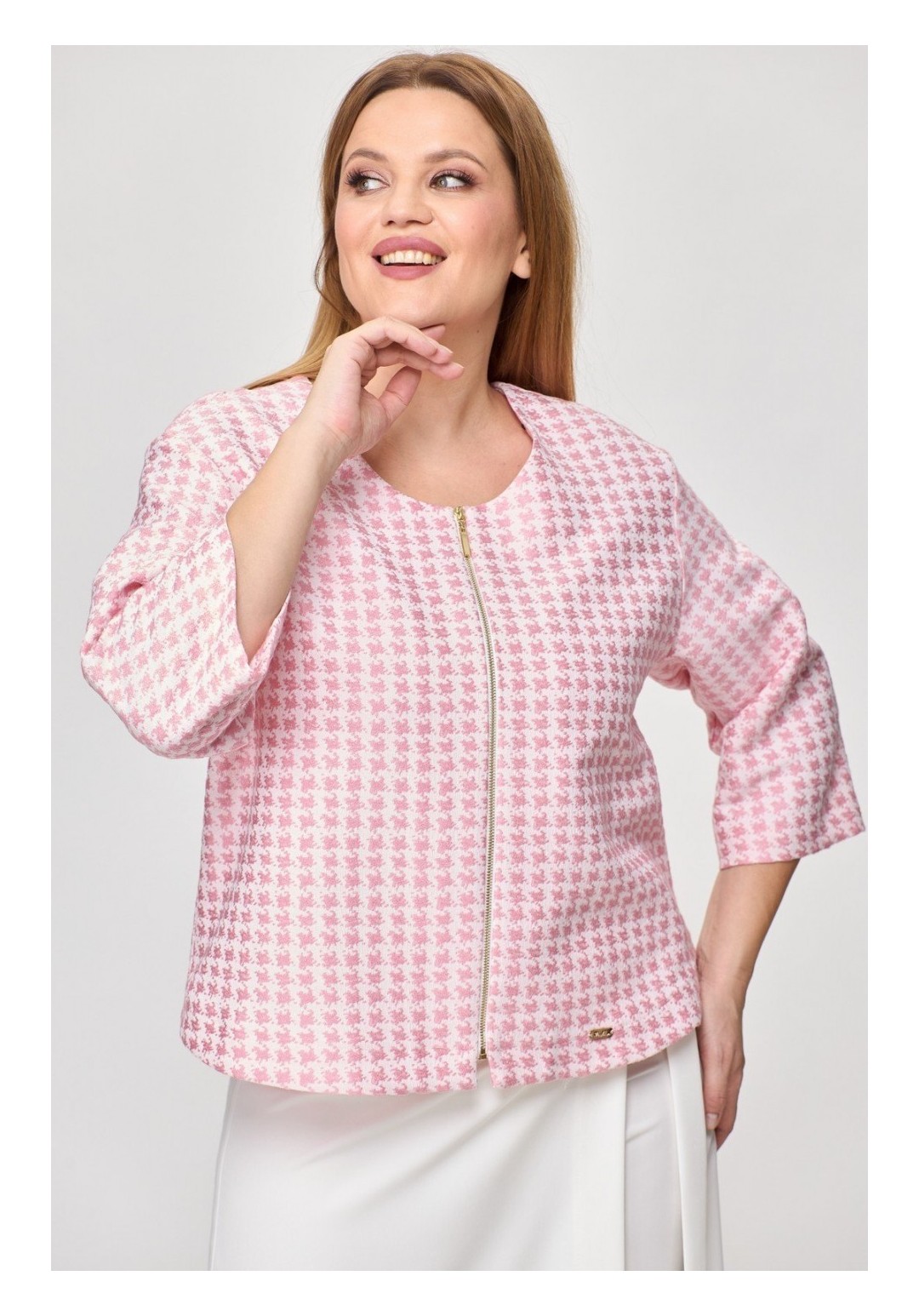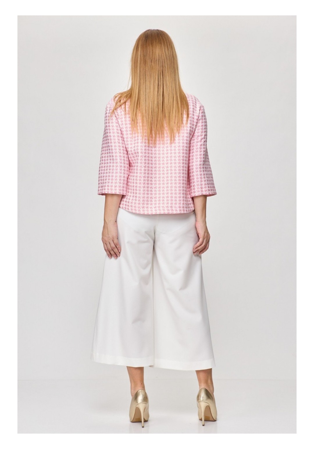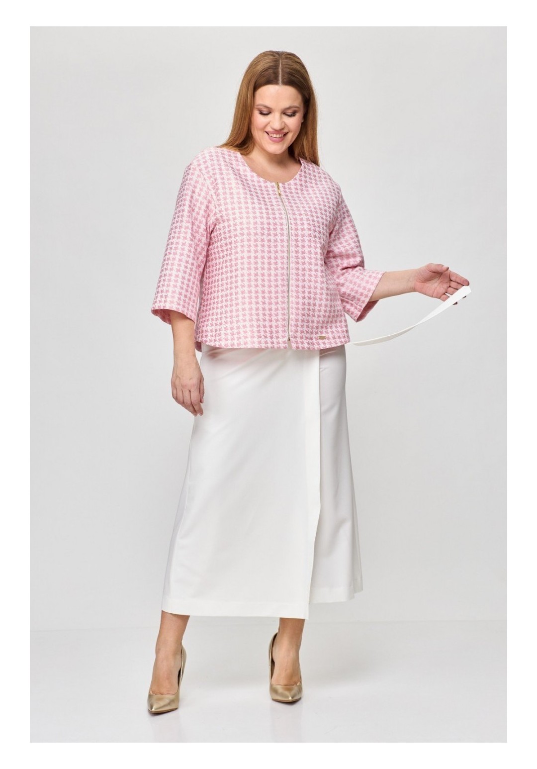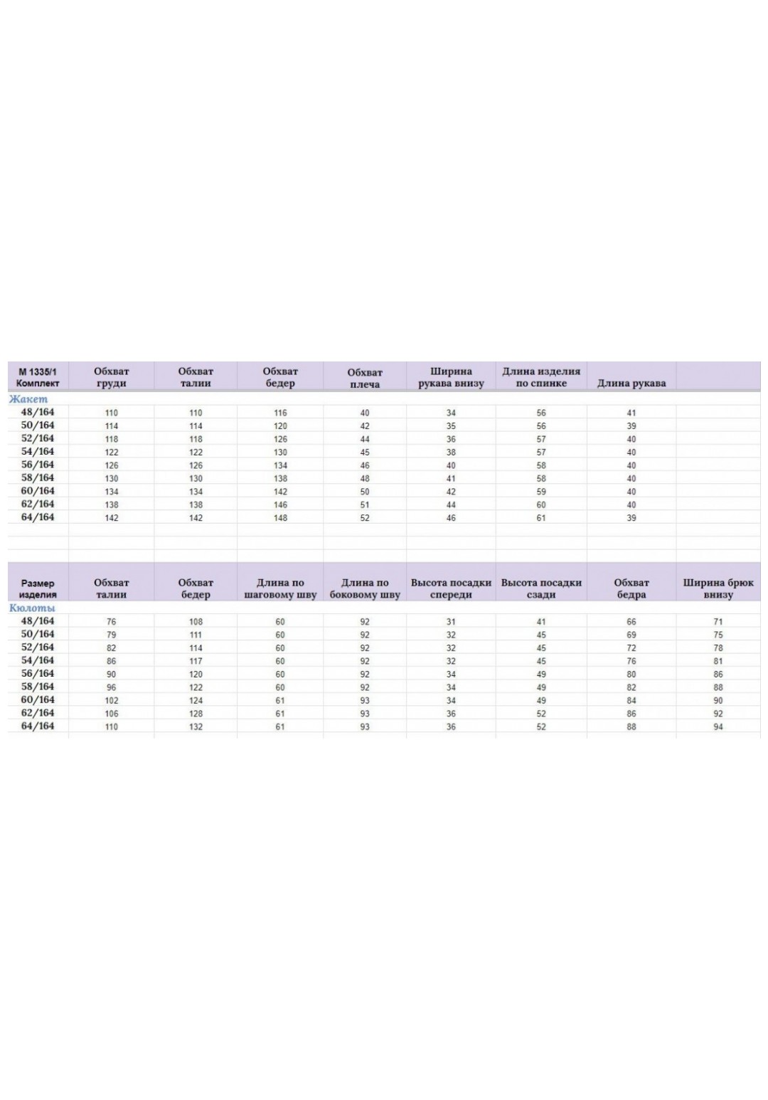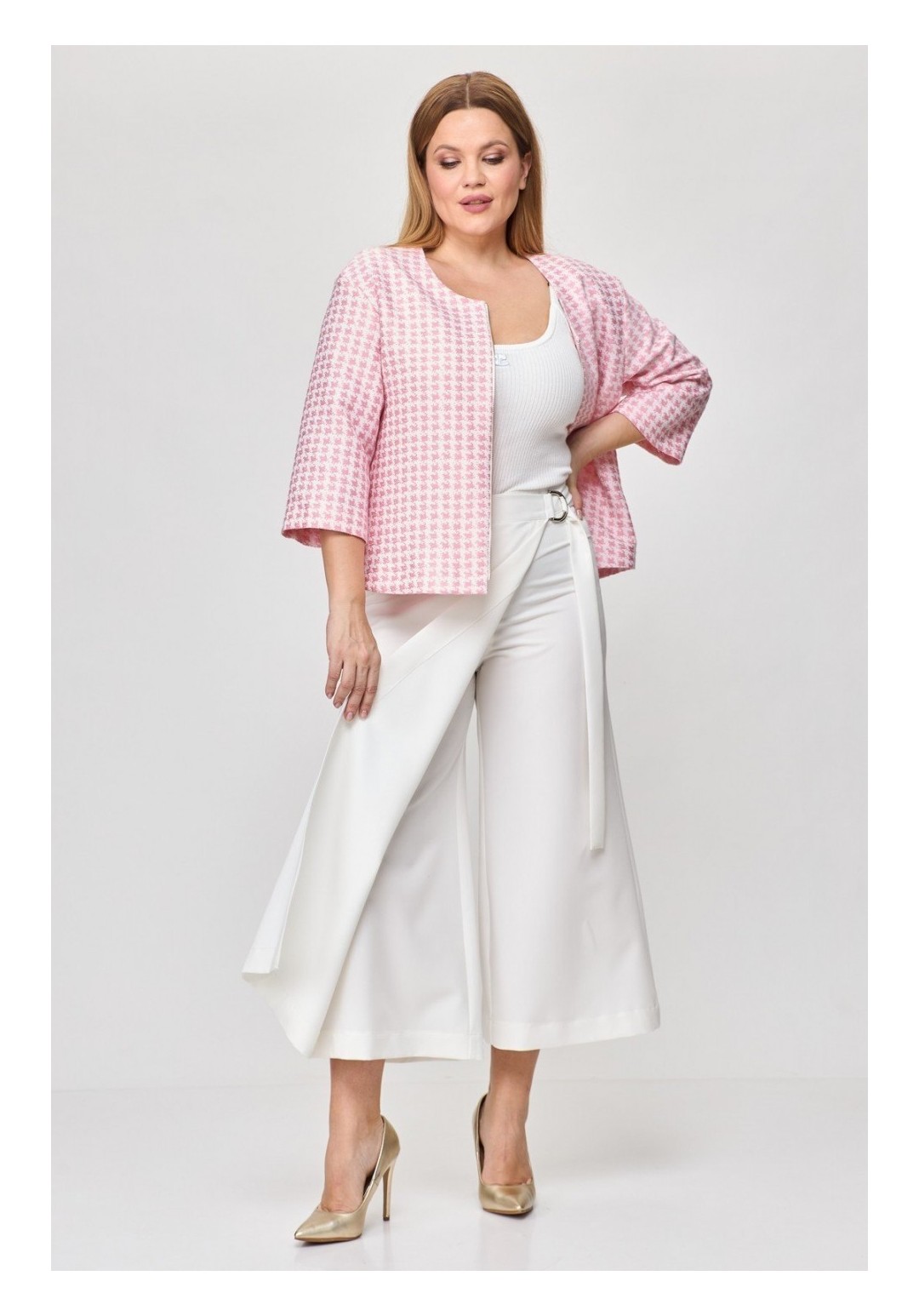 Женственный и стильный комплект, который придаст Вашему образу мягкость и элегантность, благодаря чему комплект подойдет и для праздничных образов, и для будней. Жакет выполнен из стильной ткани гусиная лапка в приятной расцветке. Свободного прилегания с центральной застежкой на молнии, рукав ¾. В качестве декора по переду изделия — пришивная брошка. Брюки-кюлоты выполнены из плотного шифона с элегантным запахом, свободной посадки, брючины широкие укороченные, чуть выше щиколотки. По переду молния, сзади по поясу вставлена резинка, запах фиксируется поясом на пряжке. Оба изделия прекрасно сочетаются между собой и могут смело создавать дополнительные стильные комбинации с другими вещами. Длина жакета по спинке 57 +/-1 см, длина рукава 40 +/-1 см. Длина брюк по боковому шву 93 см, шаговому — 61 см. Изделие подойдет на рост 170 см.