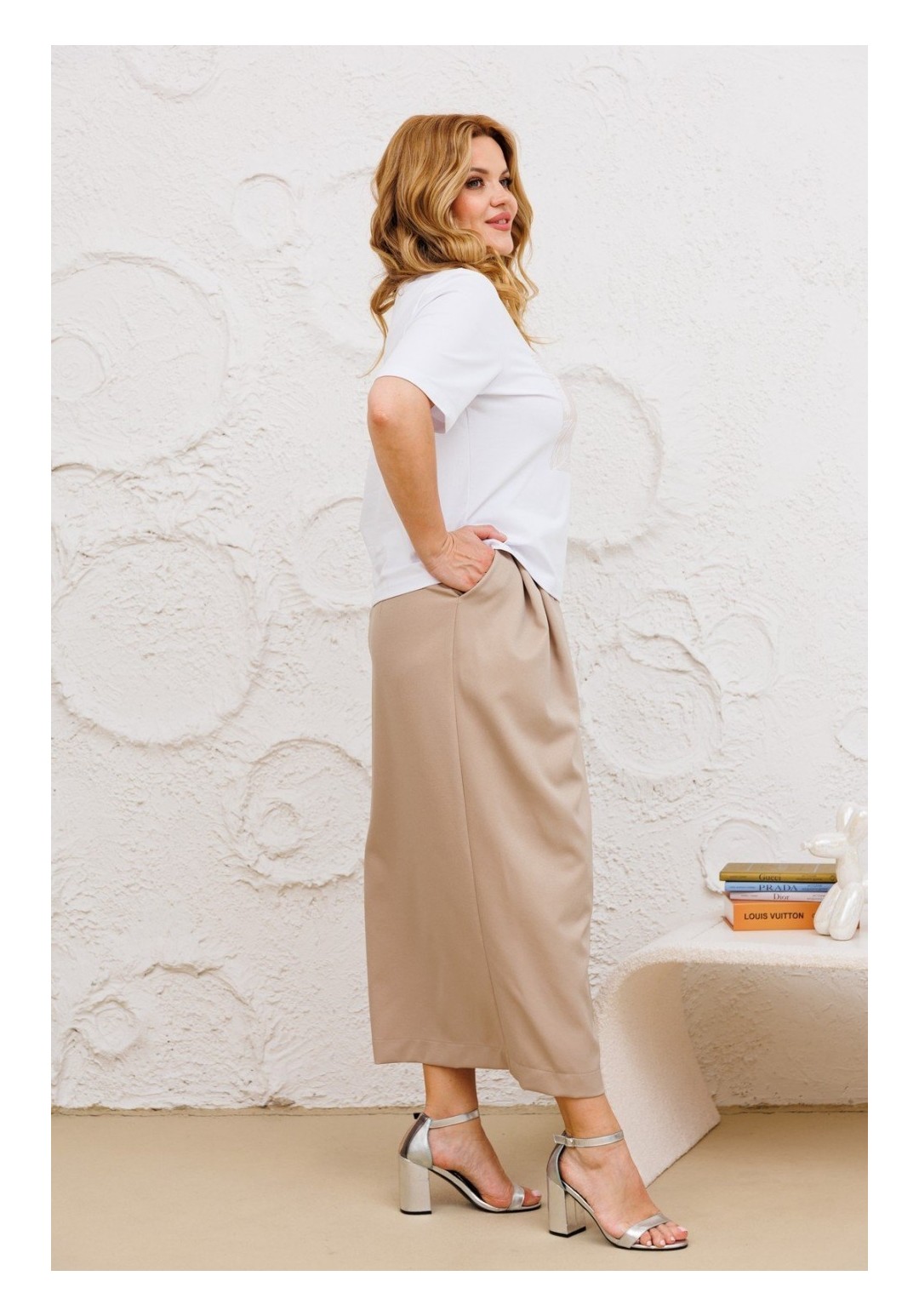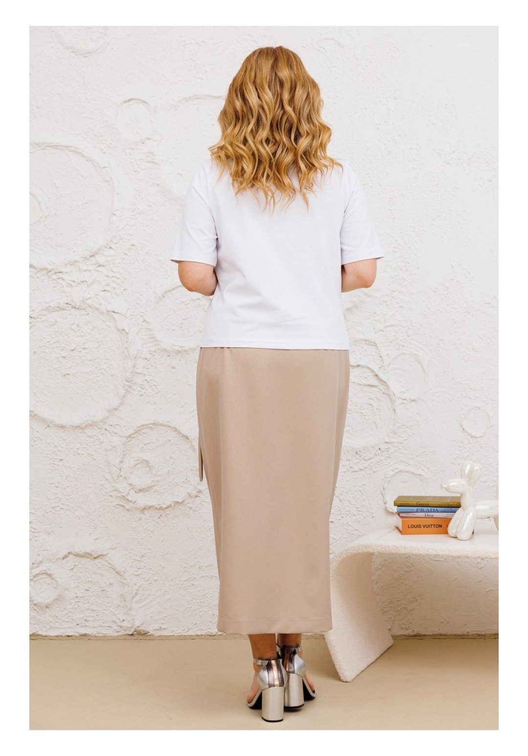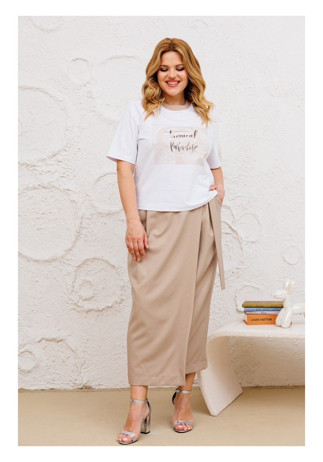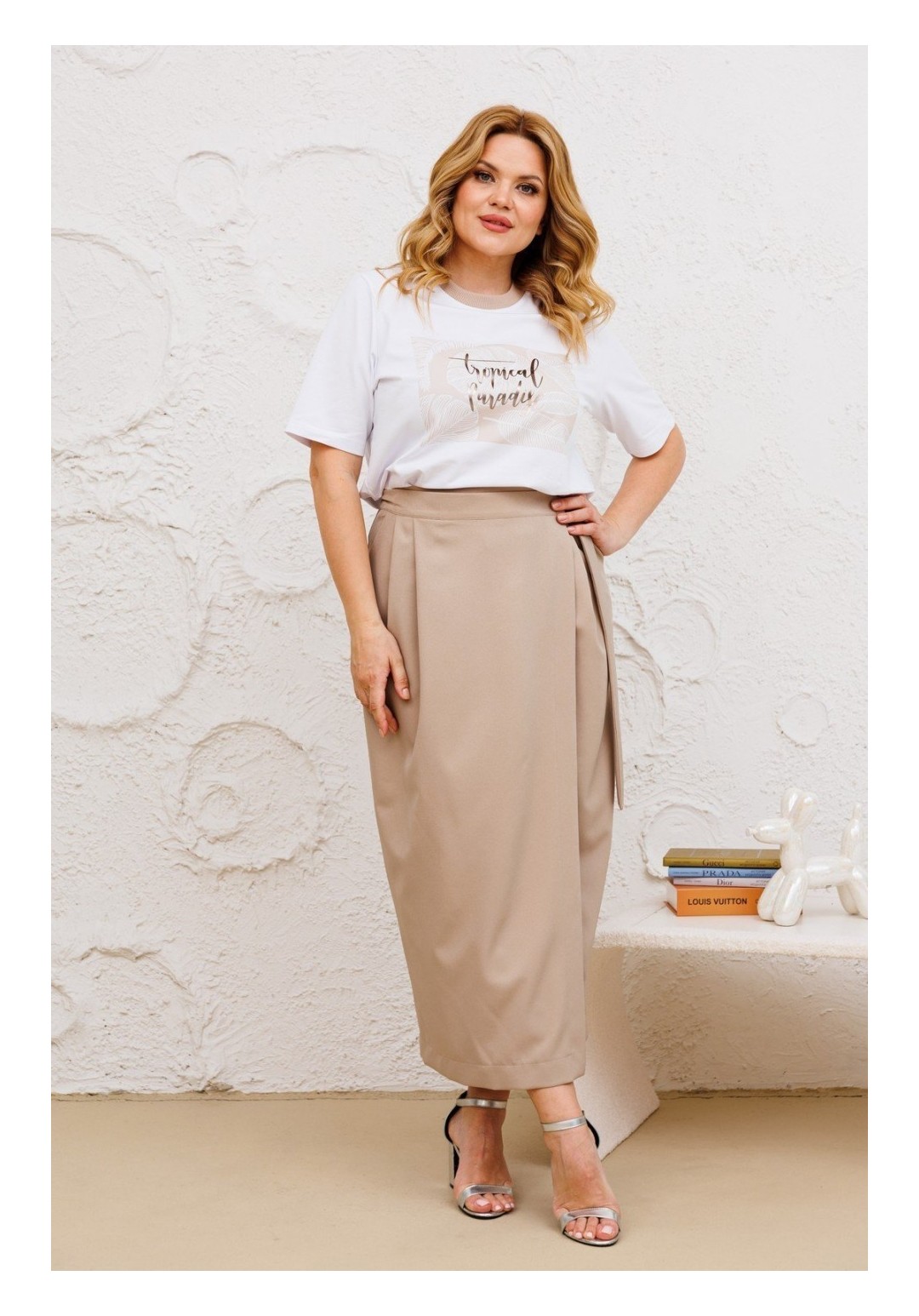 Стильный и удобный юбочный женский комплект. Изделие состоит из двух предметов: футболки и юбки на запах. Данный комплект отличный вариант как для торжеств, так и для повседневной носки. Футболка свободного кроя выполнена из хлопковой ткани. Рукав укороченный, круглая контрастная горловина, перед и спинка прямые. По переду изделие украшено принтом. Футболку с легкостью можно носить как навыпуск, так и заправленной. Удлиненная юбка на запах идеально сидит на любой фигуре, подчеркивая все достоинства и скрывая недостатки. Юбка свободного кроя на притачном поясе, застегивающимся на полукольца. По переду два кармана в боковых швах. Передняя часть юбки по верху имеет две талиевые складки, задняя часть цельная прямая имеет две талиевые вытачки. С данным комплектом можно смело создавать стильные образы как вместе, так и по отдельности. Длина футболки по спинке 52см +-1 см, длина рукава 27см ± 1см. Длина юбки по боковому шву 92см +-1см. Изделие подойдет на рост 170 см.