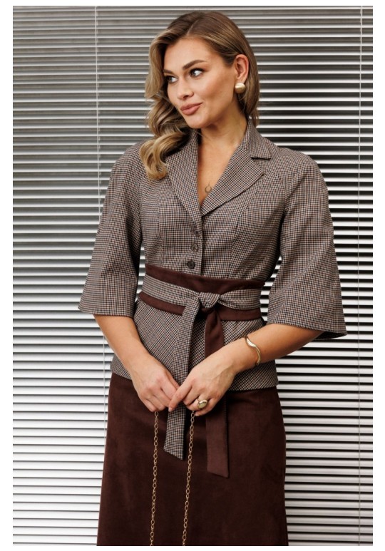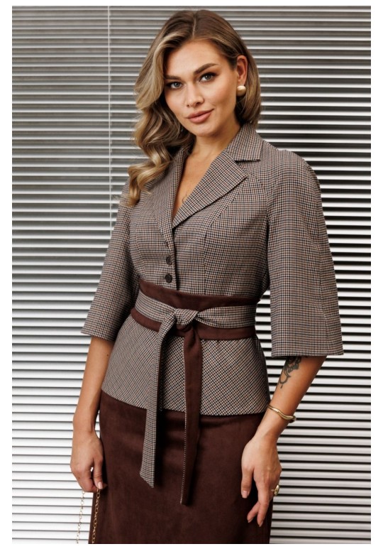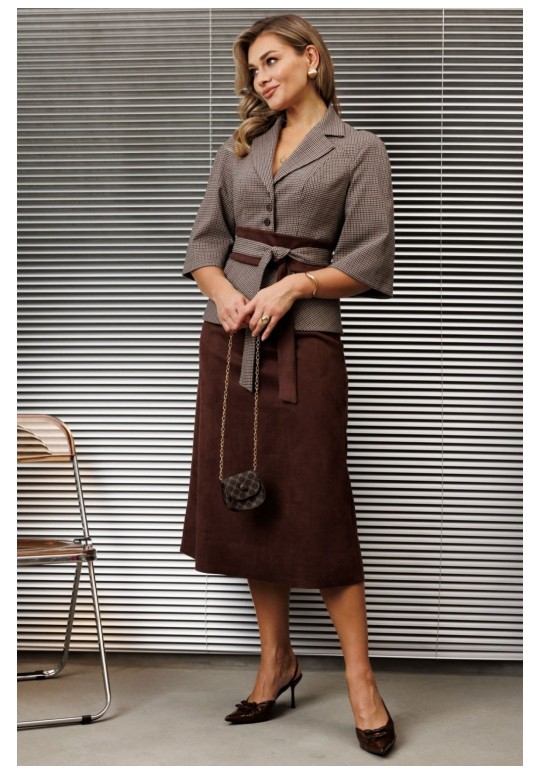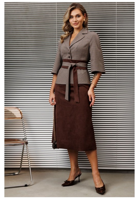 Бестселлер нашей коллекции - двухпредметный костюм, состоящий из жакета и юбки. Акцентом данного комплекта является съемный пояс. Для создания данного образа мы использовали мелкую клетку в тандеме с экокожей.Жакет прилегающего силуэта с отрезной баской по переду и спинка с рельефами. Рукав-реглан.Юбка А-силуэта на притачном поясе, сзади с резинкой. Застежка на тесьму-молнию в боковом шве.Костюм на подкладке. Длина спинки жакета: 60 см длина юбки: 75 см длина рукава: 53,5 см Жакет: костюмное полотно, юбка: замша