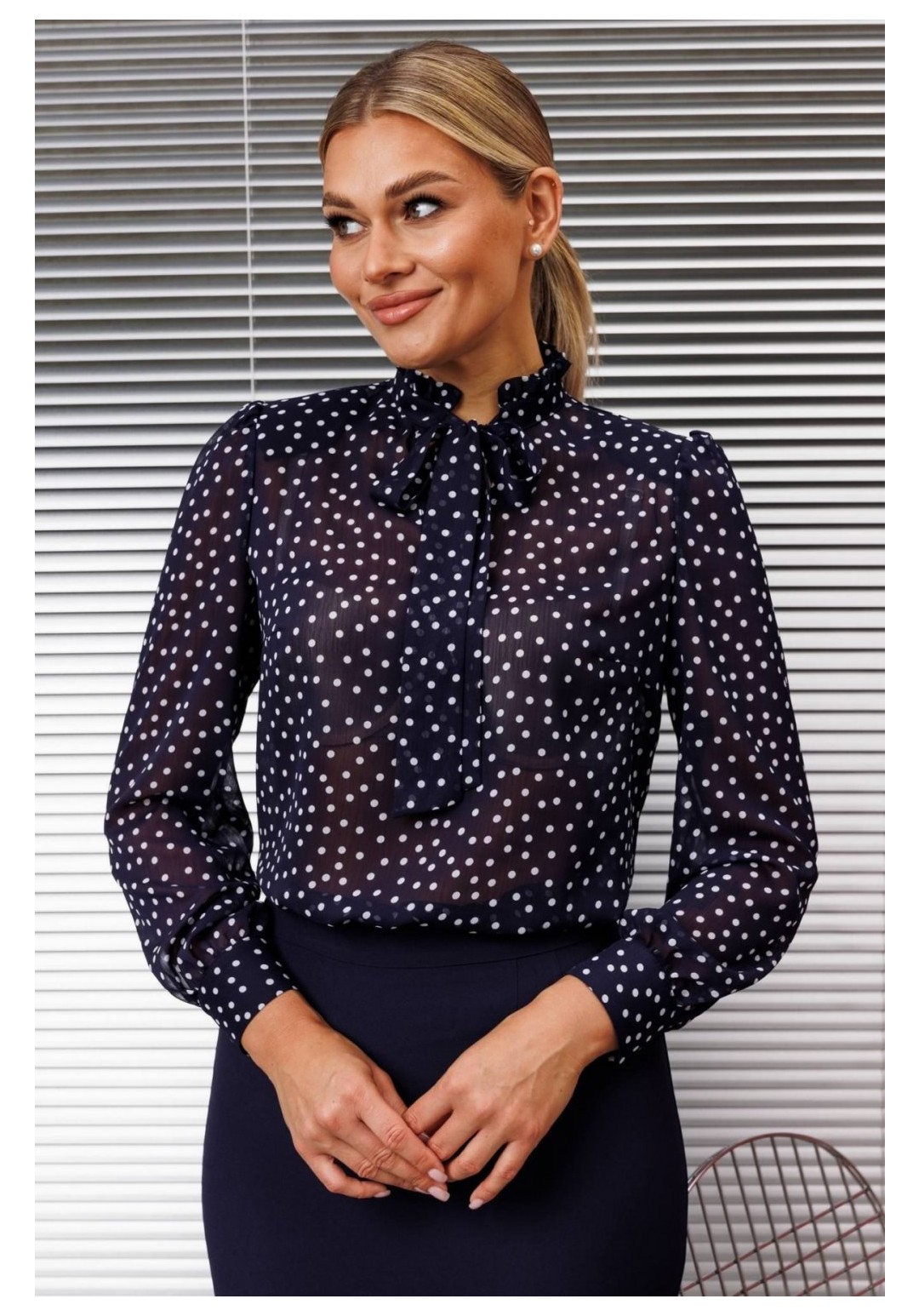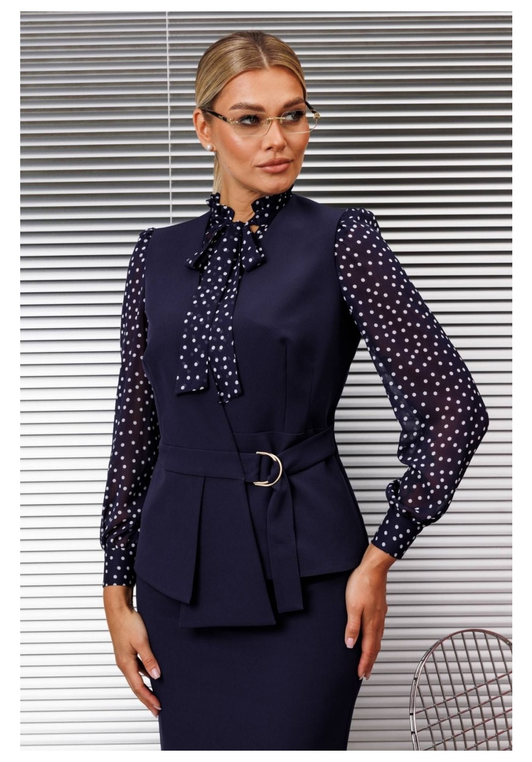 Комплект женский, состоящий из блузки, жилета и юбки. Блузка полуприлегающего силуэта. По переду нагрудные вытачки, спинка - с талиевыми вытачками. Воротник-стойка с рюшей по краю и завязкой. Рукав втачной, одношовный, по низу с манжетой. Жилет приталенного силуэта. Перед жилета отрезной по талии, с ассиметричной фигурной баской. По верхней части переда по две талиевых вытачки. Спинка со средним швом и талиевыми вытачками. Застежка в виде пояса через пряжку-полукольца. Жилет на подкладке. Юбка зауженная к низу, с застежкой и шлицей в среднем шве. Юбка на притачном поясе, на подкладке. Элегантный комплект безупречно сидит на фигуре и смотрится очень современно, а регулируемый пояс поможет усилить акцент на талии. длина блузы: 62,5 см длина рукава блузы: 61 см длина юбки: 65,5 см