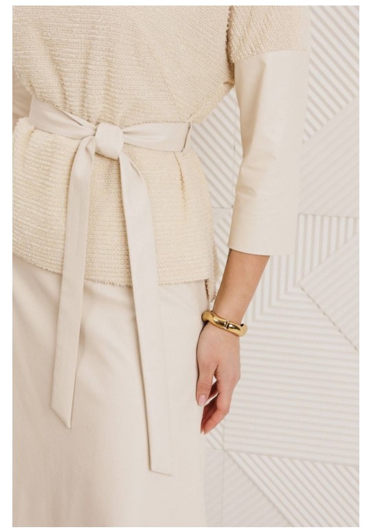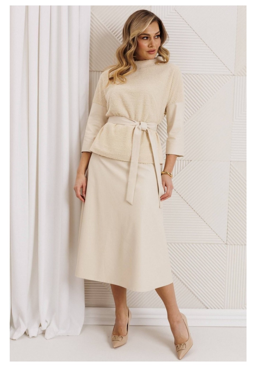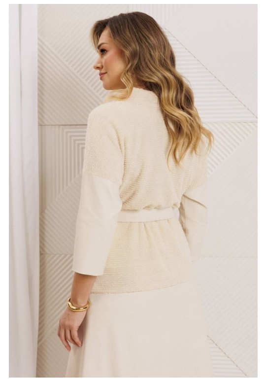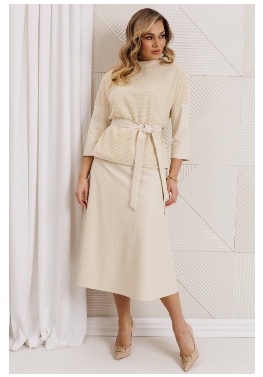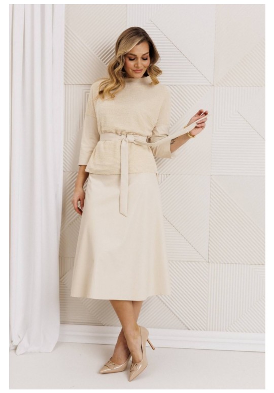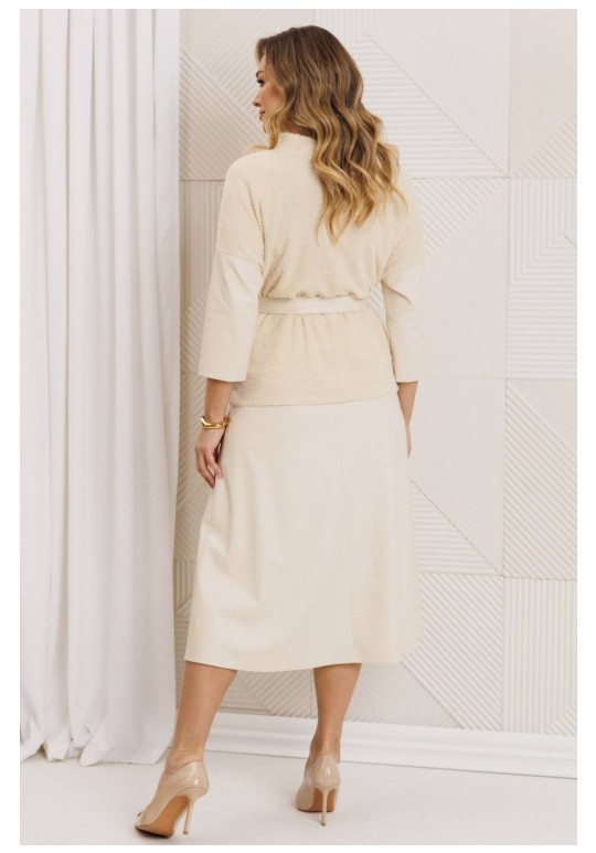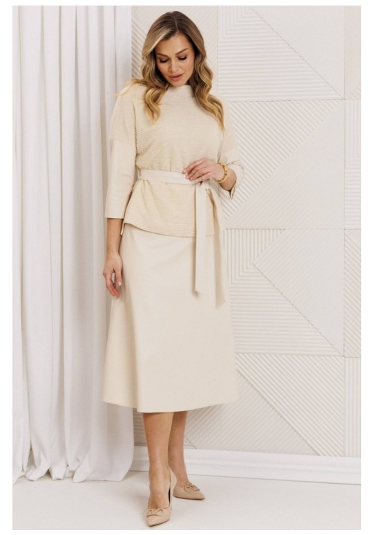 Образ, который стал знаковым - свободный блузон из эластичного полотна в тандеме с юбкой А силуэта из костюмной ткани. Блузон по переду выполнен с нагрудными вытачками выходящими из боковых швов. Спинка со средним швом. Воротник стойка. Юбка на притачном поясе сзади с резинкой. Застежка на тесьму молнию в боковом шве. Комплект дополнен поясом, что позволяет подчеркнуть линию талии. Блузон и юбка на подкладке. длина спинки жакета: 59 см длина юбки: 78 см