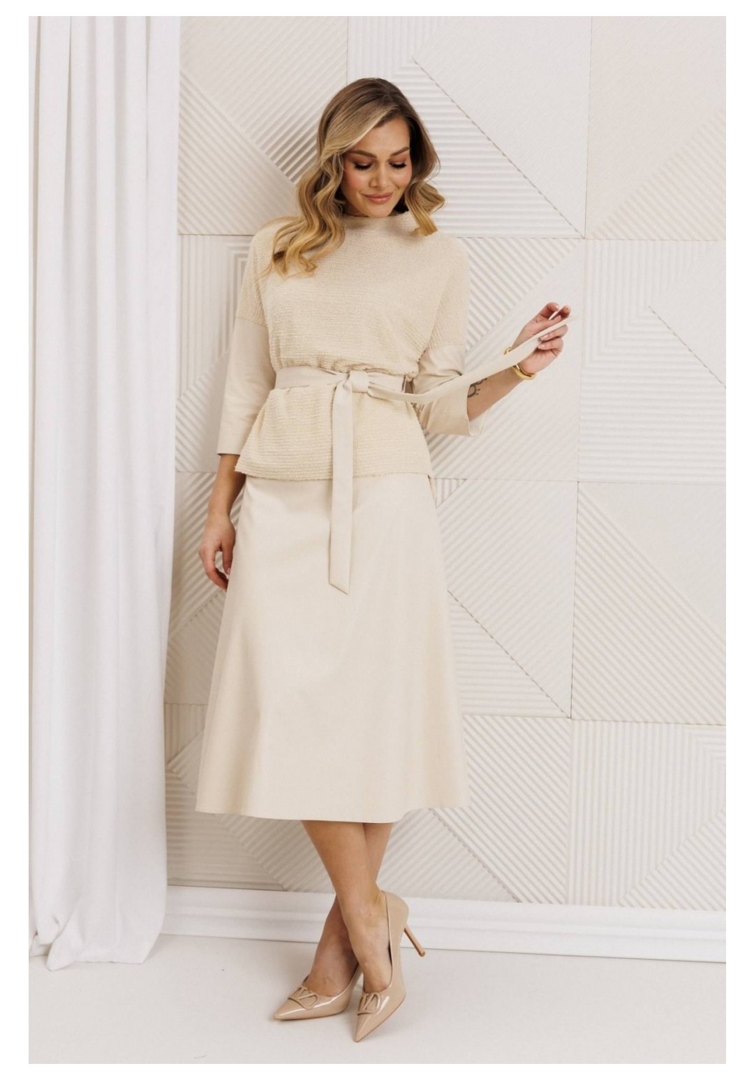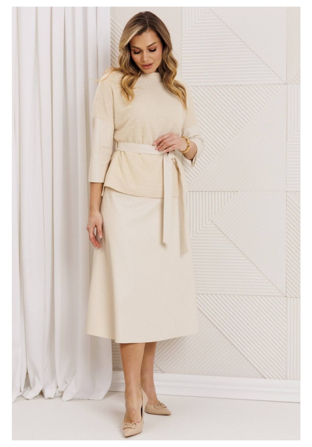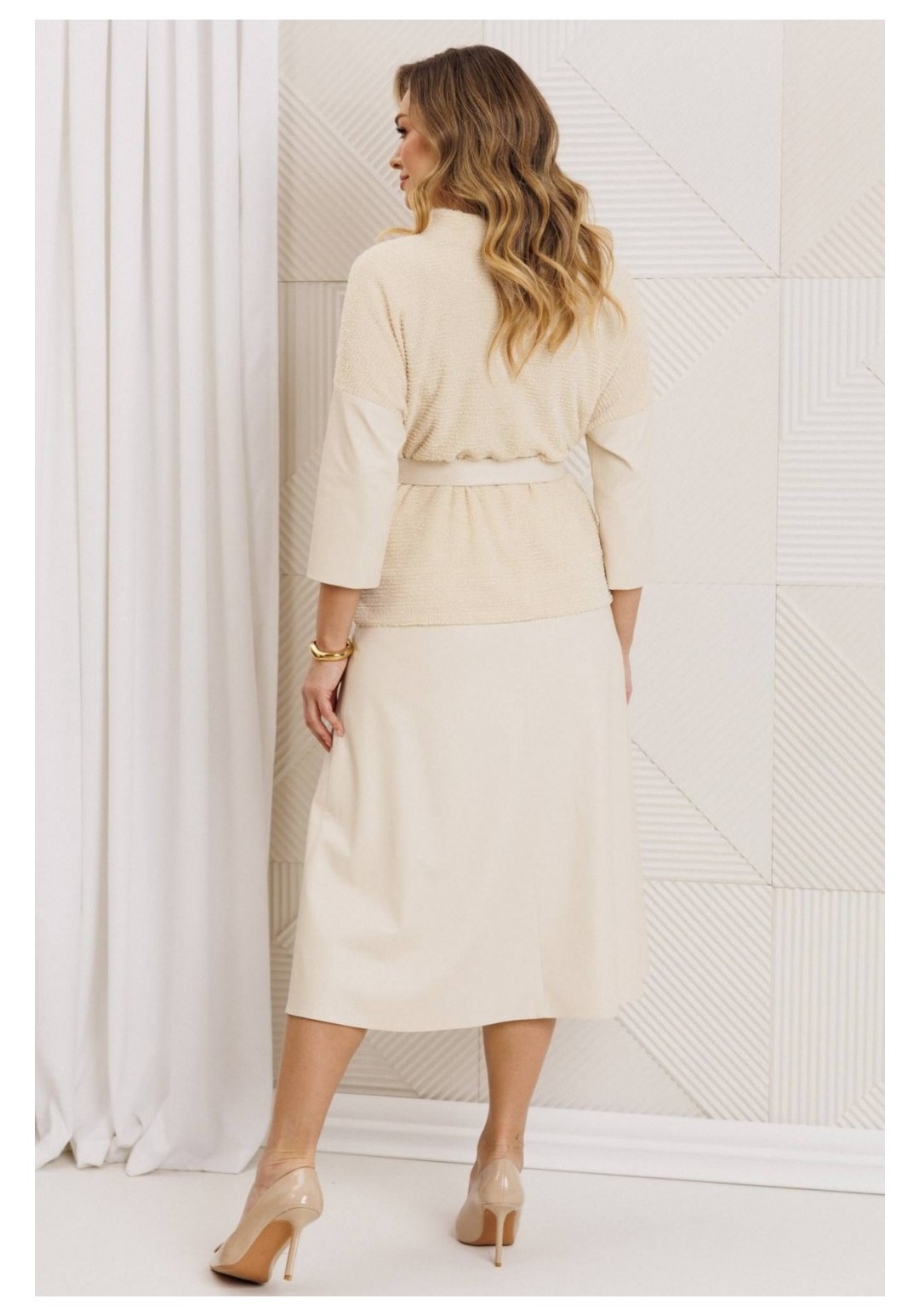 Образ, который стал знаковым - свободный блузон из эластичного полотна в тандеме с юбкой А силуэта из костюмной ткани. Блузон по переду выполнен с нагрудными вытачками выходящими из боковых швов. Спинка со средним швом. Воротник стойка. Юбка на притачном поясе сзади с резинкой. Застежка на тесьму молнию в боковом шве. Комплект дополнен поясом, что позволяет подчеркнуть линию талии. Блузон и юбка на подкладке. длина спинки жакета: 59 см длина юбки: 78 см