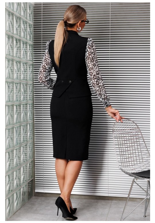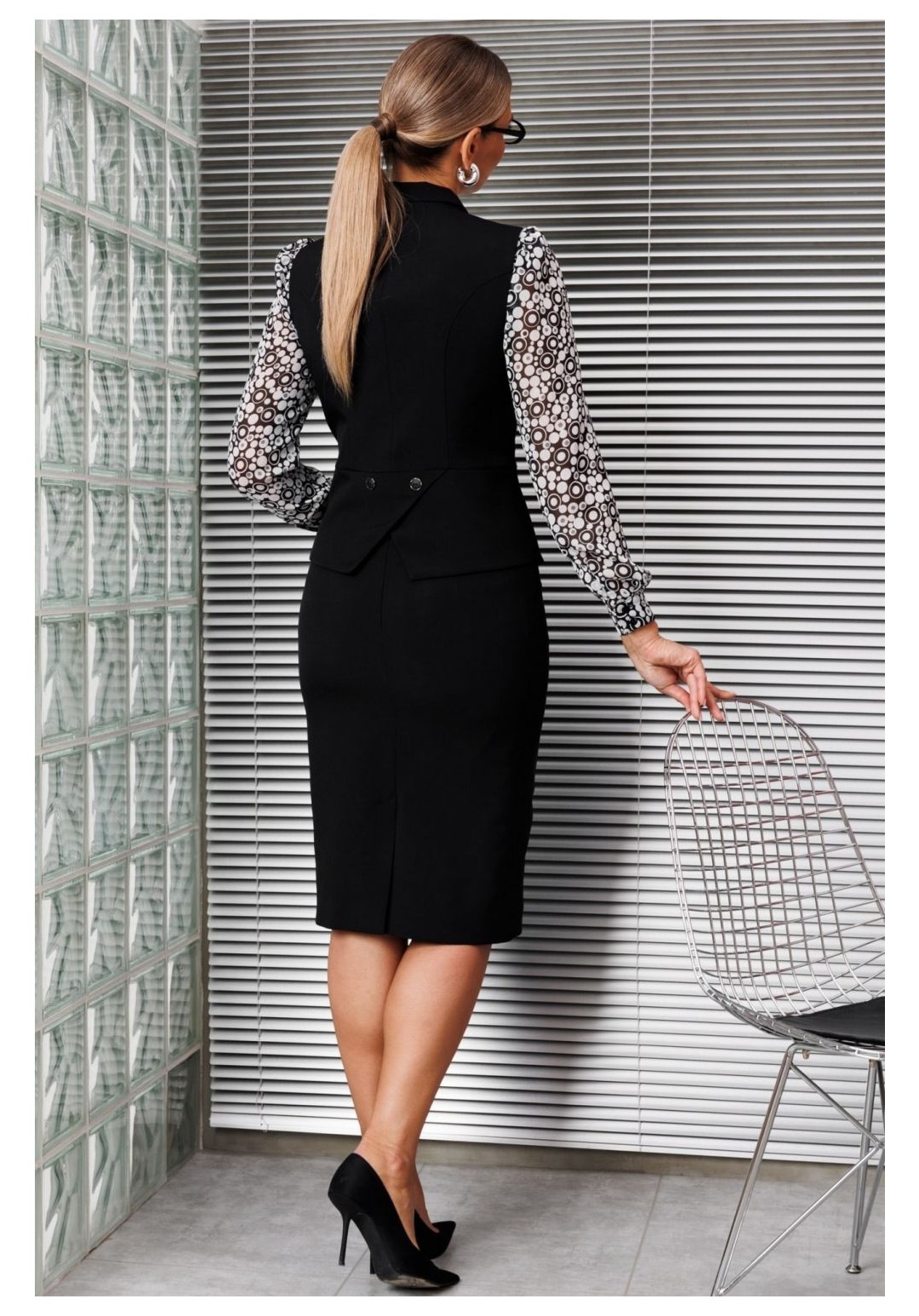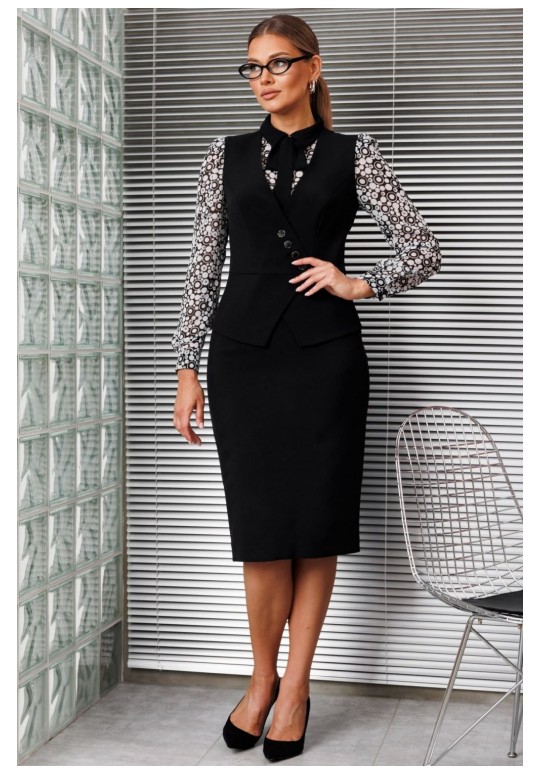 Стильный трехпредметный комплект для офиса. Комплект состоит из жилета, блузы и юбки. Жилет полуприлегающего силуэта с рельефами и фигурной баской. Застежка двубортная на петли-пуговицы. Вдоль линии борта жилет на подкладке. Блуза прямого силуэта в боковых швах с разрезами. По переду с нагрудной вытачкой, выходящей из бокового шва. Воротник рубашечный. Рукав втачной, одношовный, сверху по окату с небольшой сборкой. Застежка на петли-пуговицы. Юбка прямая, зауженная к низу, сзади со средним швом, переходящим в шлицу. Верх юбки на притачном поясе, по бокам с резинками. Юбка на подкладке. Дополнением и ярким акцентом является бант на блузе. Длина жилета: 57,5 см, длина юбки: 70 см