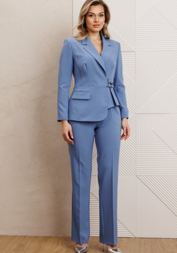 Костюм женский состоит из блузы и юбки. Блуза прямого силуэта, со спущенной линией плеча. Вырез горловины округлой формы,окантован. Застежка центральная, на петли пуговицы. Полочка декорирована цветами, которые обработаны улиткой контрастного цвета. Юбка А-силуэта с отрезными волонами со сборкой, сверху на притачном поясе, сзади с резинкой. Костюм дополнен поясом, который завязывается в форме банта.