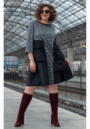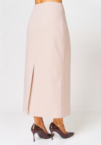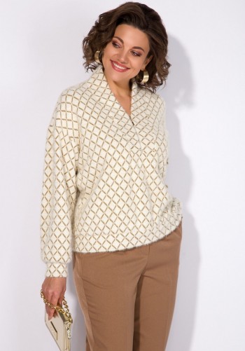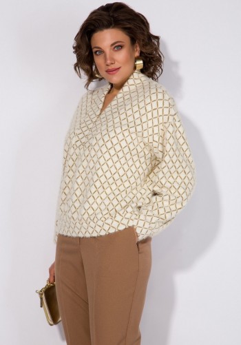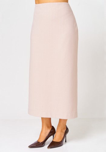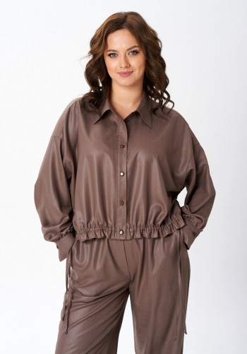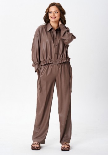 Двухпредметный комплект, состоящий из жакета с цельнокройным рукавом и юбки А-силуэта. Жакет полуприлегающего силуэта с фигурным вырезом горловины. Рукав цельнокройный. Перед и спинка с рельефами. Спинка со средним швом. Застежка двубортная на петли-пуговицы. Юбка А-силуэта, сверху на притачном поясе, с резинкой сзади. Застежка на тесьму-молнию в боковом шве. Комплект дополнен поясом, что позволяет регулировать ширину по линии талии. длина жакета: 59,5 см длина юбки: 77 см