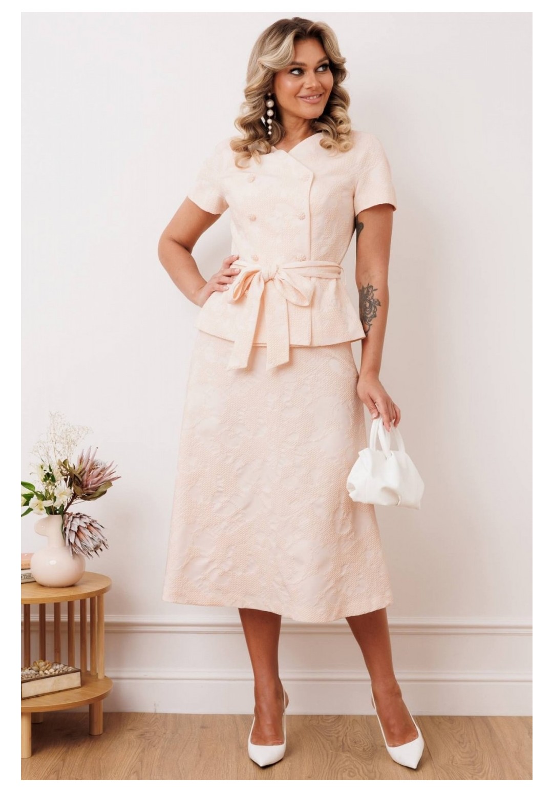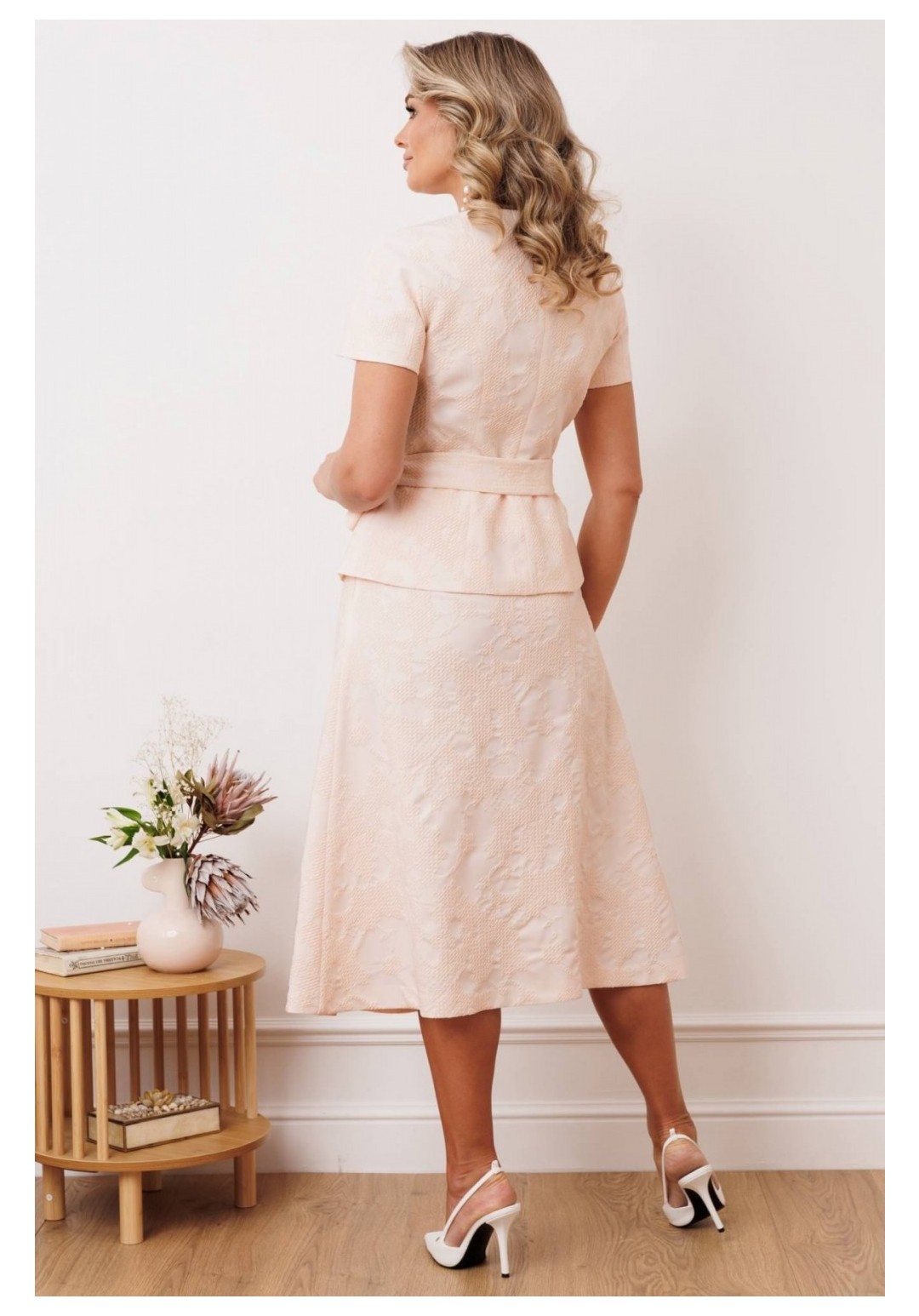 Двухпредметный комплект, состоящий из жакета с цельнокройным рукавом и юбки А-силуэта. Жакет полуприлегающего силуэта с фигурным вырезом горловины. Рукав цельнокройный. Перед и спинка с рельефами. Спинка со средним швом. Застежка двубортная на петли-пуговицы. Юбка А-силуэта, сверху на притачном поясе, с резинкой сзади. Застежка на тесьму-молнию в боковом шве. Комплект дополнен поясом, что позволяет регулировать ширину по линии талии. длина жакета: 59,5 см длина юбки: 77 см