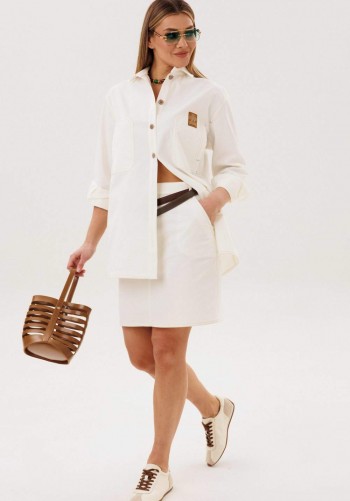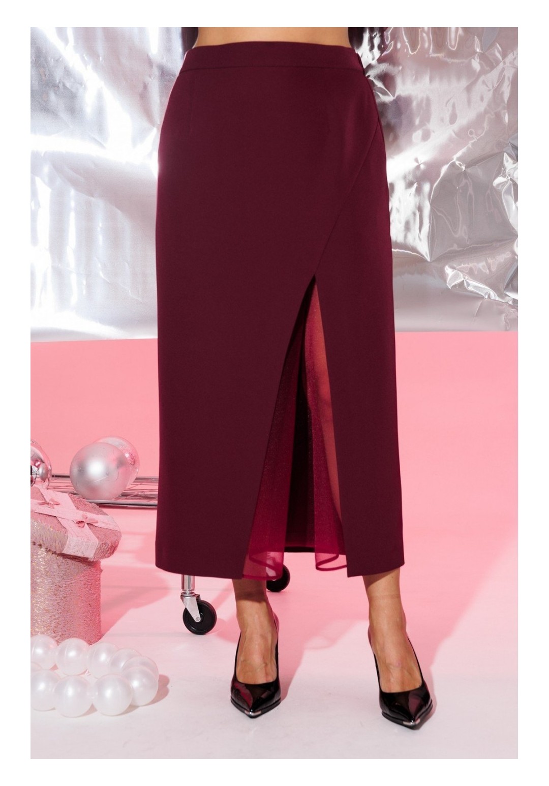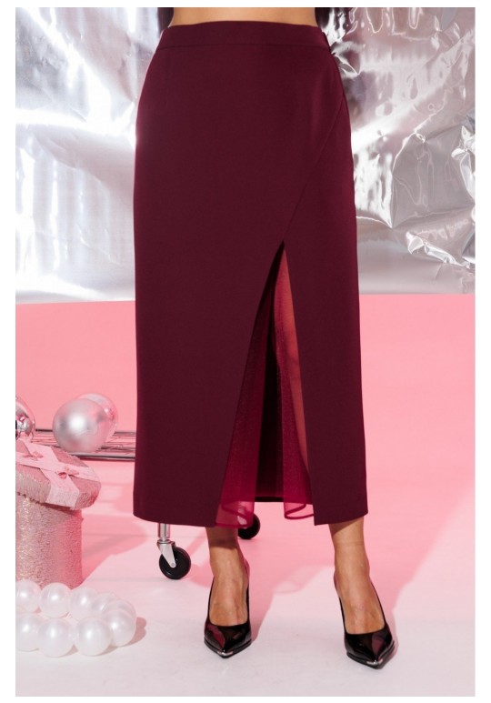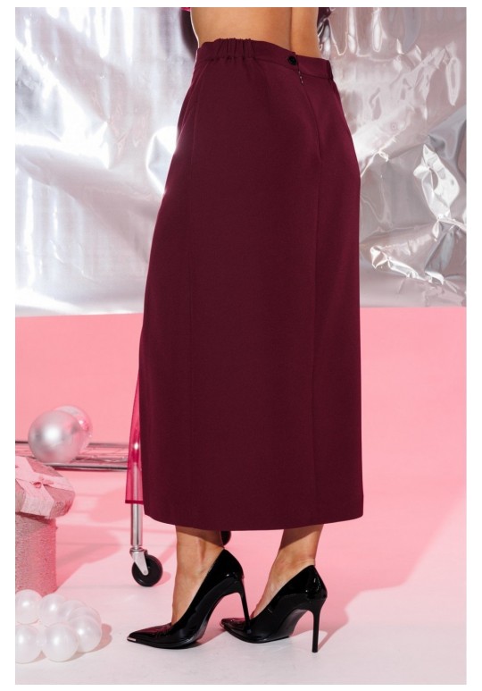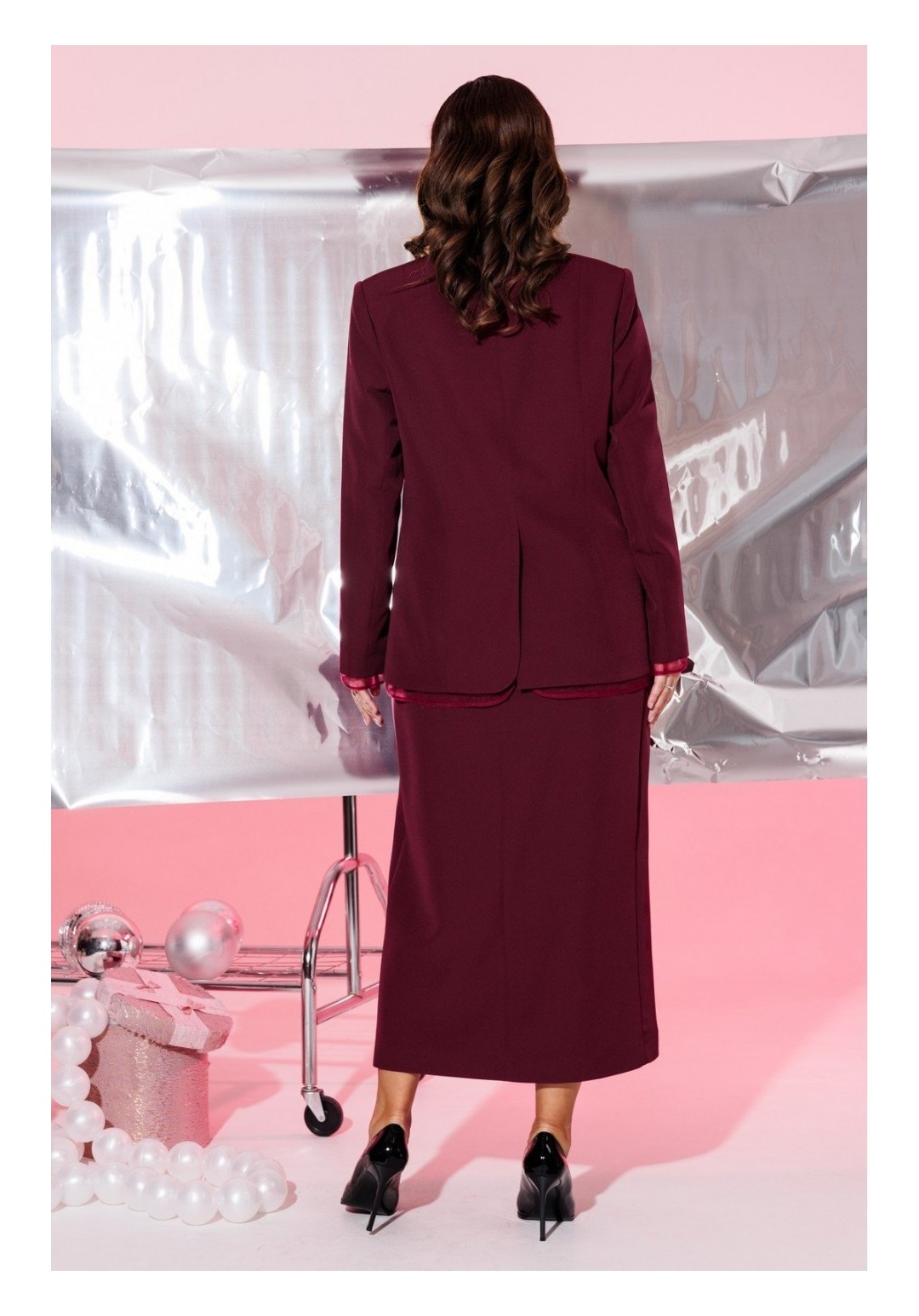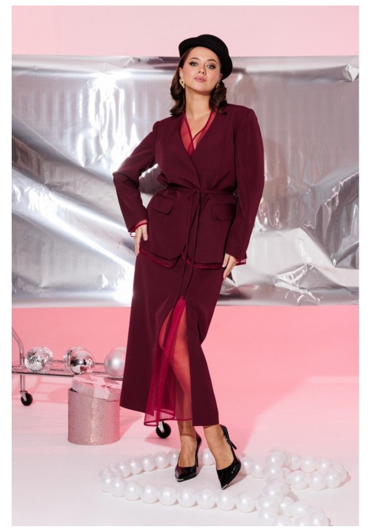 Нарядный женский костюм, состоящий из жакета и юбки, выполненные из костюмной ткани (тянется) с отделкой из органзы. Жакет полуприлегающего силуэта на подкладке. По переду рельефные швы, функциональные прорезные карманы в рамку с клапаном. Застежка центральная на 2 пришивные кнопки. Горловина V-образной формы. Спинка со средним швом, шлицей и рельефными швами. Рукава втачные, двухшовные. Жакет декорирован отделочными клапанами из органзы: по борту, низу и рукаву. В комплект входит пояс из основной ткани. Юбка зауженная к низу без подкладки. По переднему полотнищу талиевые вытачки, ассиметричный подрез, переходящий в разрез, который декорирован воланом из органзы. По заднему полотнищу талиевые вытачки, застежка на потайную молнию в среднем шве. Верхний срез оформлен поясом с резинкой по задней половинке.
