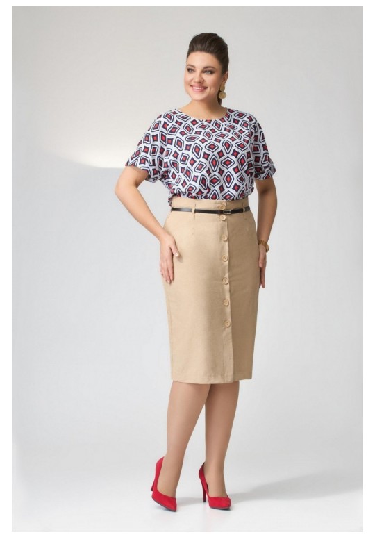 Юбка прямого силуэта с завышенной талией по переду застежка на пуговицы. Талия подчеркнута съемным поясом.Блуза прямого силуэта с разрезами в боковых швах