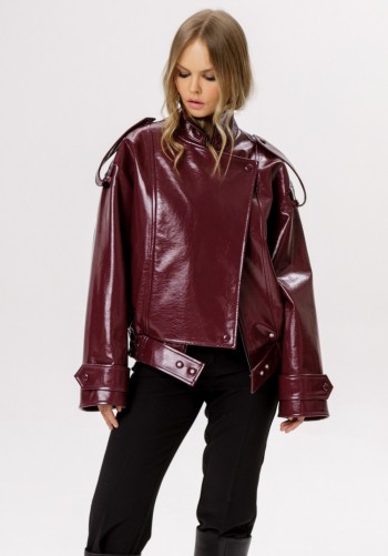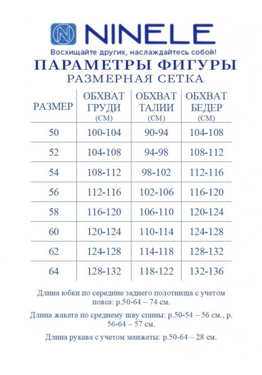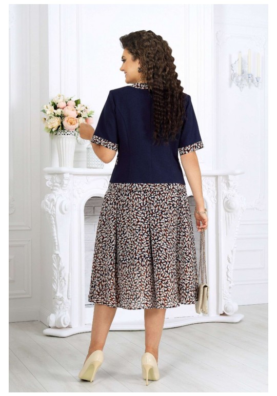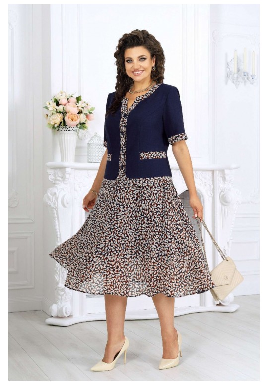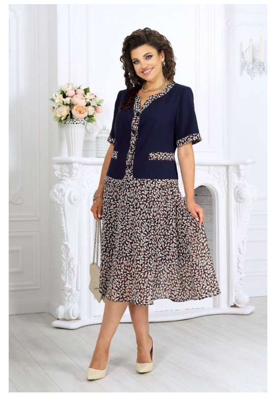 Жакет однобортный, прилегающего силуэта, выполнен из ткани лен-вишер, с отделочными элементами из плательного шифона с принтом. Модель без подкладки, с плечевыми накладками. По горловине переда и спинки, краю борта и низу изделия – отрезные планки. Спереди обработаны рельефные швы, направленные от пройм до низа; в нижней части переда расположены отрезные отделочные детали. Перед с центральной внешней застежкой на 5 декоративных пуговиц с закруглёнными бортами внизу. Спинка со средним швом и рельефами, направленными от пройм до низа. Горловина спинки округлая, спереди – фигурная, углубленная. Рукав короткий, втачной, с манжетой по низу. Длина жакета – 56 см (50-54 р-р), 57 см (56-64 р-р); длина рукава (с манжетой) – 28 см. Юбка полусолнце, с посадкой на талии, выполнена из плательного шифона с принтом. Модель на трикотажной подкладке. В левом боковом шве обработана застежка на потайную тесьму-молнию (20 см). Притачной пояс застегивается на 1 петлю и 1 пуговицу; для лучшего прилегания по линии талии в притачном поясе предусмотрена эластичная лента, вставленная по спинке. Длина юбки по середине заднего полотнища (с поясом) – 74 см.