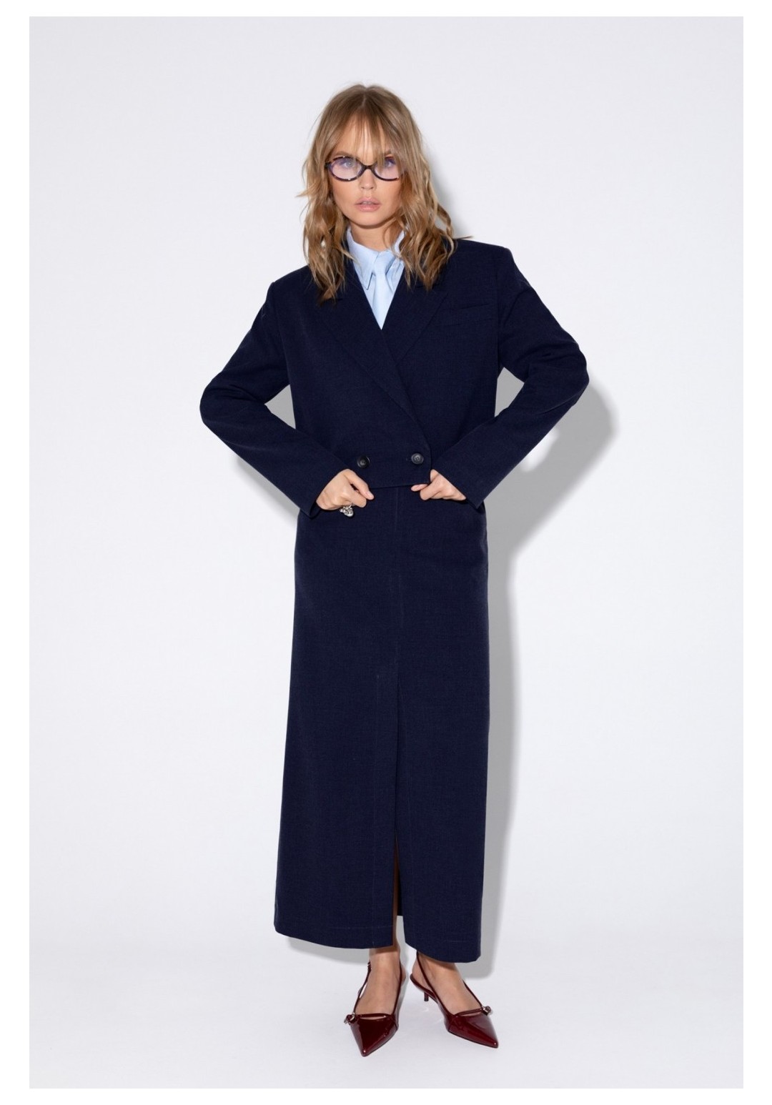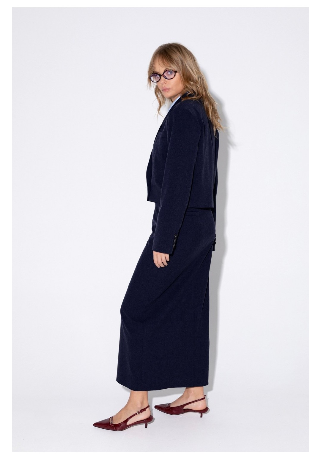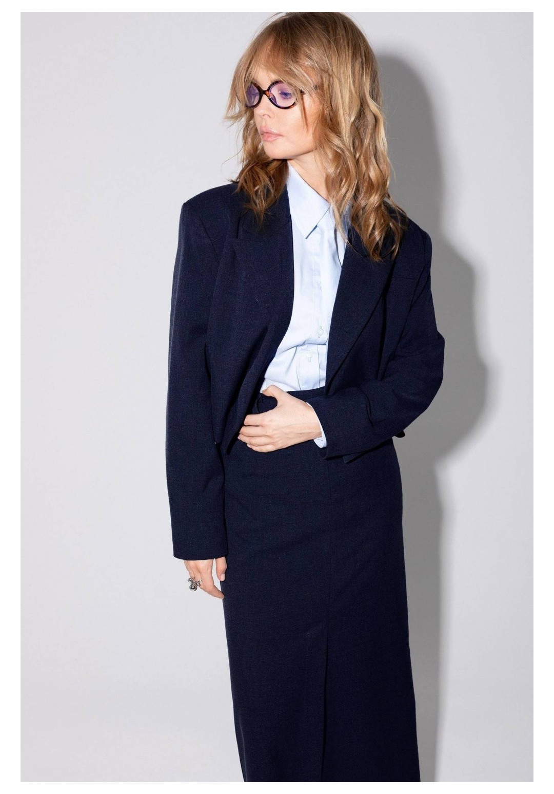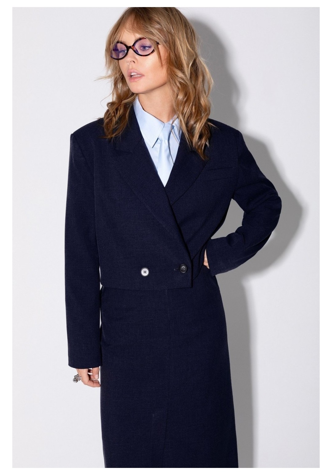 Костюм-двойка из укороченного оверсайз жакета с расширенной линией плеч и прямой макси-юбки с высоким разрезом. Детали: прямой силуэт, спущенная линия плеча, пиджачный воротник, перед с функциональным нагрудным карманом, застежка двубортная на петли и пуговицы, рукава втачные двухшовные, жакет на подкладке. Юбка на притачном поясе со шлевками, талиевые вытачки, боковые карманы, застежка на потайную молнию, на подкладке. Длина жакета по спинке около 47 см в размерах 40-46 и около 49 см в размерах 48-52. Длина рукава около 60см. Длина юбки по боковому шву с поясом около 95 см в размерах 40-52 см
