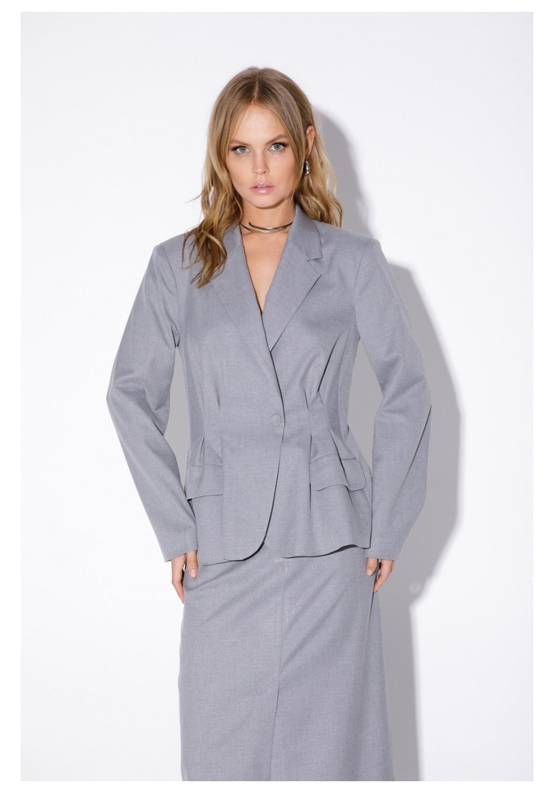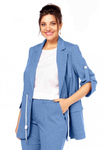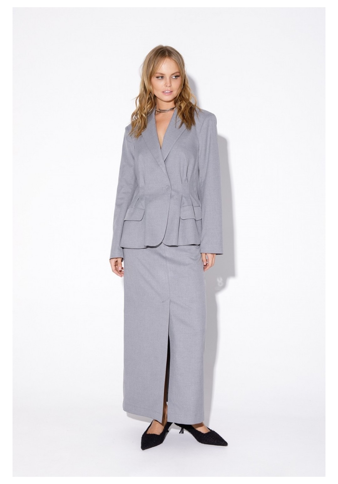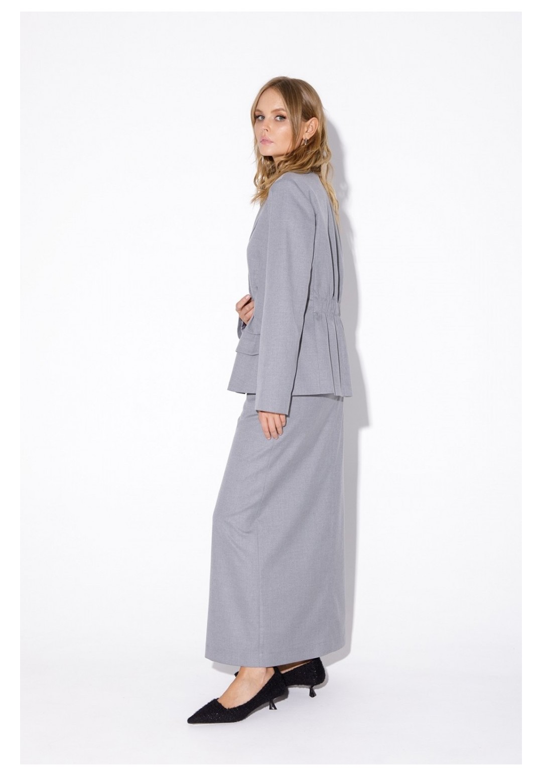 Текстильный костюм-двойка из укороченного приталенного жакета со складками и прямой макси-юбки с высоким разрезом. Детали: пиджачный воротник, перед с функциональными карманами, застежка на одну петлю и пуговицу, рукава втачные двухшовные, спинка с рельефами и резинкой по талии. Жакет на подкладке. Юбка на притачном поясе со шлевками, талиевые вытачки, боковые карманы, застежка на потайную молнию, на подкладке. Длина жакета по спинке около 64 см в размерах 40-46 и около 67 см в размерах 48-52, длина рукава около 61 см. Длина юбки по боковому шву с поясом около 95 см в размерах