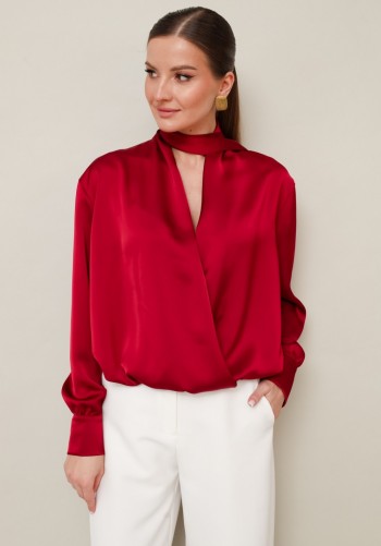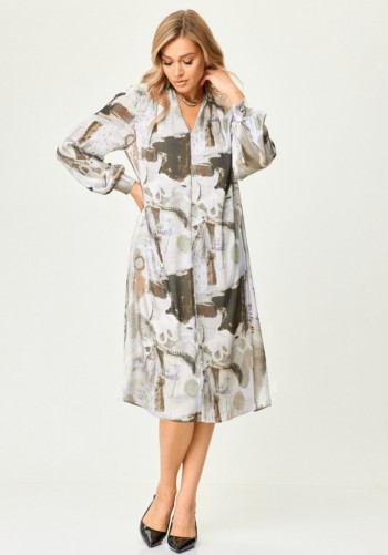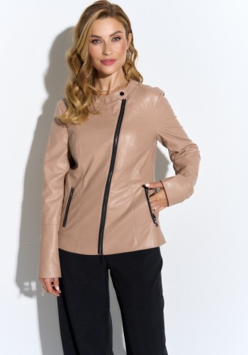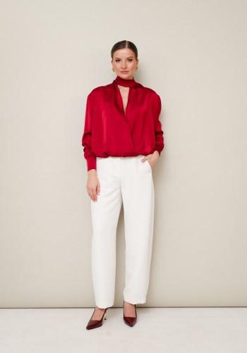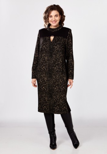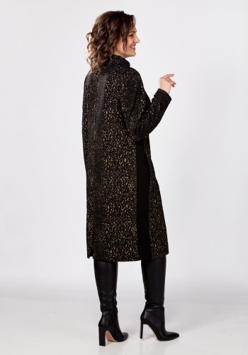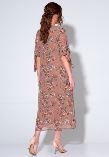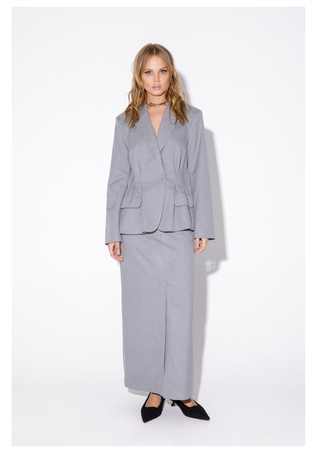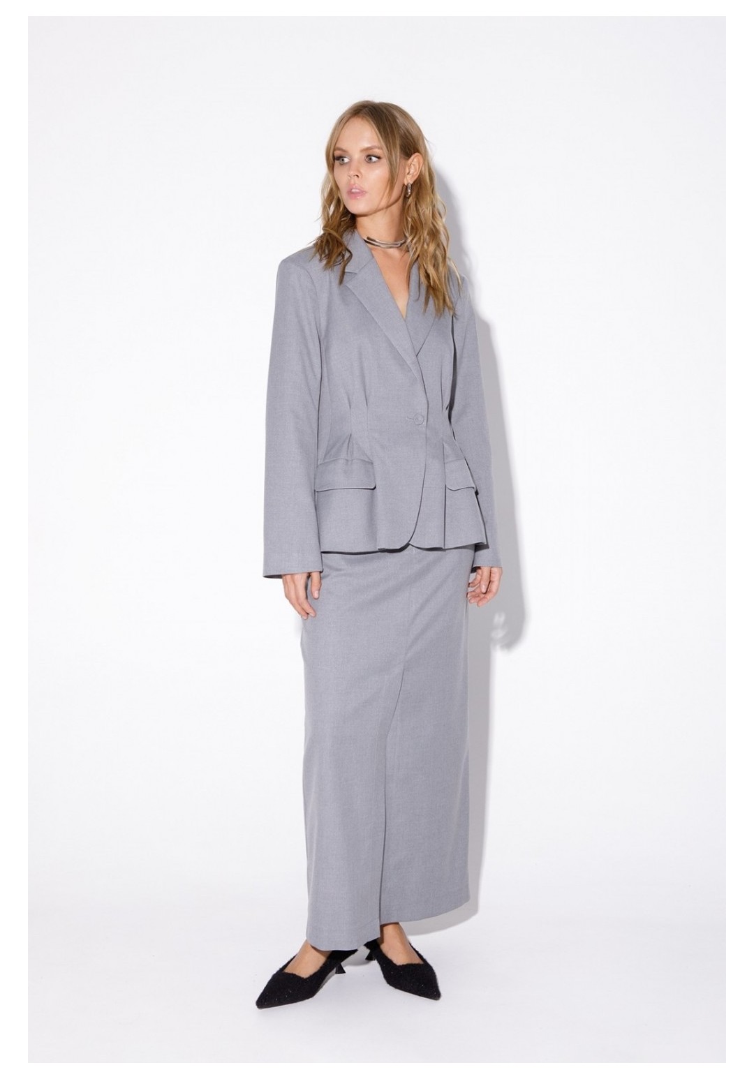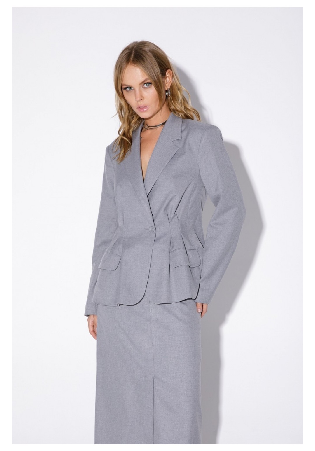Текстильный костюм-двойка из укороченного приталенного жакета со складками и прямой макси-юбки с высоким разрезом. Детали: пиджачный воротник, перед с функциональными карманами, застежка на одну петлю и пуговицу, рукава втачные двухшовные, спинка с рельефами и резинкой по талии. Жакет на подкладке. Юбка на притачном поясе со шлевками, талиевые вытачки, боковые карманы, застежка на потайную молнию, на подкладке. Длина жакета по спинке около 64 см в размерах 40-46 и около 67 см в размерах 48-52, длина рукава около 61 см. Длина юбки по боковому шву с поясом около 95 см в размерах