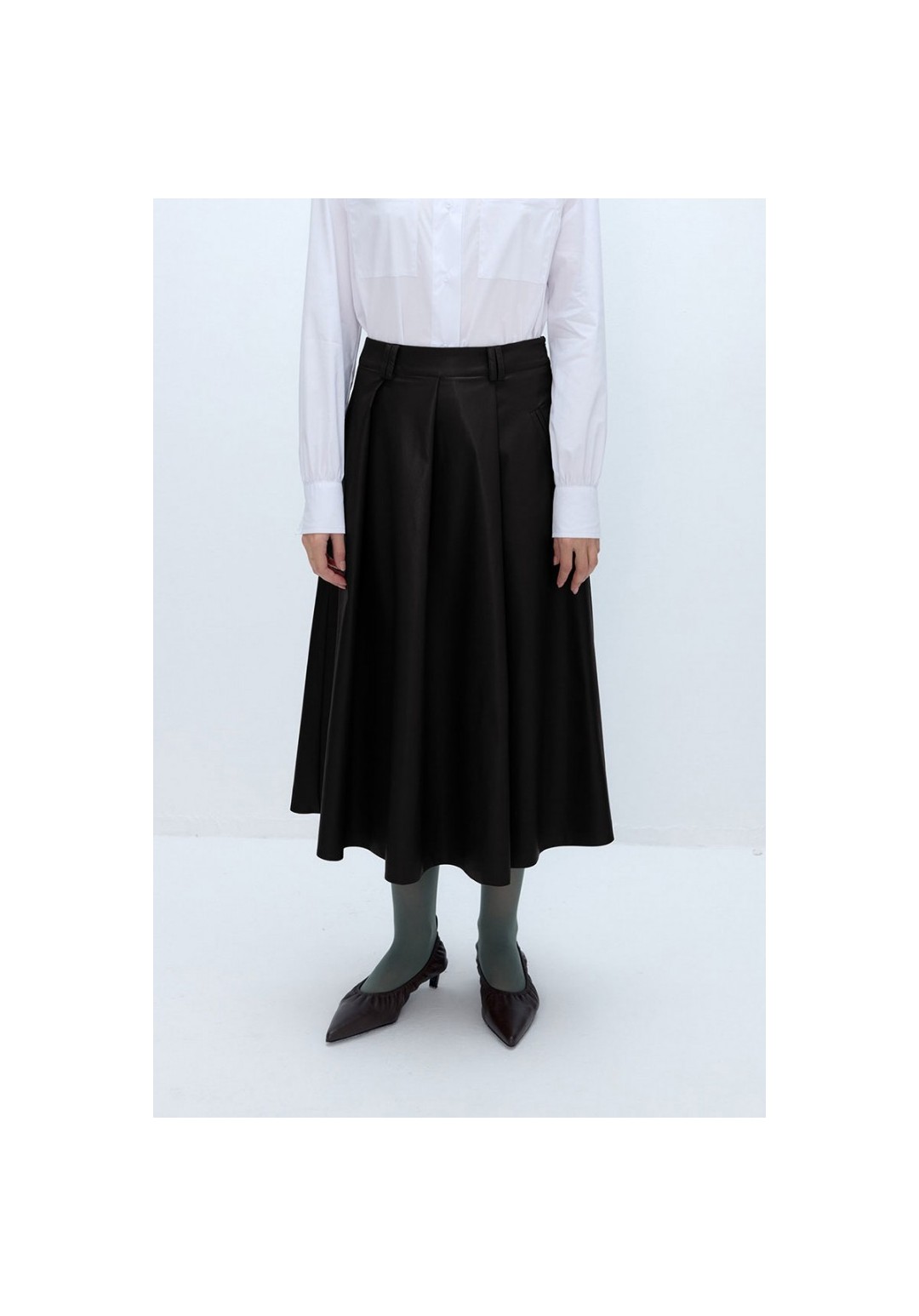 Комплект-двойка из хлопковый оверсайз рубашки и миди-юбки из экокожи. Детали: рубашка прямого силуэта, спущенная линия плеча, застежка на петли и пуговицы, длинные рукава с притачными манжетами, фигурный низ. Юбка на притачном поясе со шлевками, прорезные карманы, застежка на потайную молнию в левом боковом шве, юбка на подкладке. Длина рубашки по спинке около 78 см. Длина рукава+ плечо около 55+9= 64 см. Длина юбки по боковому шву с поясом около 80 см.