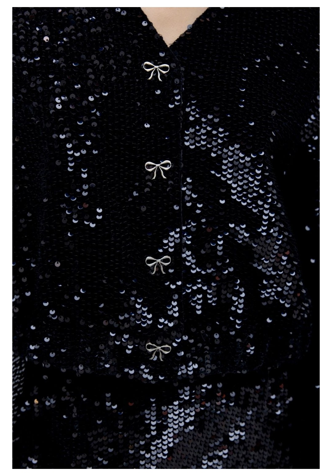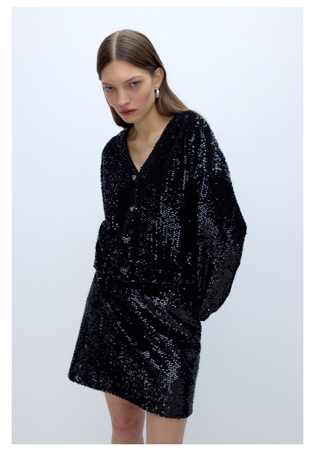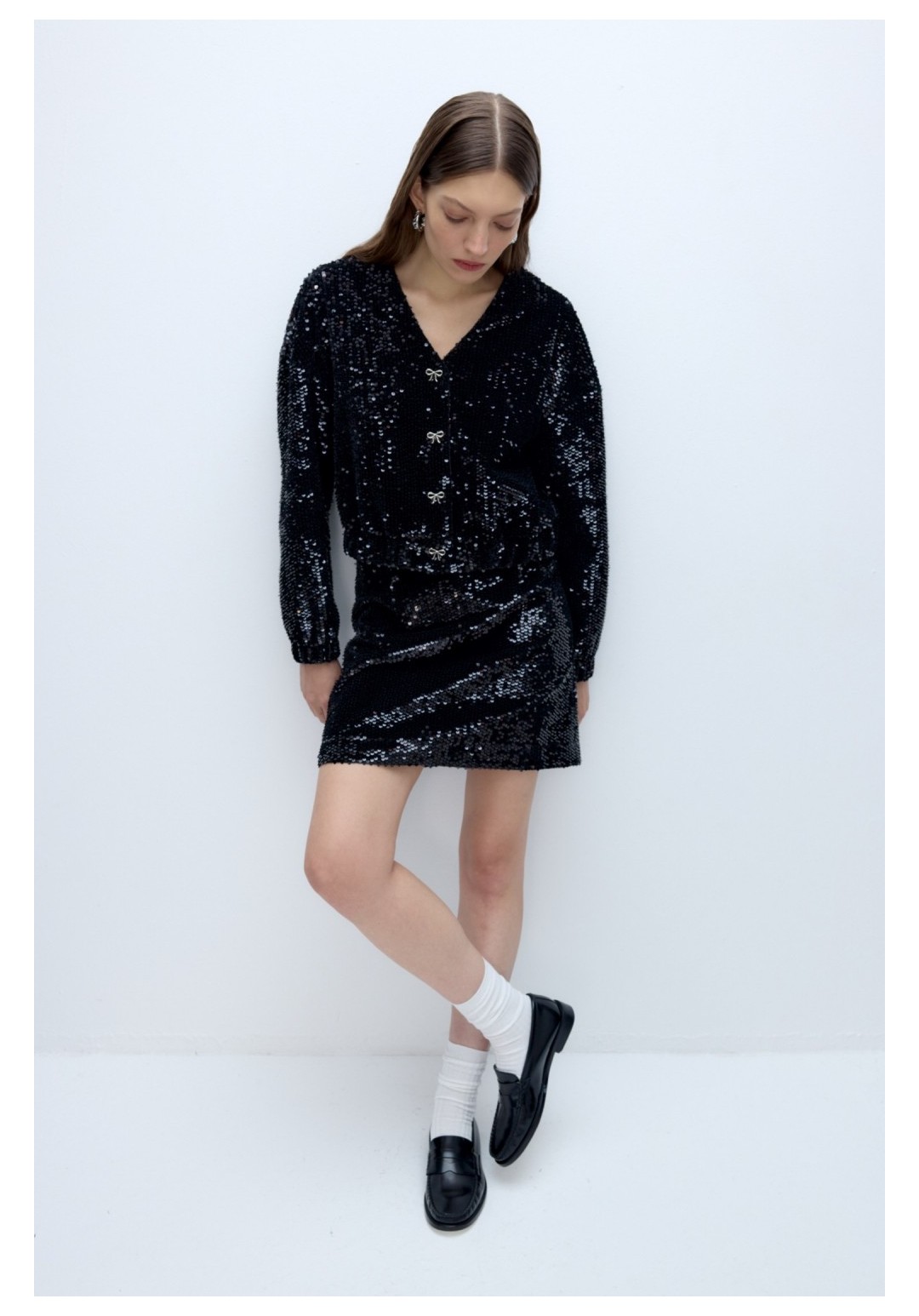 Костюм-двойка из укороченного бомбера и мини-юбки из велюровой ткани в пайетки. Детали: спущенная линия плеча, V-образный вырез горловины переда, застежка на пришивные кнопки и декор в виде бантиков, рукава и низ бомбера на резинке, подкладка. Юбка трапециевидного силуэта, талиевые вытачки, потайная застежка, юбка на подкладке. Длина бомбера по спинке около 48,5 см в размерах 40-46 и около 51,5 см в размерах 48-52. Длина рукава со спущенным плечом около 47+13 см. Длина юбки по боковому шву около 43,5 см в размерах 40-46 и около 46,5 см в размерах 48-52.