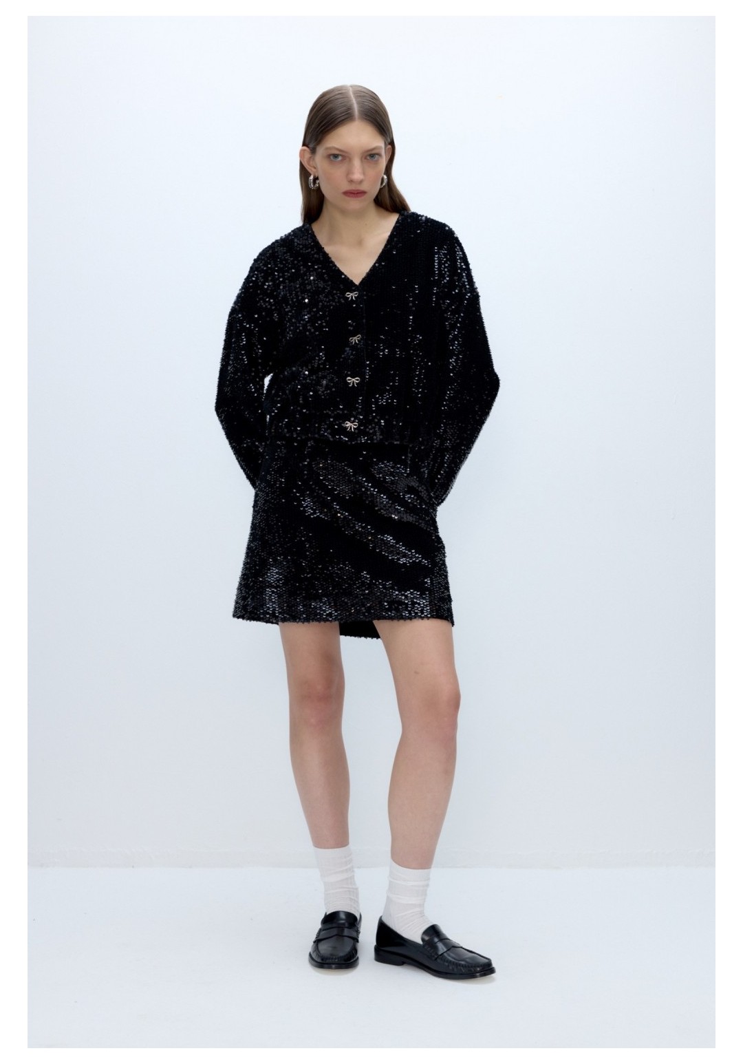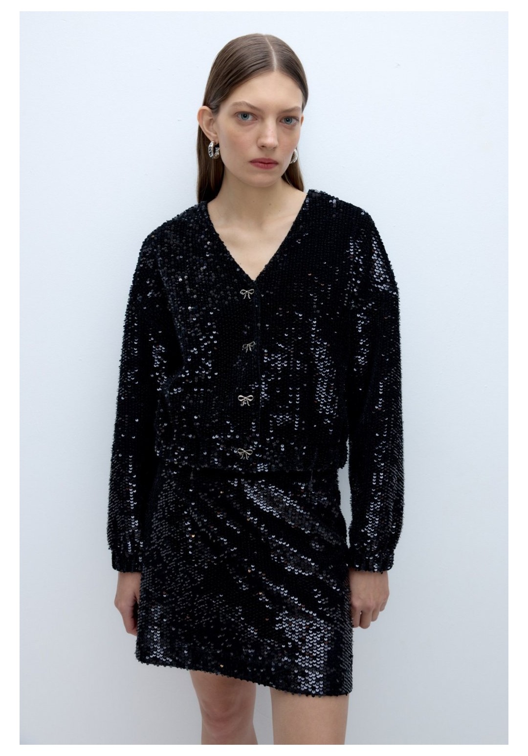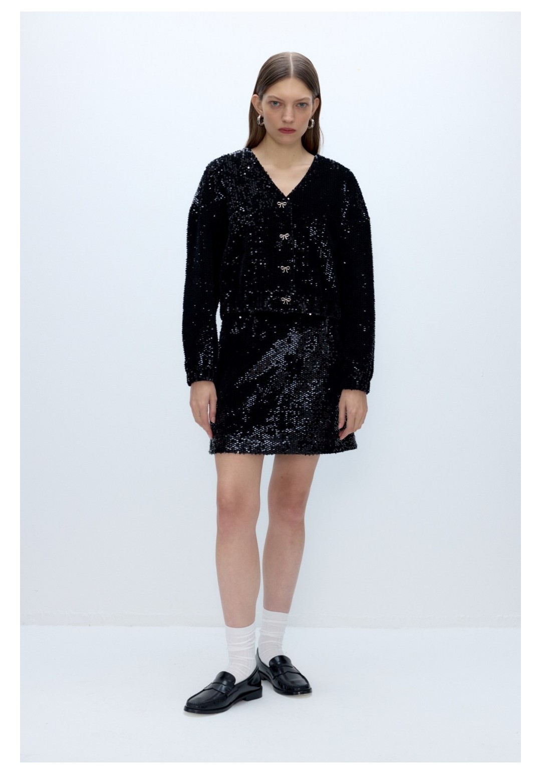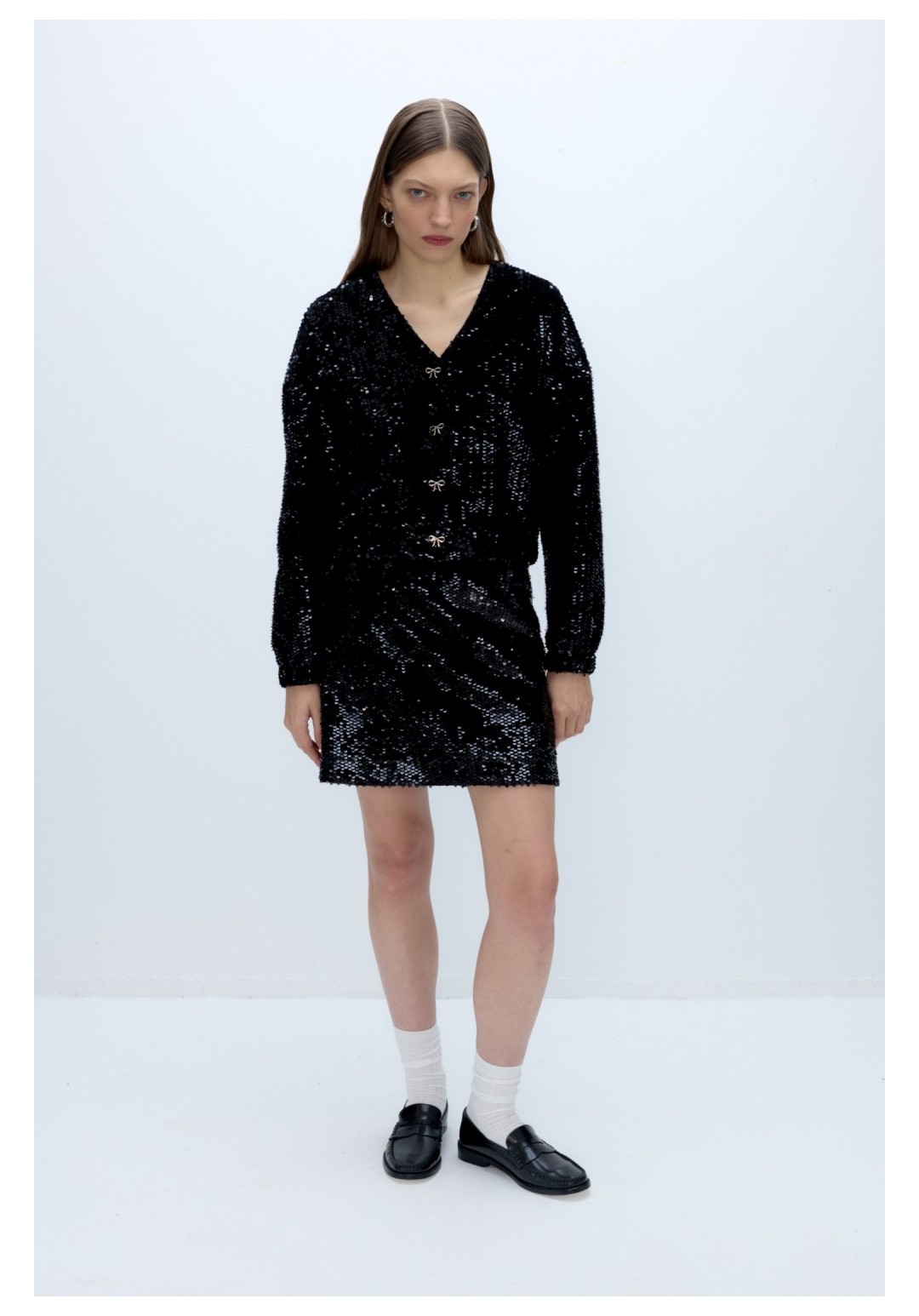 Костюм-двойка из укороченного бомбера и мини-юбки из велюровой ткани в пайетки. Детали: спущенная линия плеча, V-образный вырез горловины переда, застежка на пришивные кнопки и декор в виде бантиков, рукава и низ бомбера на резинке, подкладка. Юбка трапециевидного силуэта, талиевые вытачки, потайная застежка, юбка на подкладке. Длина бомбера по спинке около 48,5 см в размерах 40-46 и около 51,5 см в размерах 48-52. Длина рукава со спущенным плечом около 47+13 см. Длина юбки по боковому шву около 43,5 см в размерах 40-46 и около 46,5 см в размерах 48-52.