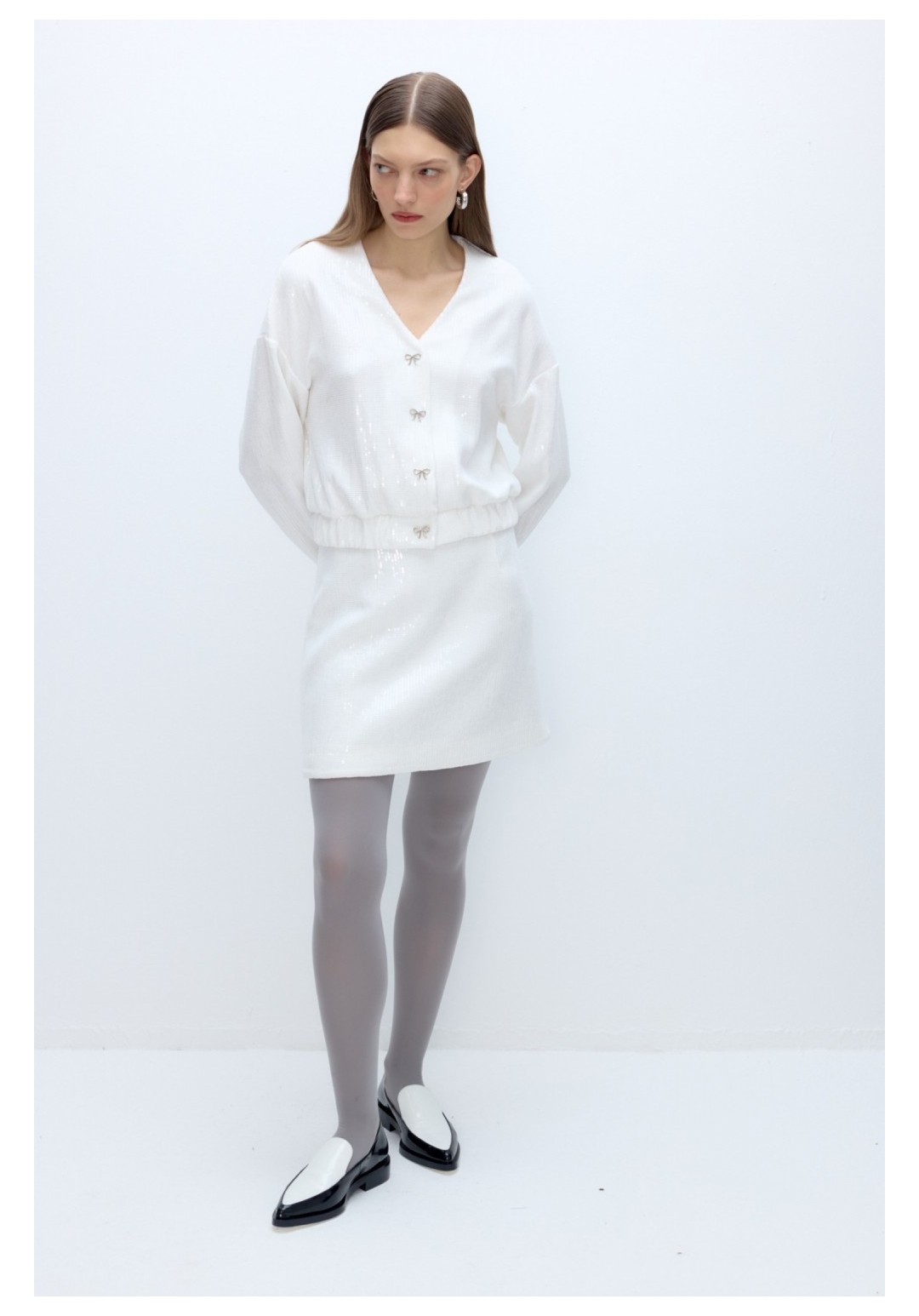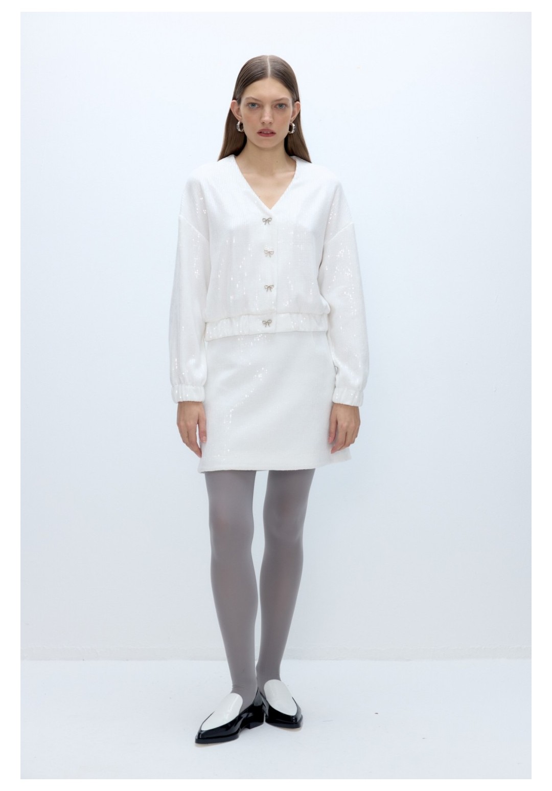Костюм-двойка из укороченного бомбера и мини-юбки из велюровой ткани в пайетки. Детали: спущенная линия плеча, V-образный вырез горловины переда, застежка на пришивные кнопки и декор в виде бантиков, рукава и низ бомбера на резинке, подкладка. Юбка трапециевидного силуэта, талиевые вытачки, потайная застежка, юбка на подкладке. Длина бомбера по спинке около 48,5 см в размерах 40-46 и около 51,5 см в размерах 48-52. Длина рукава со спущенным плечом около 47+13 см. Длина юбки по боковому шву около 43,5 см в размерах 40-46 и около 46,5 см в размерах 48-52.