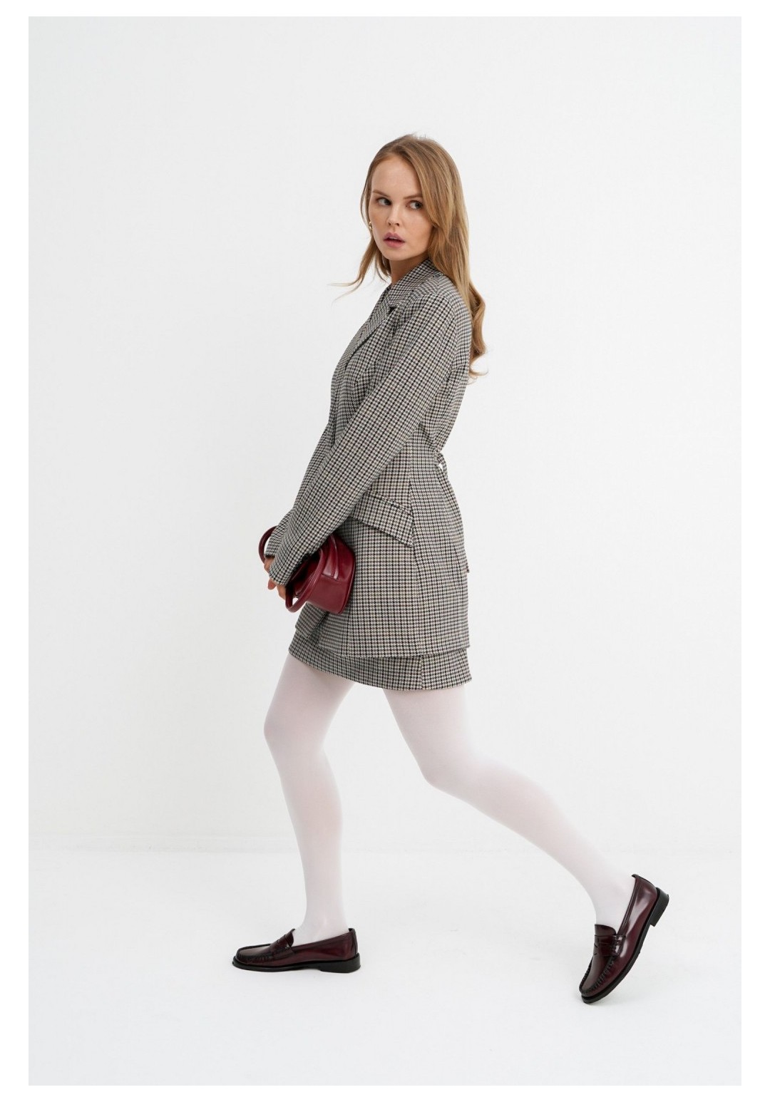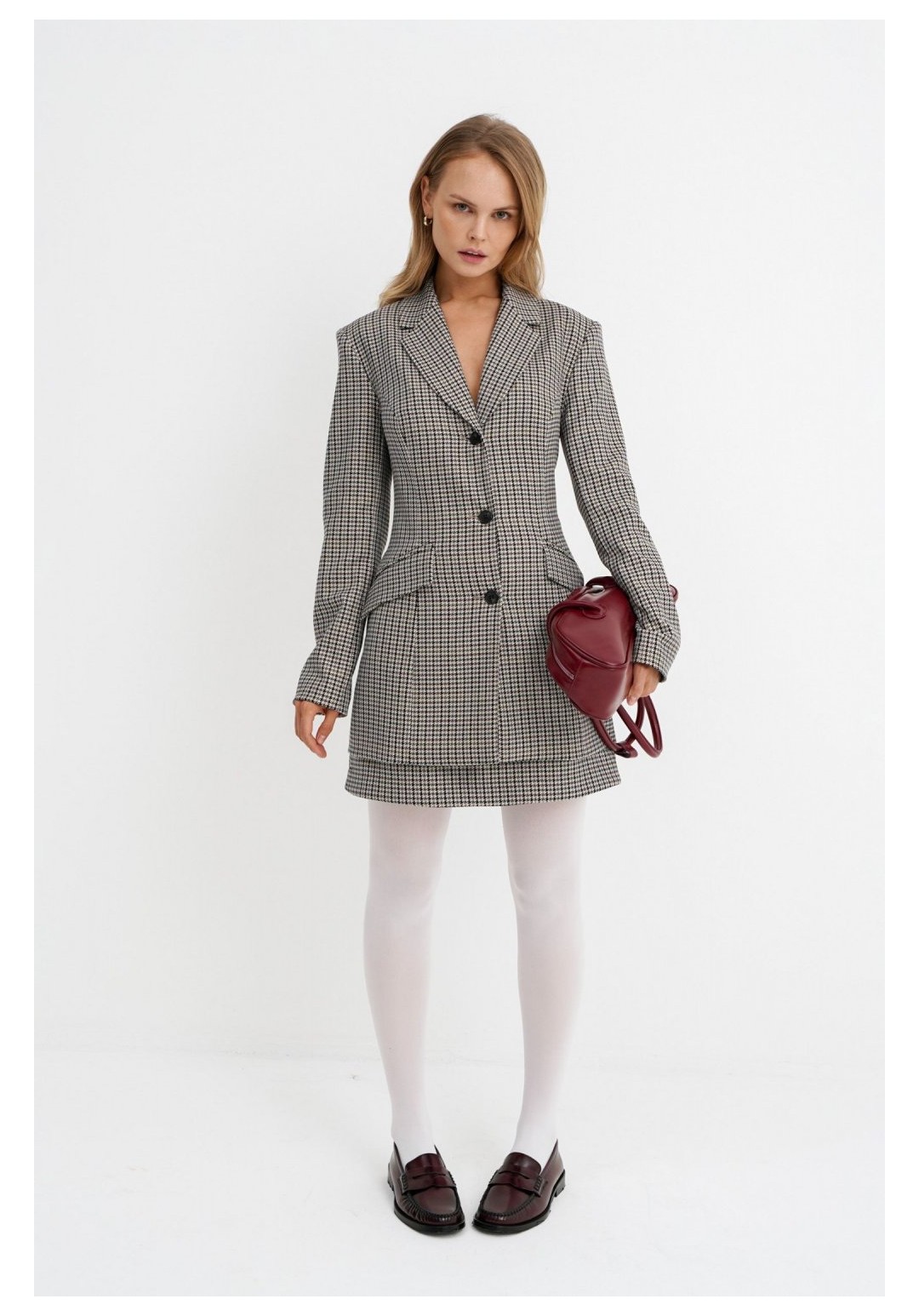 Костюм-двойка из удлиненного приталенного жакета и мини-юбки из текстильной ткани с рисунком гусиная лапка. Детали: пиджачный воротник, перед с функциональными карманами, застежка на петли и пуговицы, рукава втачные двухшовные, спинка с рельефами и регулировкой-завязками по талии. Жакет на подкладке. Юбка трапециевидного силуэта, талиевые вытачки, потайная застежка, юбка на подкладке. Длина жакета по спинке около 75 см в размерах 40-46 и около 78 см в размерах 48-52. Длина рукава около 61 см. Длина юбки по боковому шву около 43 см в размерах 40-46 и около 46 см в размерах 48-52.