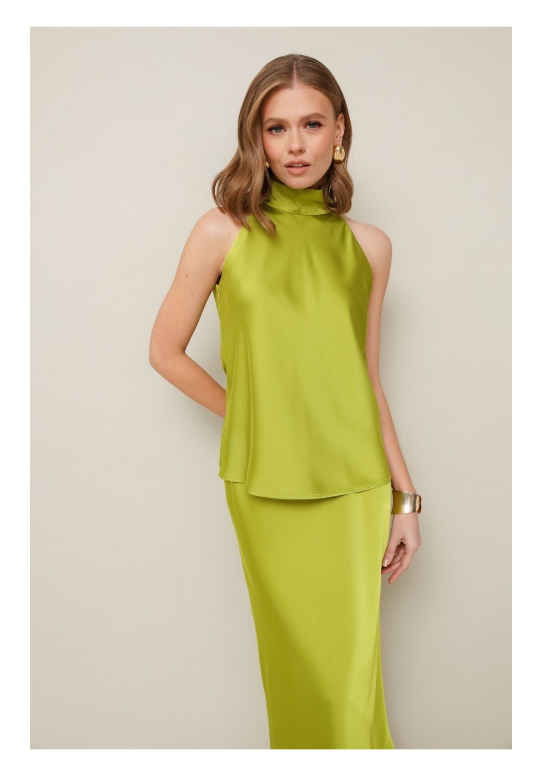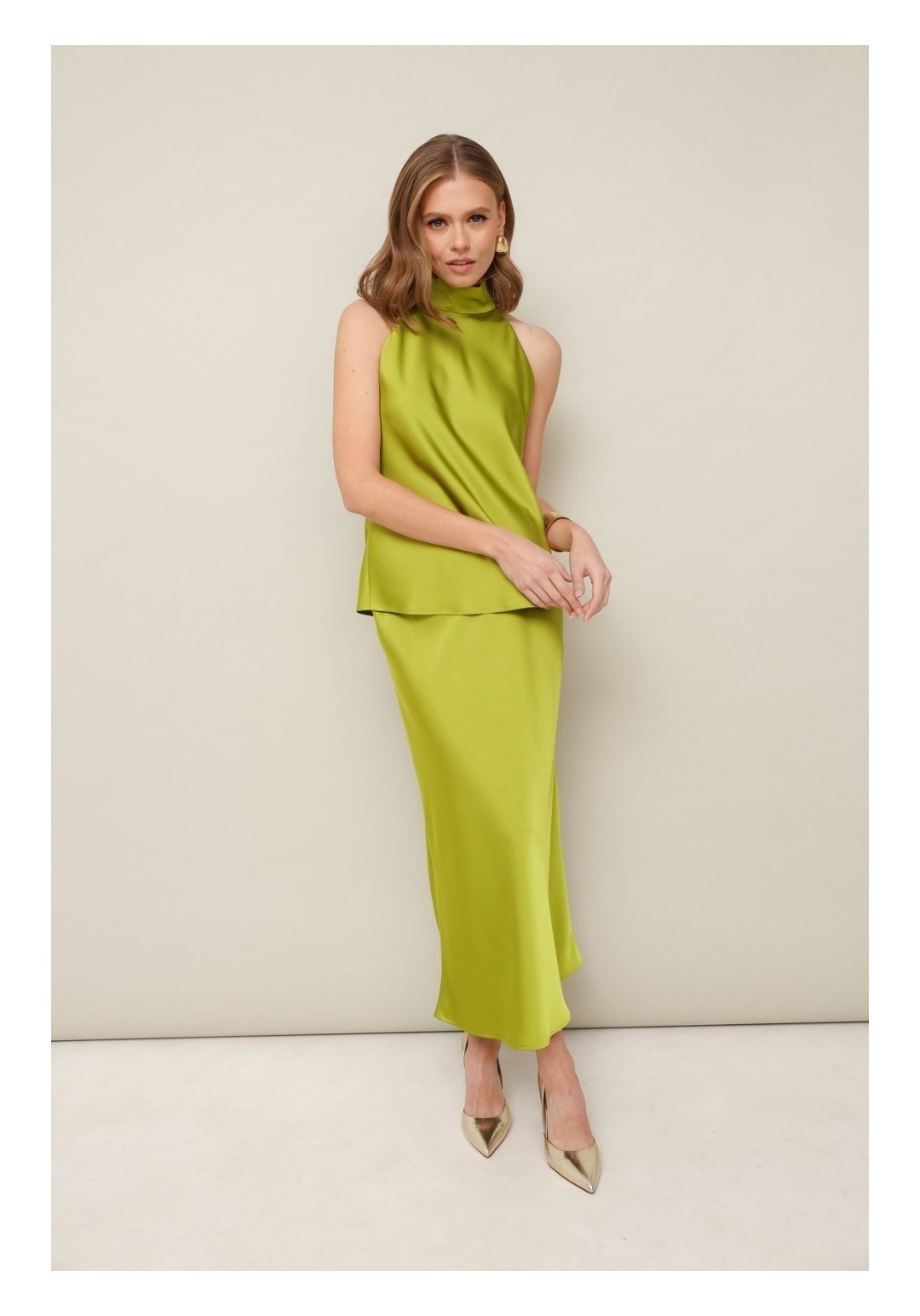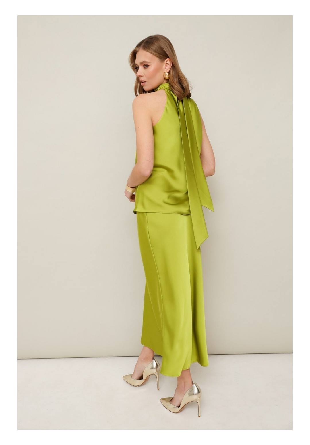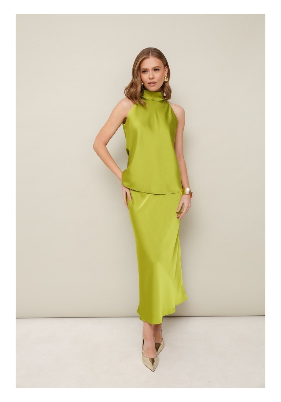 Элегантный 2-предметный костюм, состоящий из блузки и юбки, выполненный из струящейся ткани с благородным матовым блеском. Блузка прямого силуэта с американской проймой, горловина со стойкой, которая переходит в завязывающийся бант. Юбка с кроем по косой в длине миди, пояс на обтачке, застежка в боковом шве на потайную тесьму молнию.